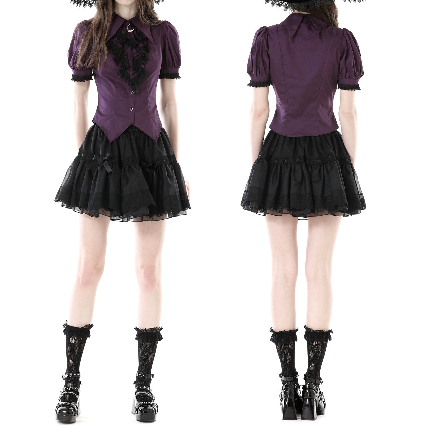 Descubre nuestra elegante camisa lila con mangas cortas y anchas. Esta camisa de estilo gótico y alternativo presenta botones en la parte delantera y una chorrera negra de encaje con un diseño de luna en el cuello. Está confeccionada con una composición de alta calidad: 100% algodón. No te pierdas la oportunidad de añadir esta prenda única a tu colección en nuestra tienda de ropa y accesorios gótica, alternativa y punk en Internet. Completa tu look con esta camisa lila y marca tu estilo con un toque distintivo.