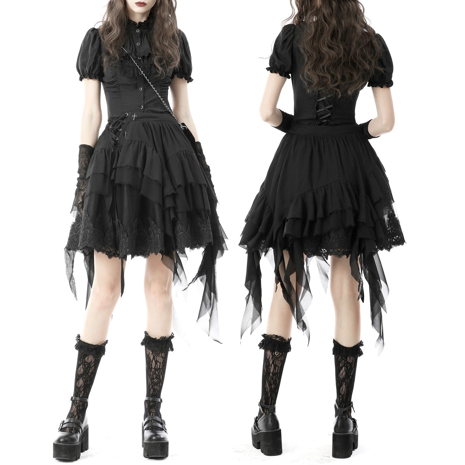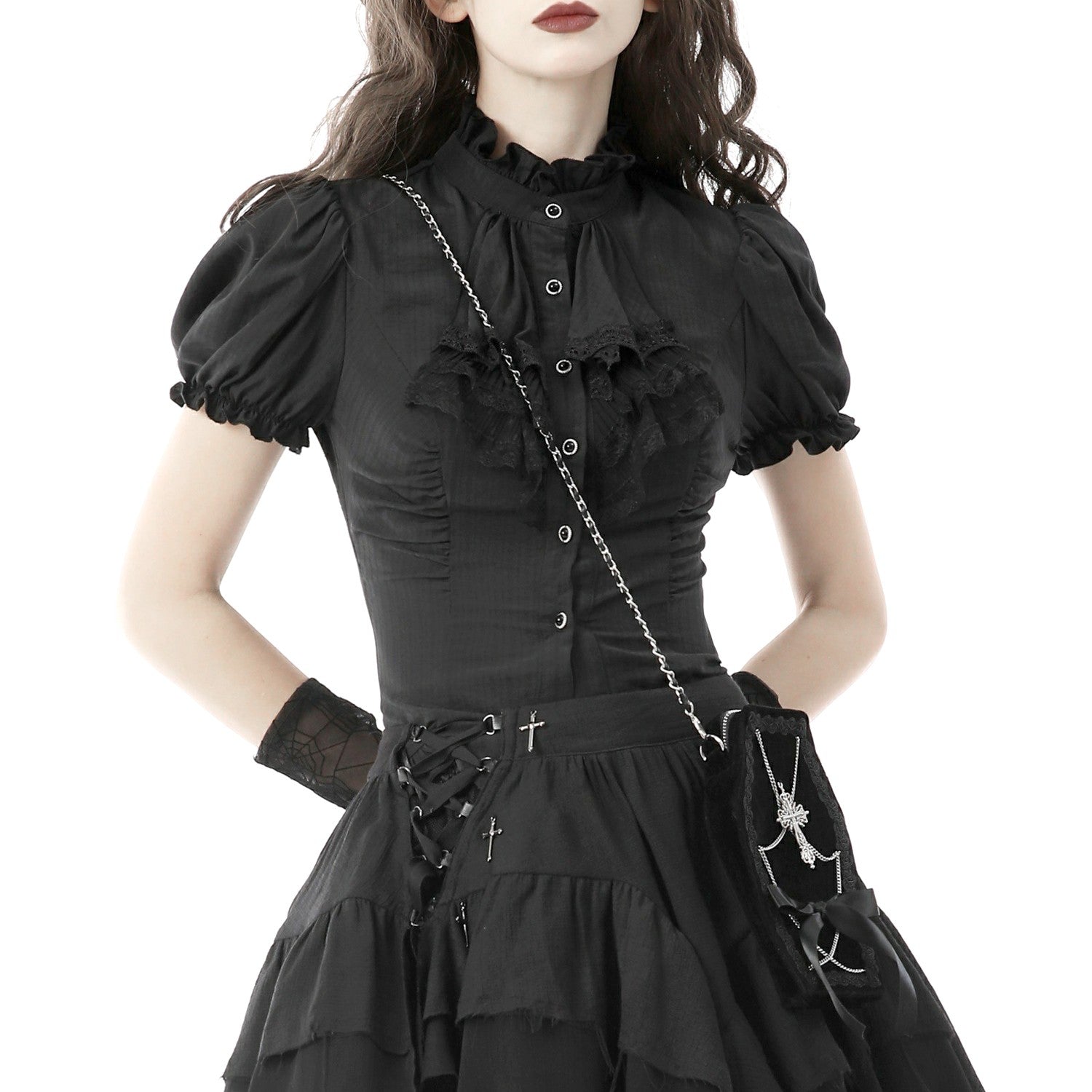 Camisa negra con mangas cortas y anchas. Botones delante y cruzado en la espalda.