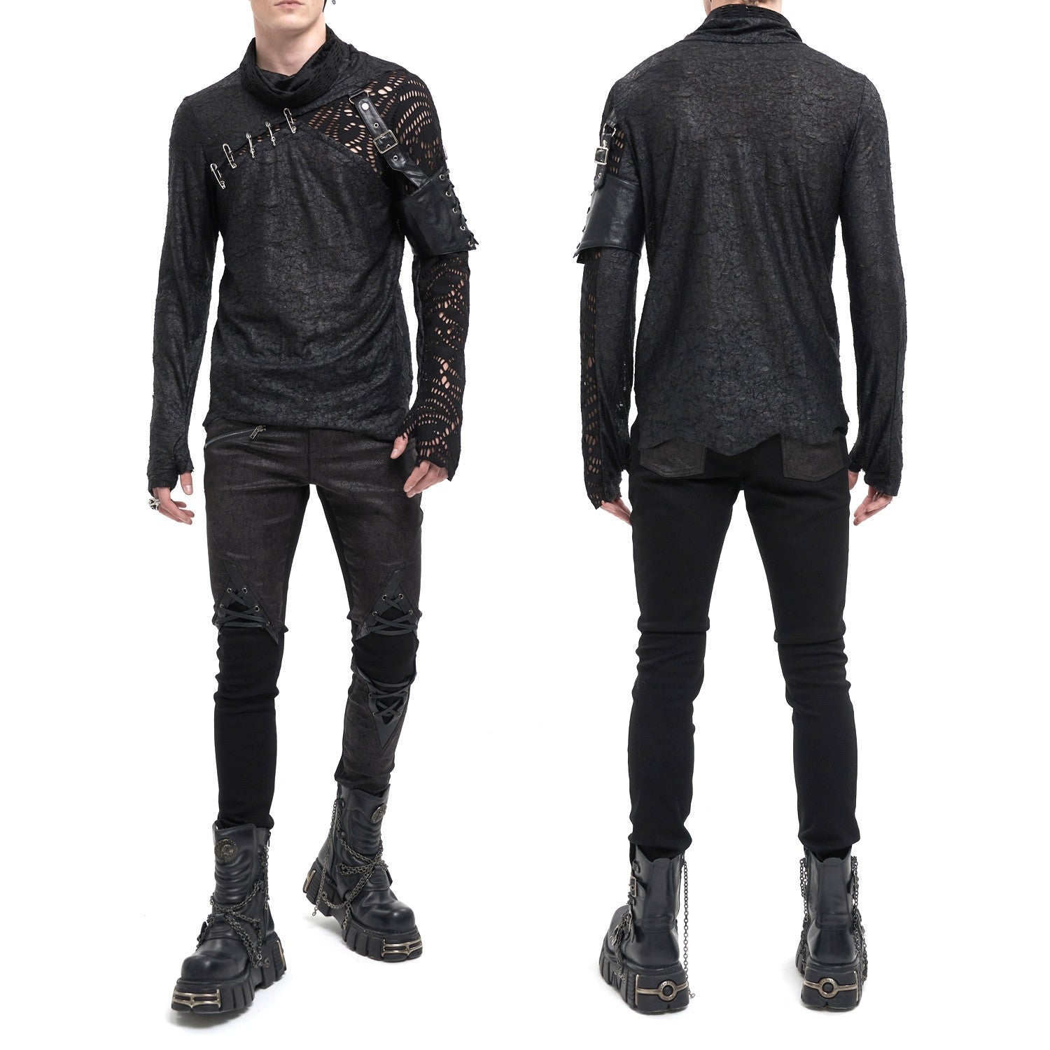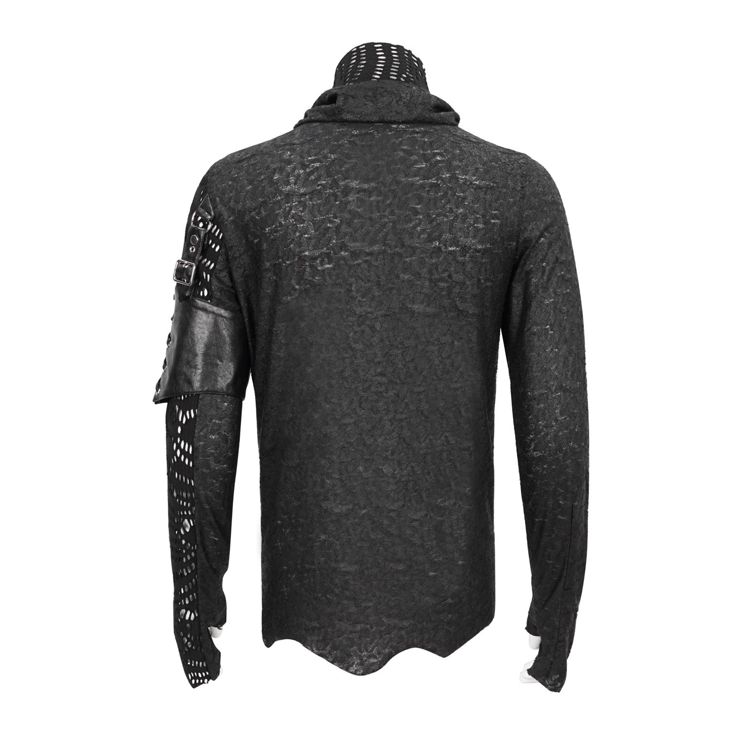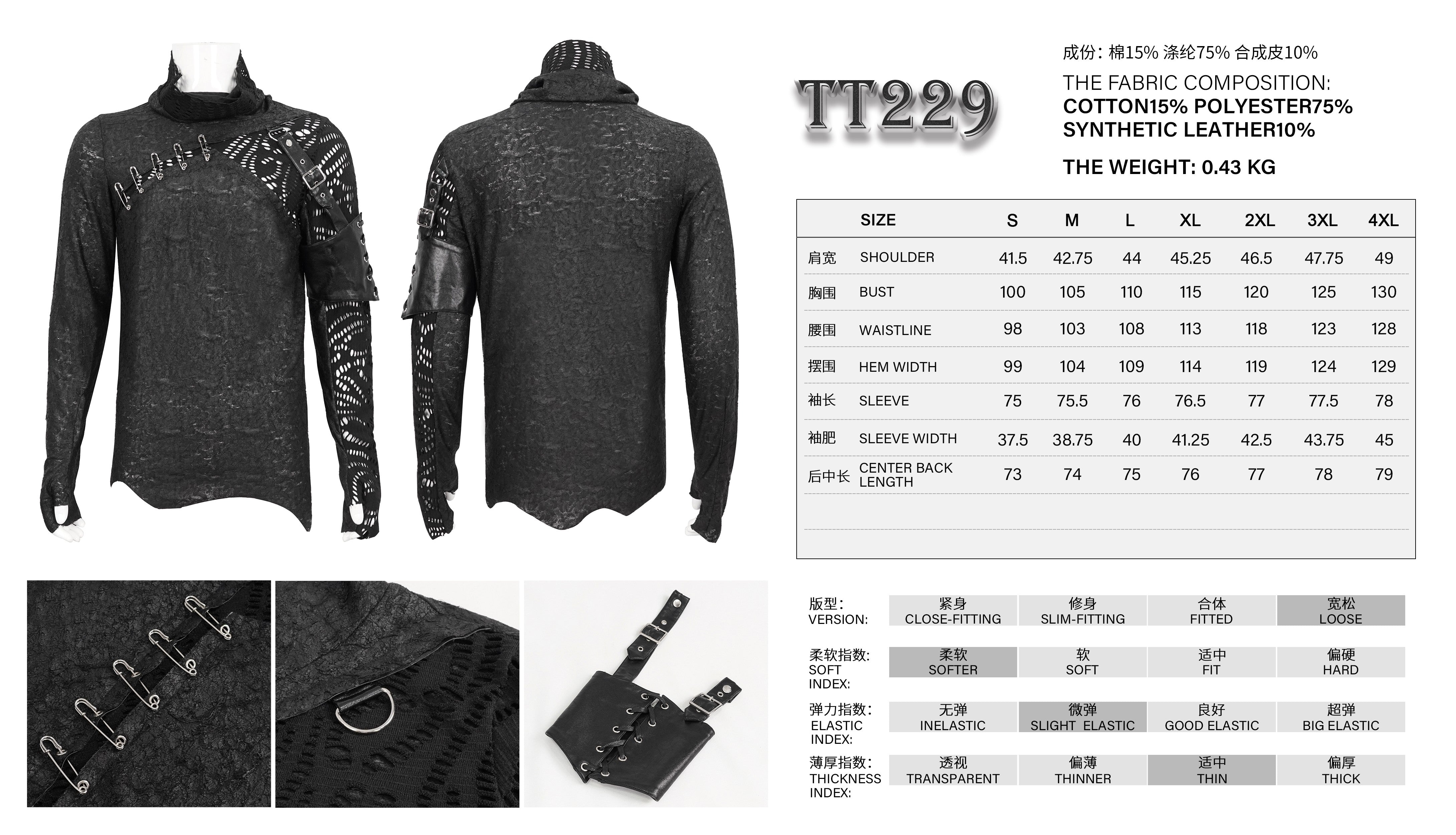 Añade estilo y actitud a tu armario con nuestra camiseta negra y asimétrica para hombre. Su diseño rasgado y manga troquelada, junto con imperdibles decorativos en el pecho, la convierten en una prenda única para tu estilo gótico, alternativo o punk. Además, viene con un brazalete de polipiel para el brazo superior incluido. Está confeccionada con una mezcla de poliéster, algodón y cuero sintético, y las medidas del modelo son: 93cm de pecho, 77cm de cintura, 93.5cm de cadera y 186cm de altura. ¡Compra ahora y haz una declaración de moda!