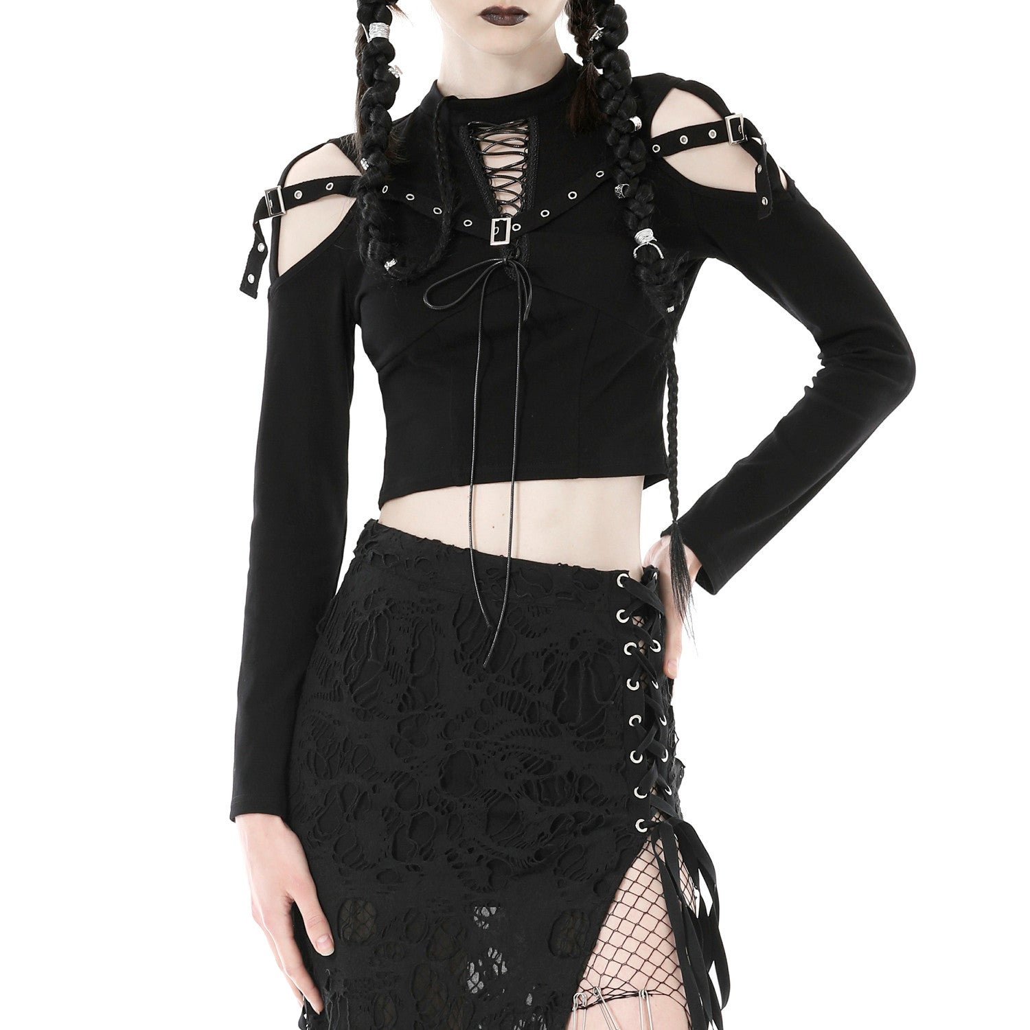 Camiseta corta y negra de estilo gótico con mangas largas y hombros abiertos para un look alternativo y atrevido. Destaca por su original escote con cordones cruzados y detalles de hebillas decorativas en los hombros. Confeccionada en una cómoda mezcla de 95% algodón y 5% spandex para un ajuste perfecto. Una prenda imprescindible para los amantes del estilo punk y gótico. ¡Exprésate con esta camiseta única y atrévete a marcar tendencia!