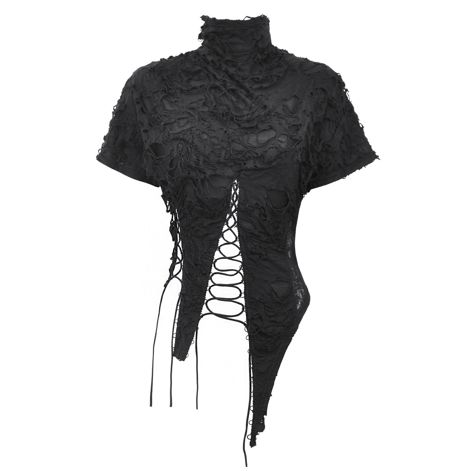 ¡Camiseta exclusiva de la marca Dark in love! Con una tela que se adapta cómodamente al cuerpo, con un estilo desgarrado, un corte asimétrico con cordones cruzados, cuello alto y manga corta. ¿Te atreves con ella? ¡Imagina los increíbles outfits que puedes tener con esta camiseta!