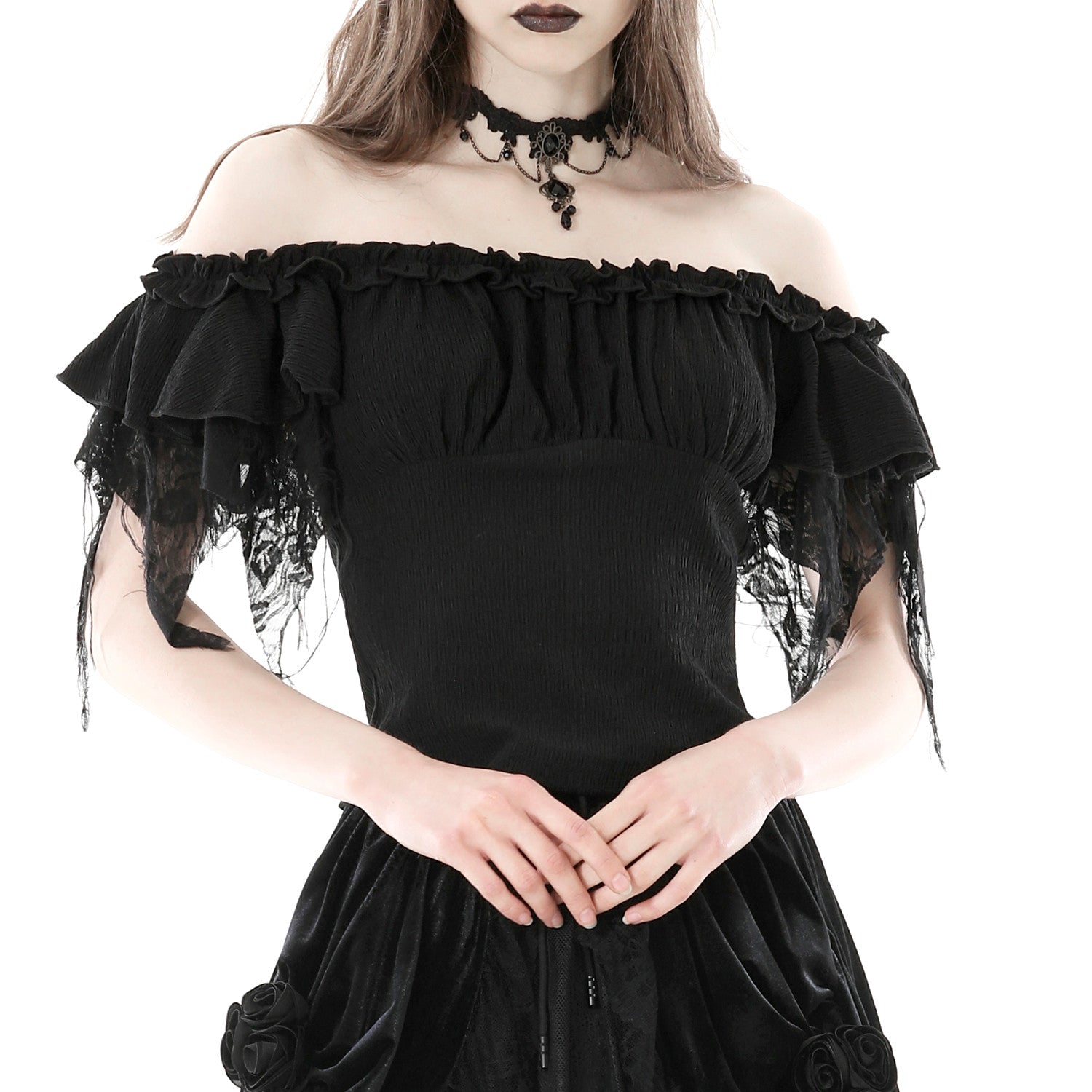 Camiseta corta y negra elegante con un toque atrevido de hombros descubiertos y mangas cortas con encaje, ideal para un estilo gótico, alternativo y punk. Fabricada con una mezcla de alta calidad de 92% poliéster y 8% spandex, esta prenda te ofrece un ajuste cómodo y favorecedor. Destaca tu personalidad única con esta camiseta versátil y sofisticada que será el centro de todas las miradas. ¡Atrévete a expresarte y marcar tendencia con esta impresionante camiseta de diseño exclusivo!