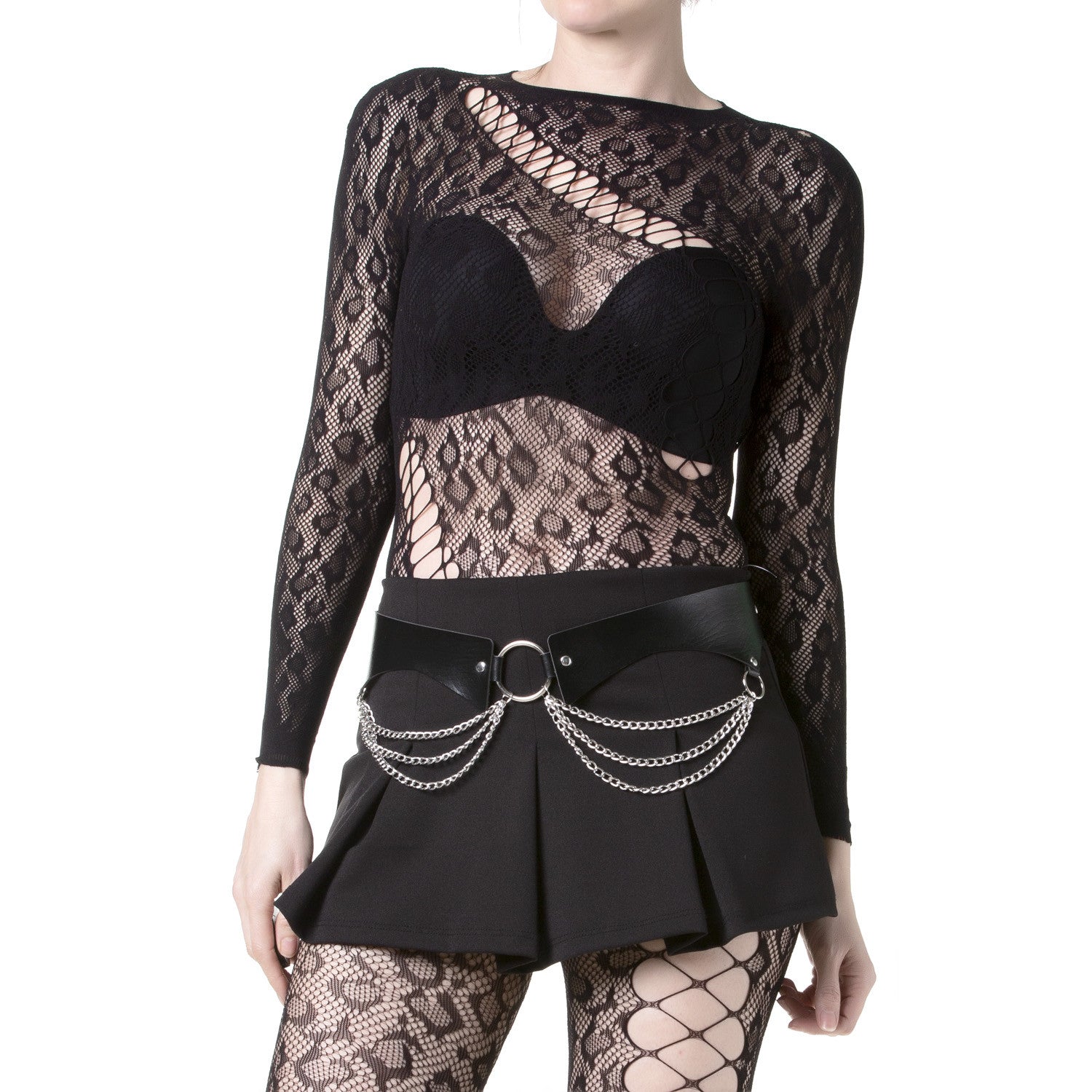Descubre nuestro catsuit asimétrico y elástico de rejilla en negro con un provocativo diseño de leopardo. Este atrevido atuendo se adapta a una variedad de tallas y estilos. ¡Viste con confianza! Las medidas de la modelo en las fotos son 88 cm de busto, 72 cm de cintura, 99 cm de cadera y 170 cm de altura. Explora este catsuit asimétrico imprescindible en nuestra tienda en línea de moda gótica, alternativa y punk.