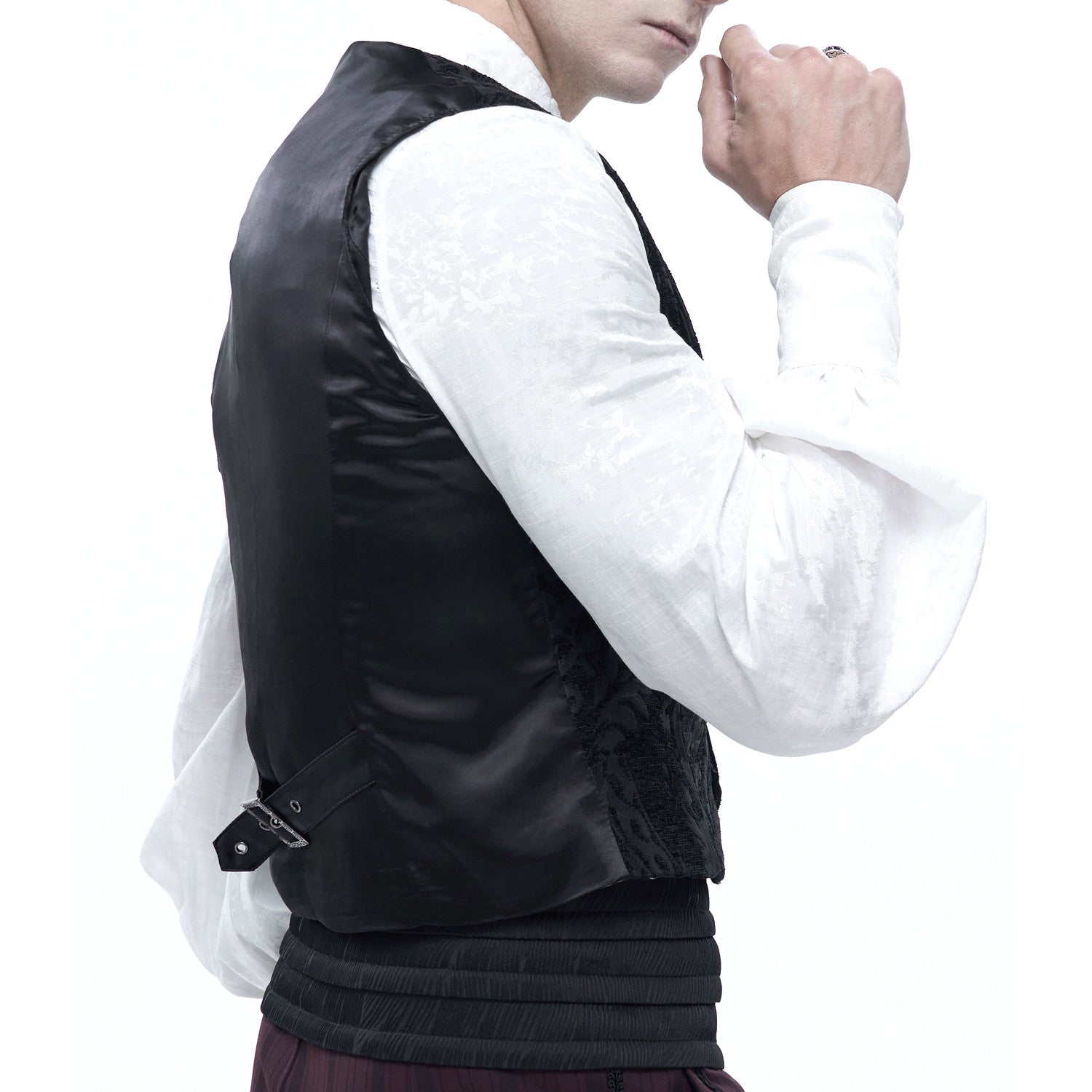 Este chaleco negro es la pieza ideal para un look sofisticado. Presenta botones frontales, una hebilla decorativa en la espalda y está confeccionado con satén en la parte trasera y brocado en la parte delantera, lo que le da un toque de distinción.