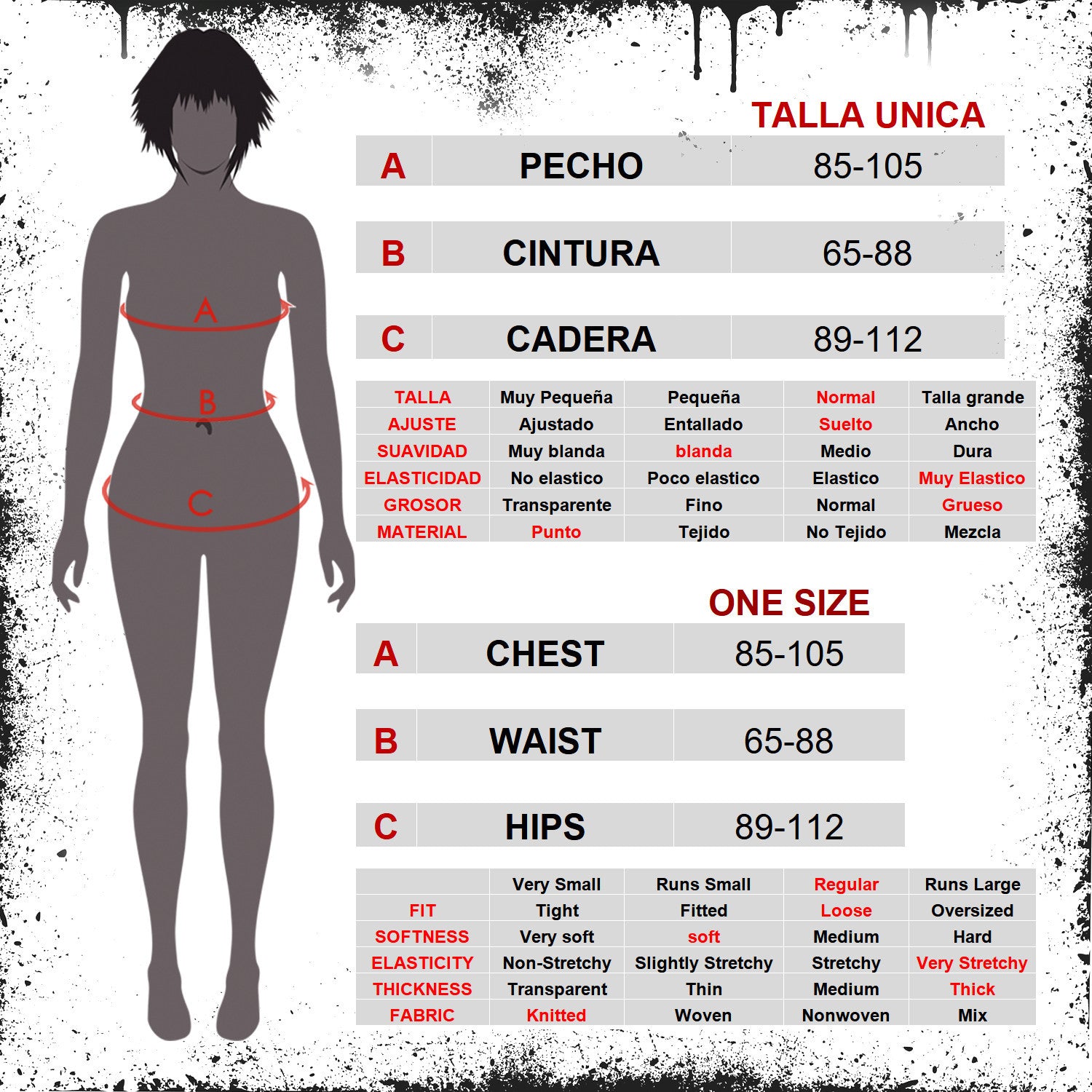 Medidas de la modelo: 88 cm de pecho, 72 cm de cintura, 99 cm de cadera, 170 cm de altura.