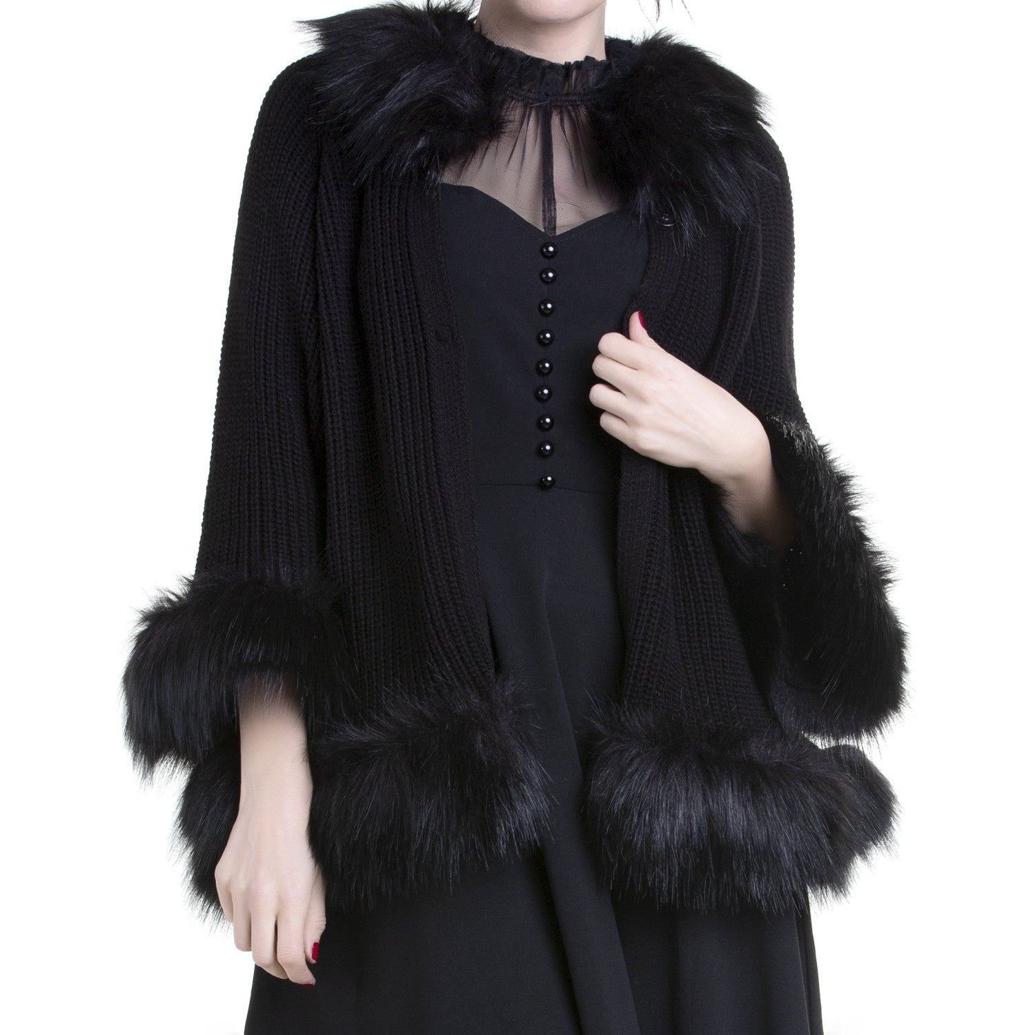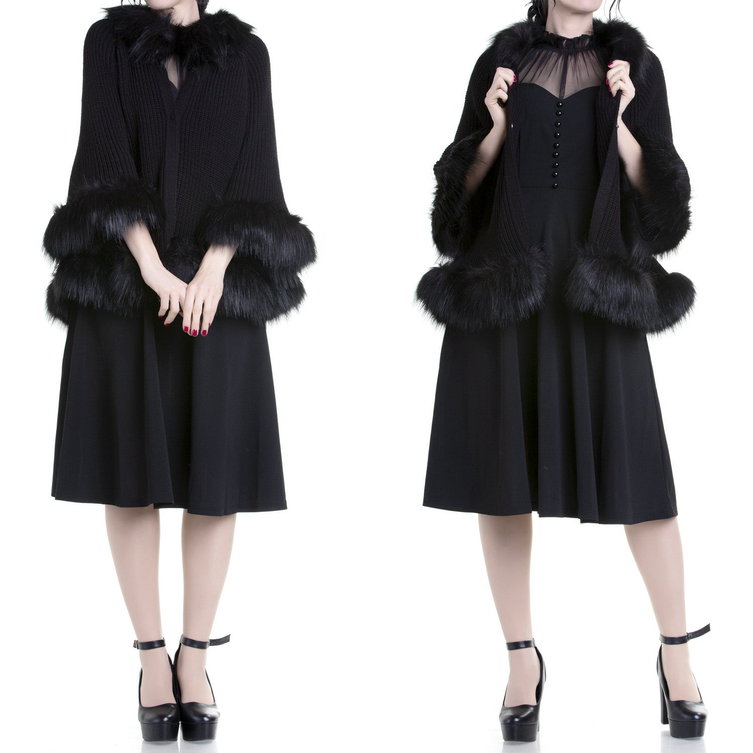 ¡Realza tu estilo gótico y alternativo con nuestra elegante chaqueta tipo capa o poncho en negro! Esta prenda abierta presenta un diseño elegante con pelo artificial en los bordes para un toque distintivo.