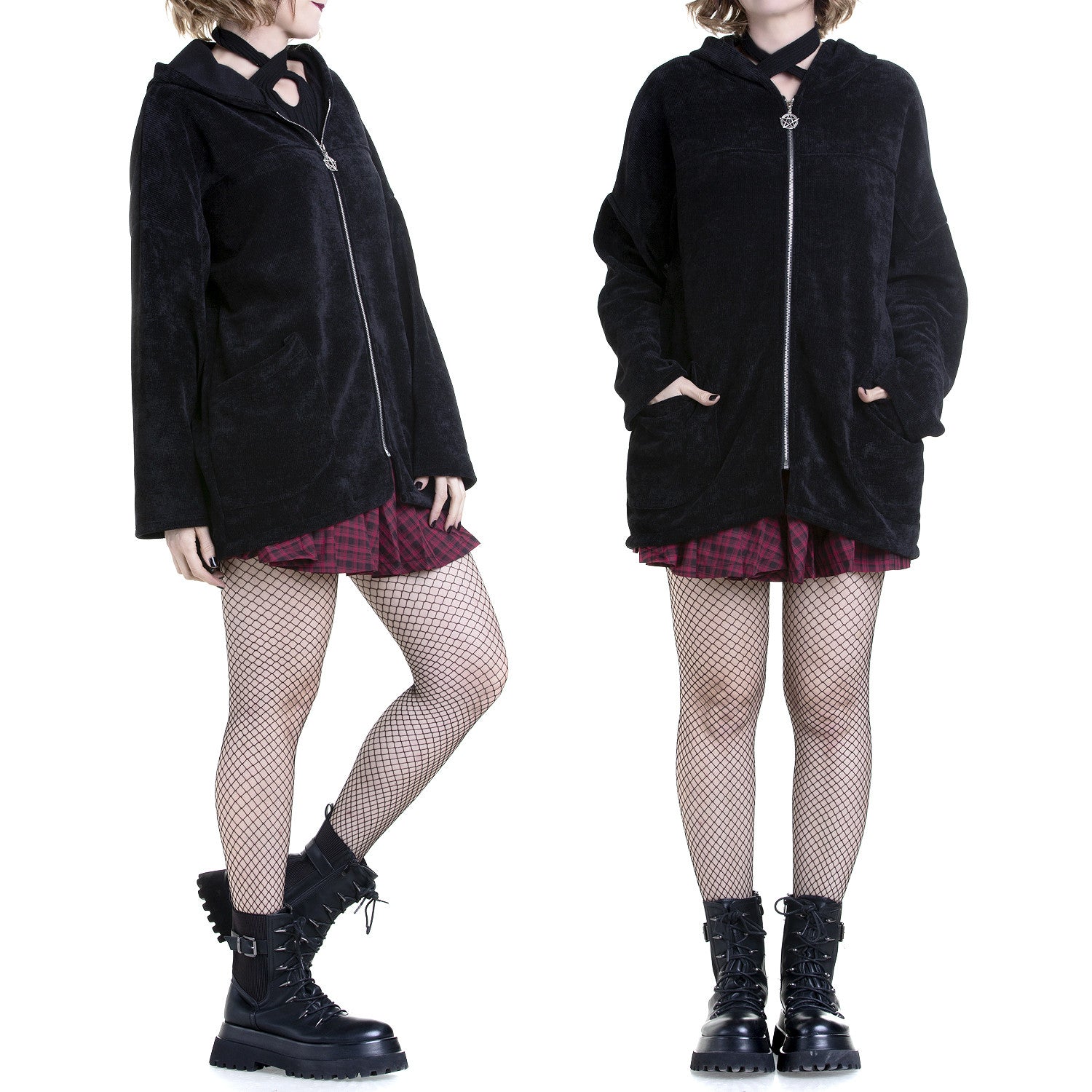 Descubre nuestra chaqueta negra y holgada con capucha, prácticos bolsillos y una cremallera frontal destacada con un pentagrama. Esta prenda esencial no solo encarna el estilo gótico, alternativo y punk, sino que también ofrece comodidad y versatilidad. Las medidas de la modelo de las fotos son 88 cm de busto, 72 cm de cintura, 99 cm de cadera y 170 cm de altura. Con una composición del 95% de poliéster y 5% de elastán, esta chaqueta fusiona moda y confort. Haz una declaración audaz y única en la escena gótica con esta chaqueta que combina el misterio oscuro con un toque contemporáneo.