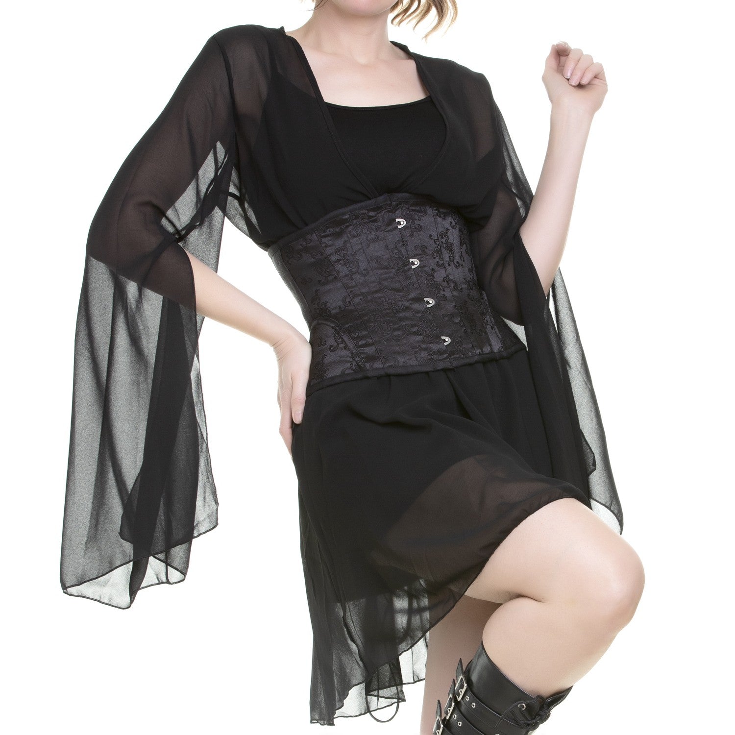 Corsé bajo pecho negro con 14 varillas de metal y 4 enganches metálicos delante, tapeta posterior y cordón trenzado para ajustar.