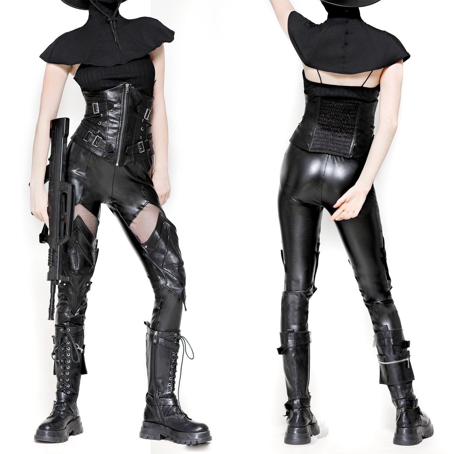 Corsé con espalda elástica, Confeccionado con polipiel, cierre de cremallera frontal, laterales con cordones y hebillas.
