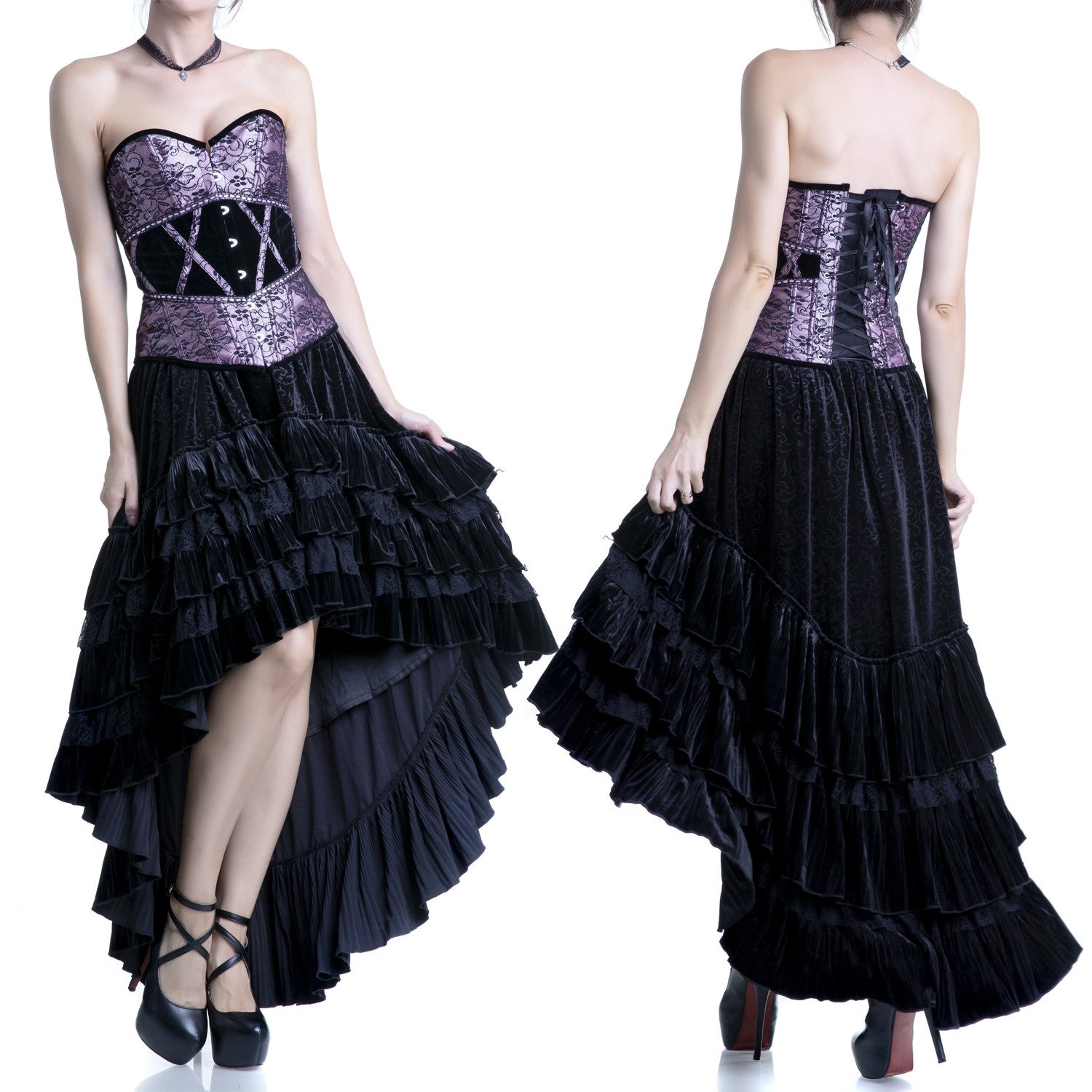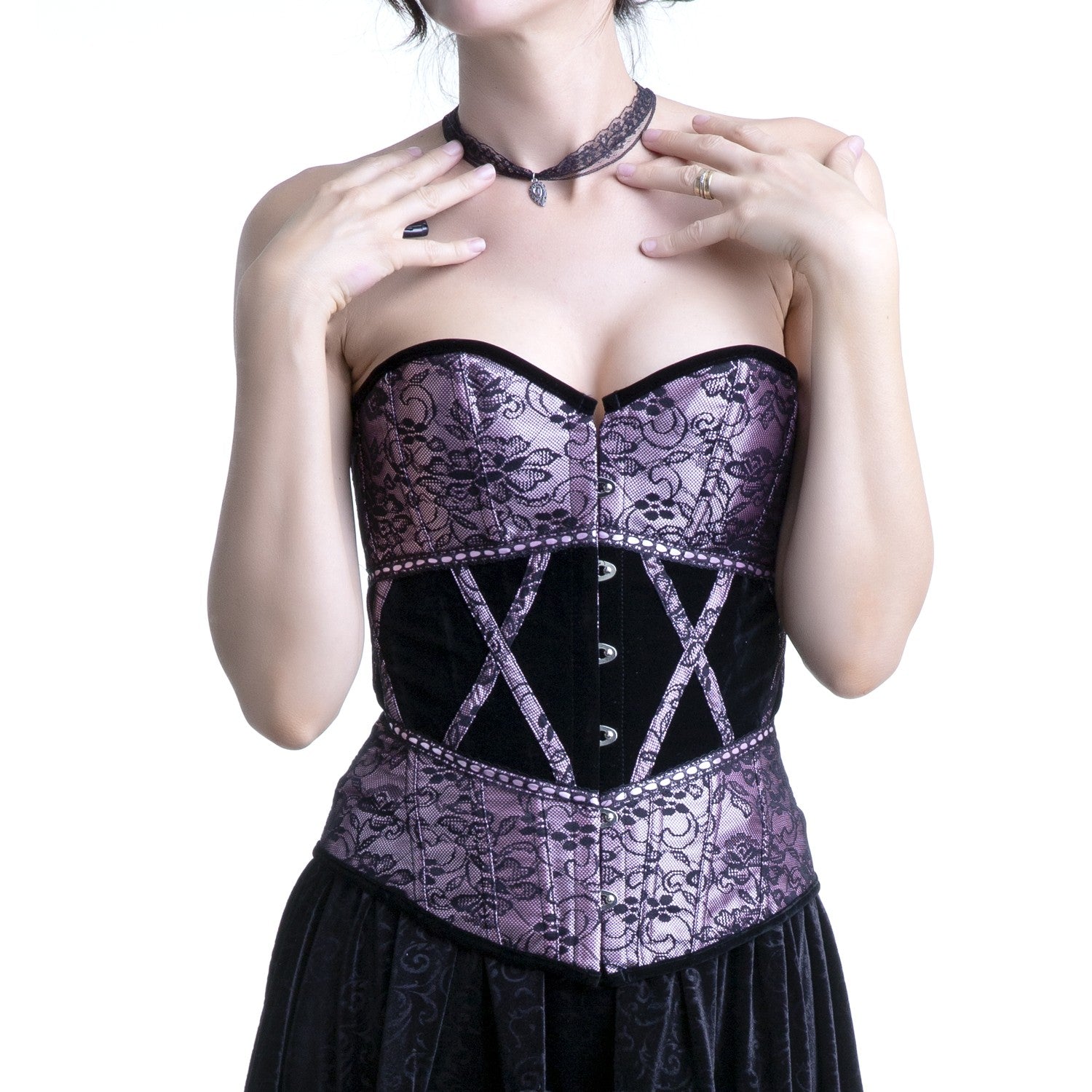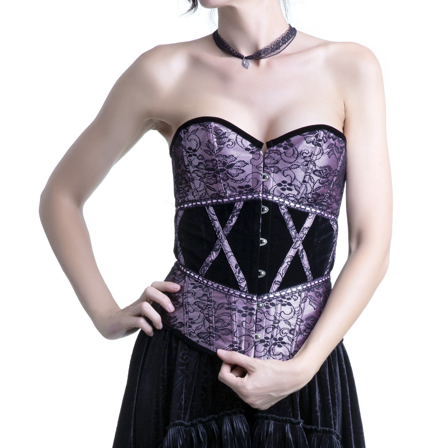 Corsé rosa y negro con terciopelo, tiene cierre detrás cruzado con tapeta para que no se vea la espalda, varillas de plástico.