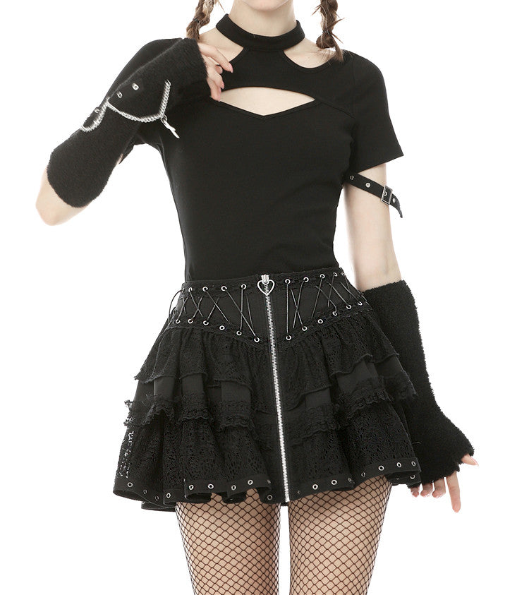 Falda corta de estilo gótico, con volantes en capas, y detalles metálicos