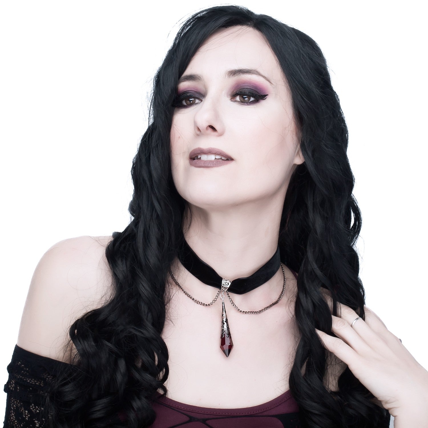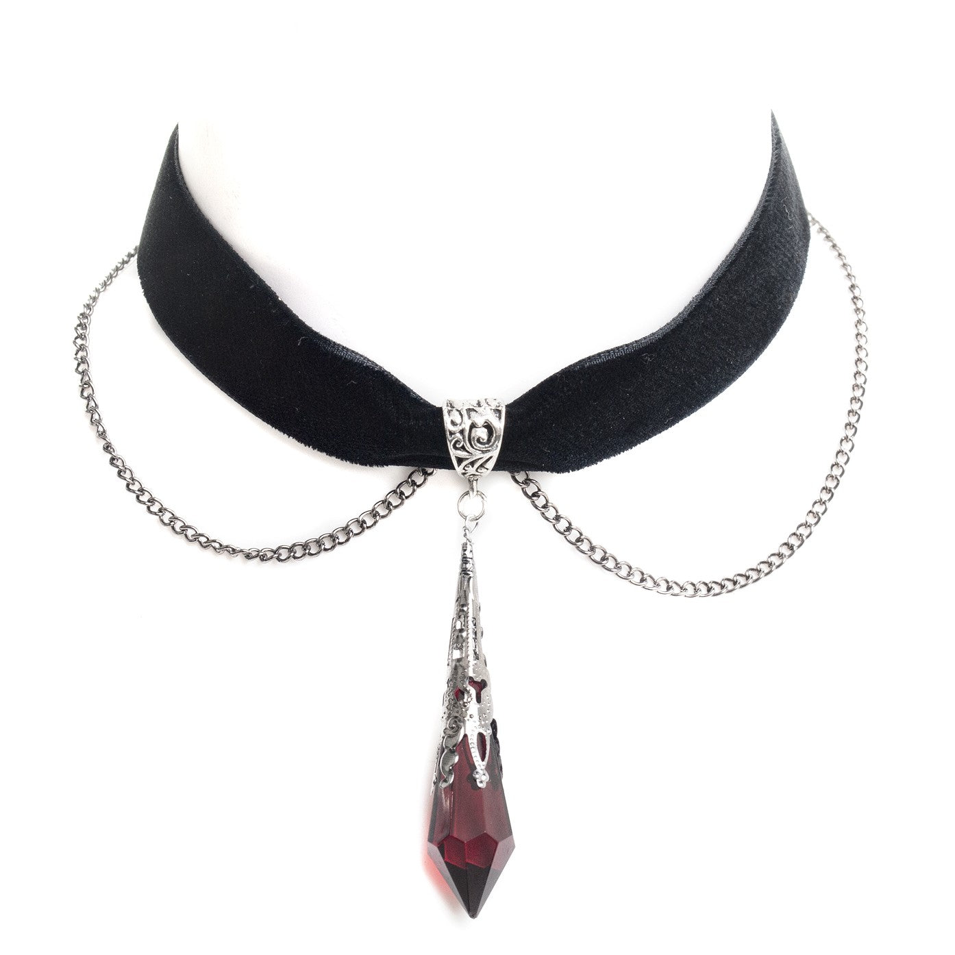 Gargantilla de terciopelo con péndulo rojo y cadena. Diseño elegante totalmente artesanal.