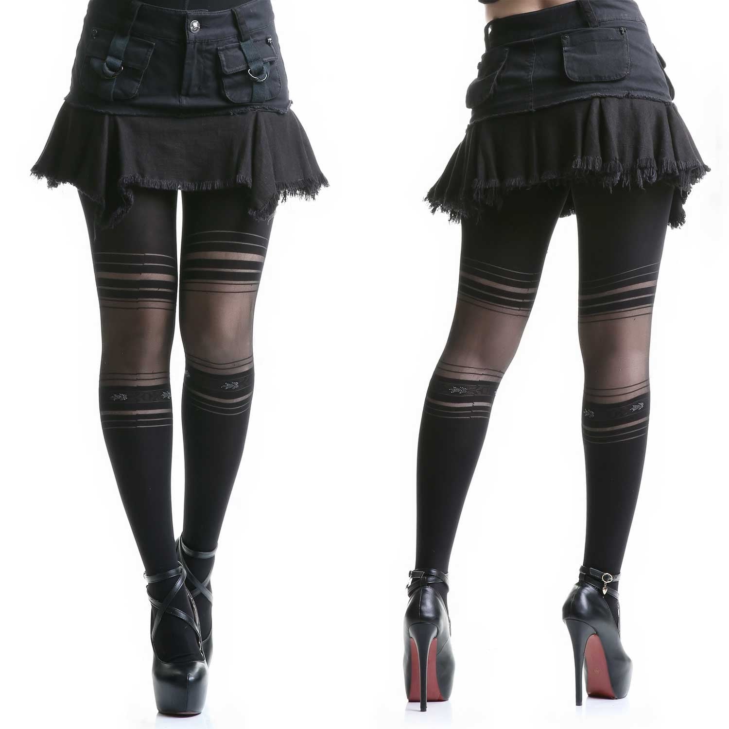 Medias negras con rayas horizontales en la cadera y rodeando las rodillas. Rodillas semitransparentes.