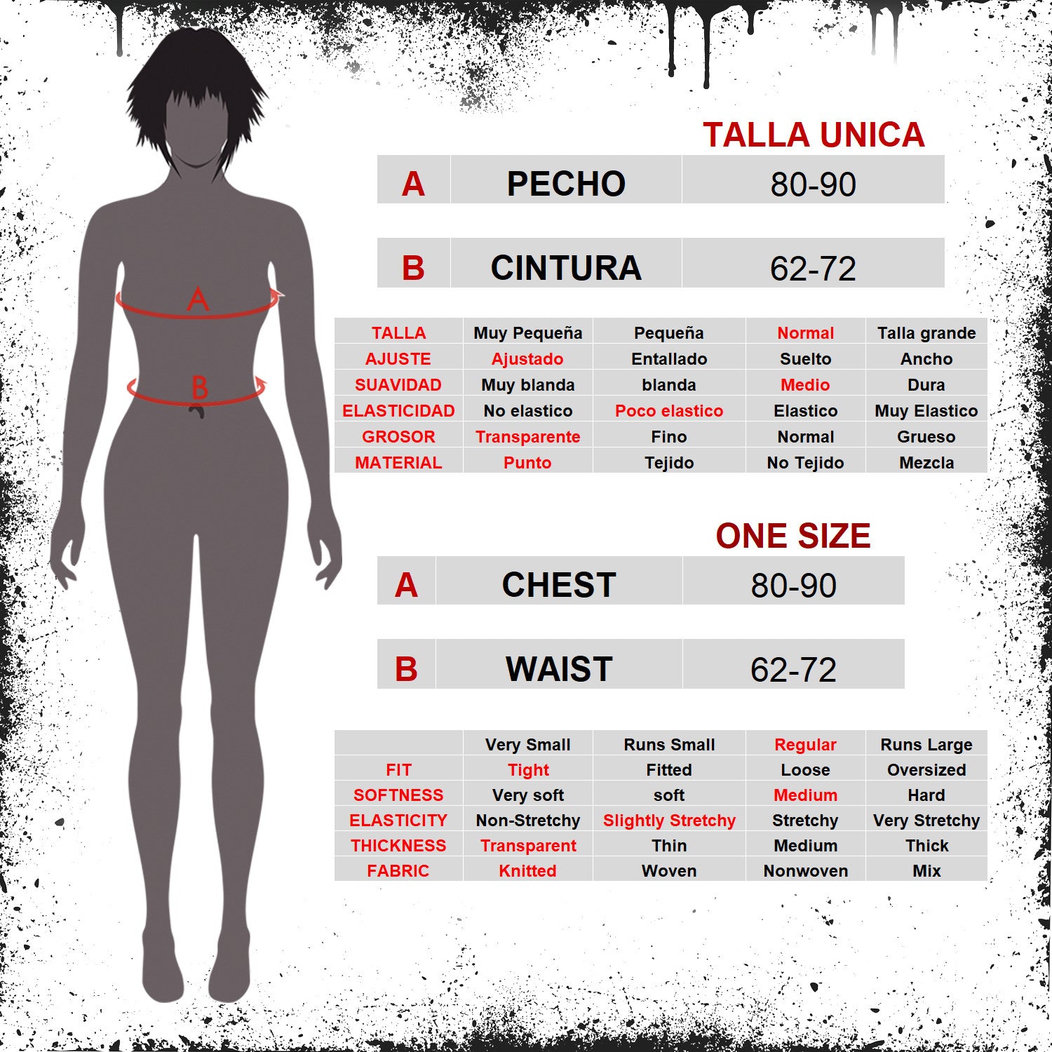 - Medidas de la modelo: 86 cm de busto, 72 cm de cintura, 100 cm de cadera. Altura: 170 cm.
