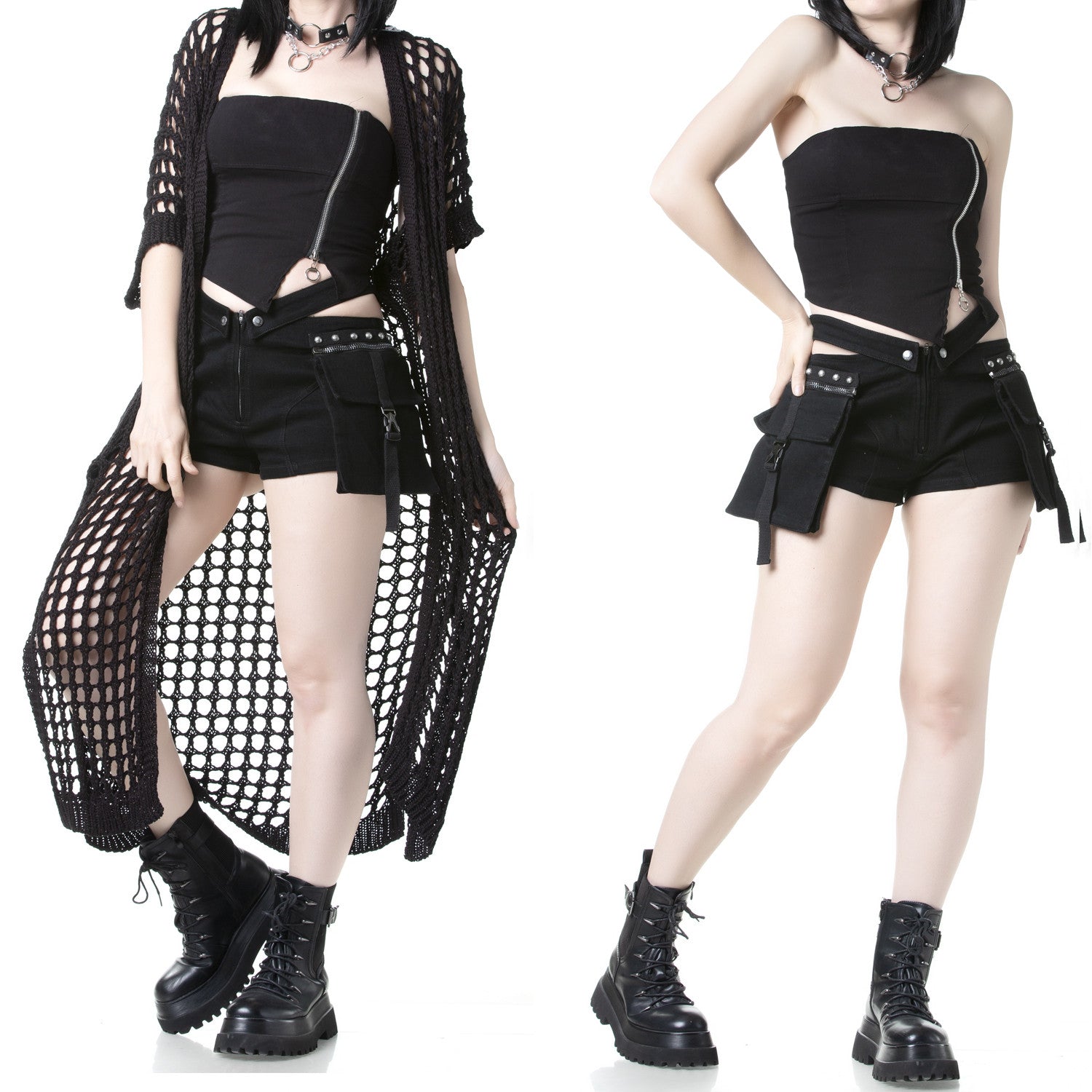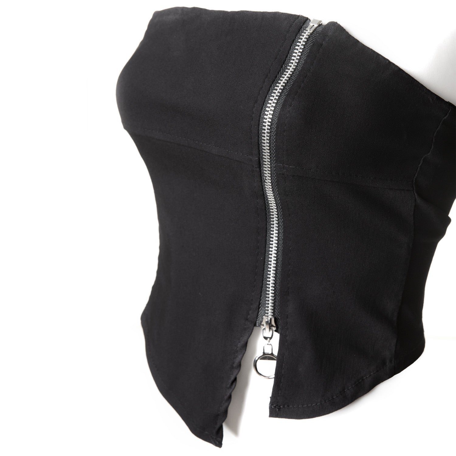 Top negro asimétrico con cremallera frontal. Sin mangas ni tirantes, ideal para un look gótico y alternativo. Medidas modelo: 86-72-100 cm. Altura: 170 cm. Composición: 77% viscosa, 20% nylon, 3% elastán.