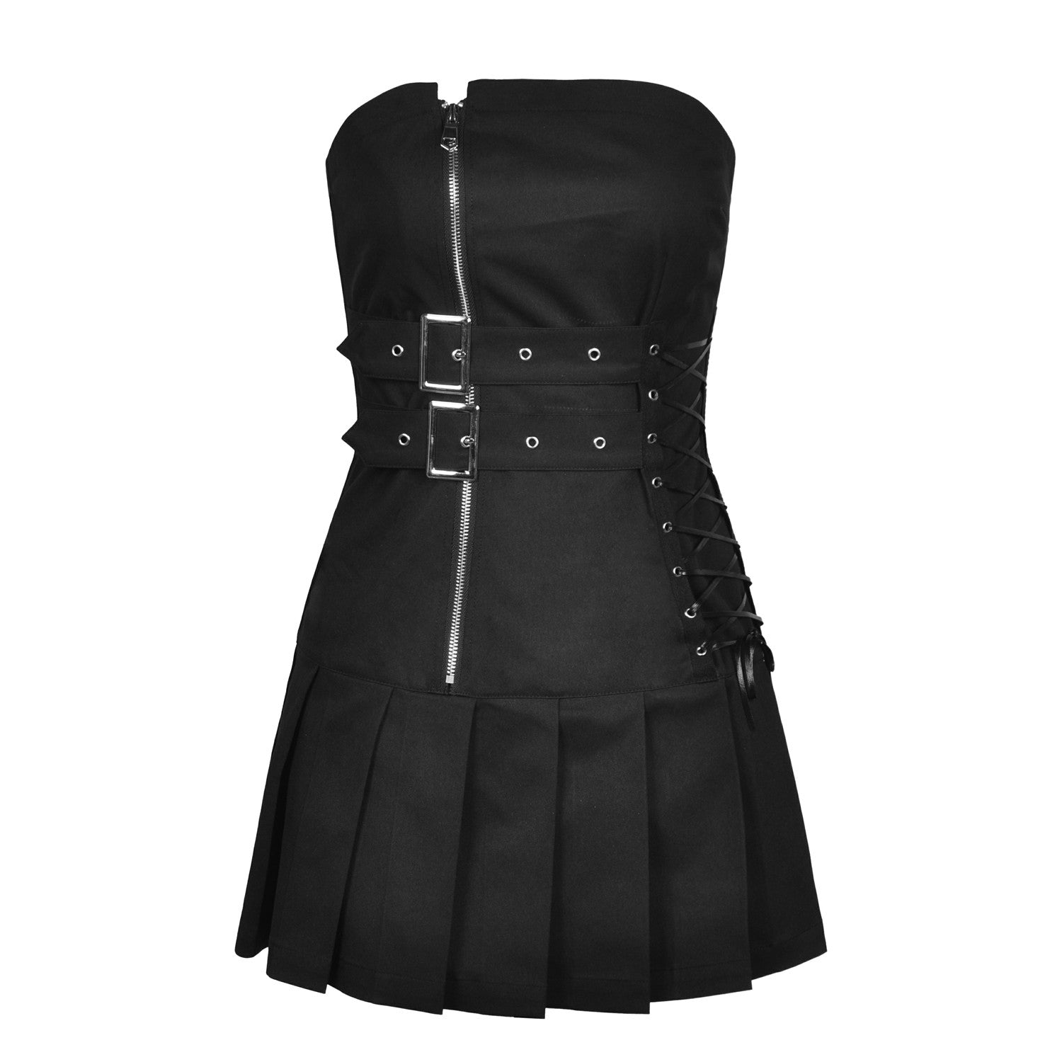 Destaca con nuestro elegante vestido asimétrico negro, imprescindible para la moda gótica y alternativa. Presenta un diseño corto y atrevido con un detalle cruzado en un lado, realzado con hebillas y una cremallera para un toque de rebeldía. Este vestido asimétrico está fabricado con un 70% de poliéster y un 30% de T400 para un ajuste cómodo y duradero.