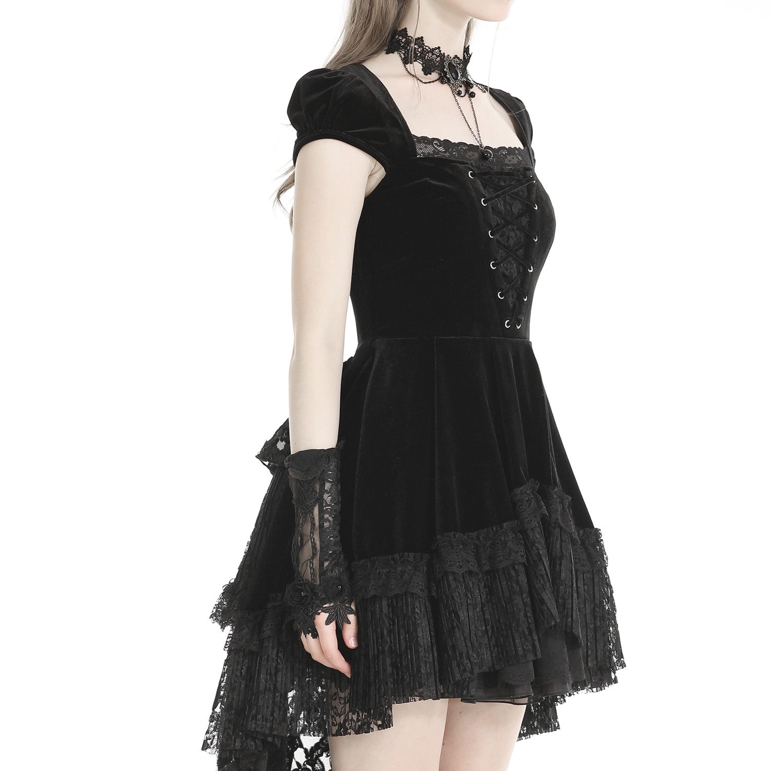 este precioso vestido de terciopelo es una verdadera joya! Corto por delante y largo por detrás, combinado con encaje para darle un toque especial. Perfecto para lucir cómoda y elegante a la vez.