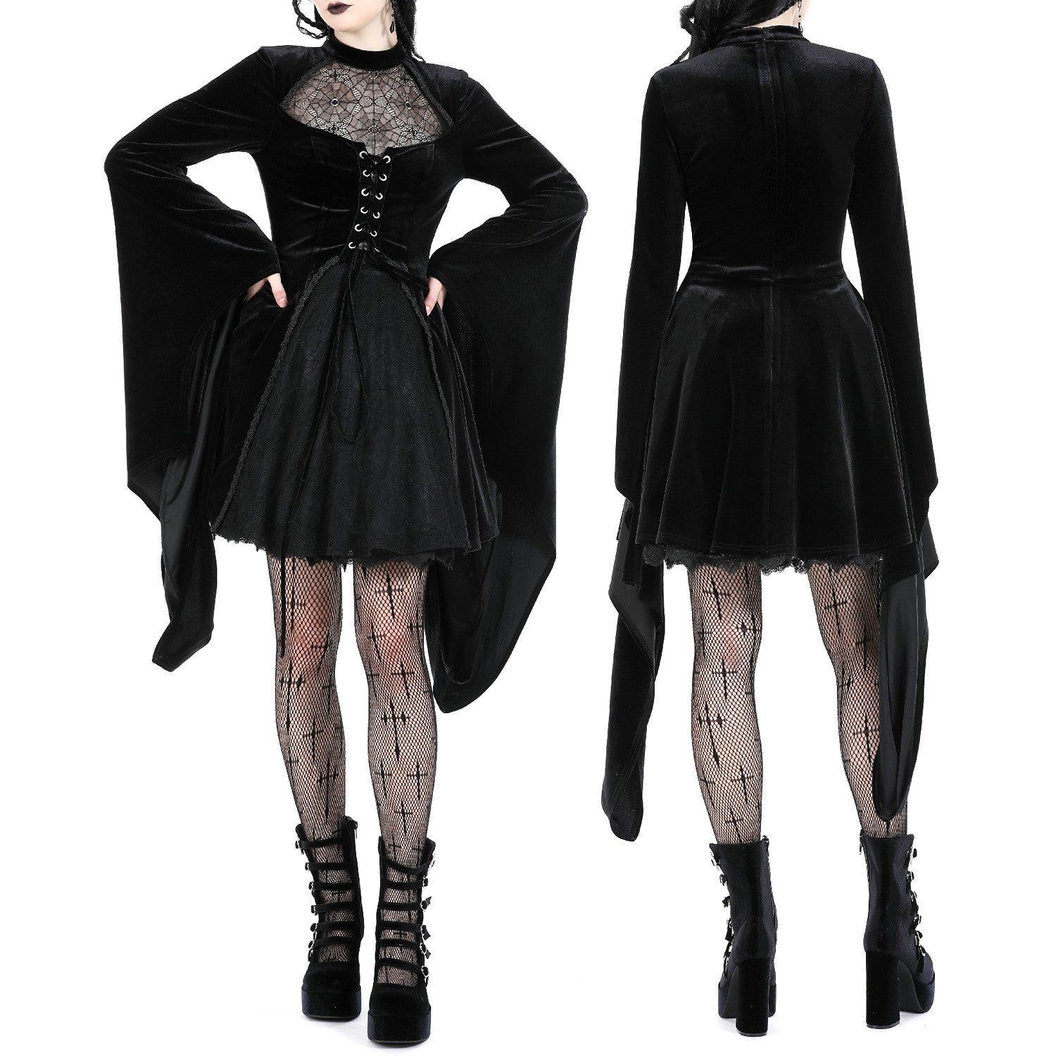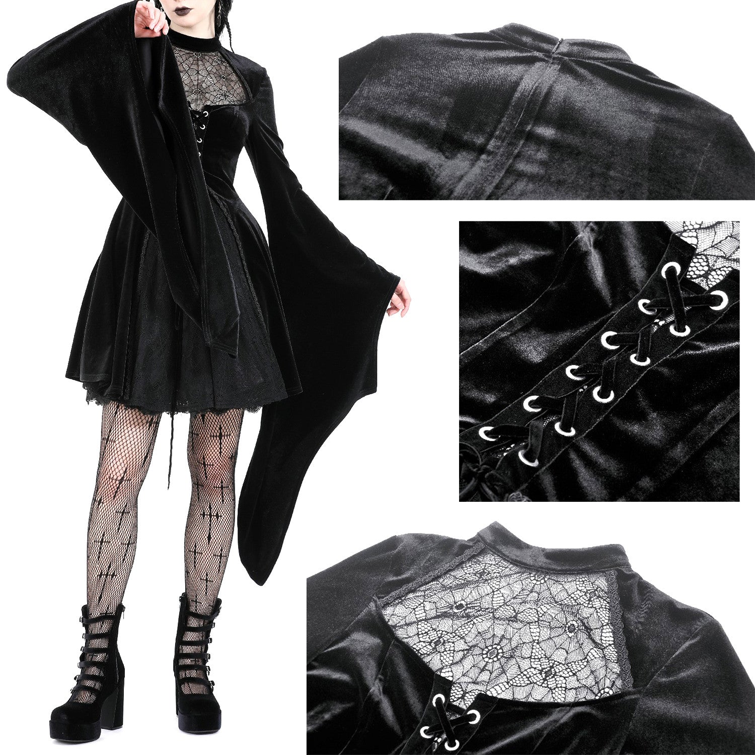 Descubre nuestro vestido corto de terciopelo negro con un fascinante diseño de telarañas. Sus mangas extra largas añaden un toque de elegancia. Con cordones cruzados en la parte delantera y una cremallera en la espalda, este vestido corto de terciopelo es la combinación perfecta de estilo y comodidad. Fabricado al 100% en poliéster, es una opción imprescindible para quienes buscan moda gótica, alternativa y punk. Atrévete con este Vestido Corto de Terciopelo único que refleja tu personalidad distintiva.