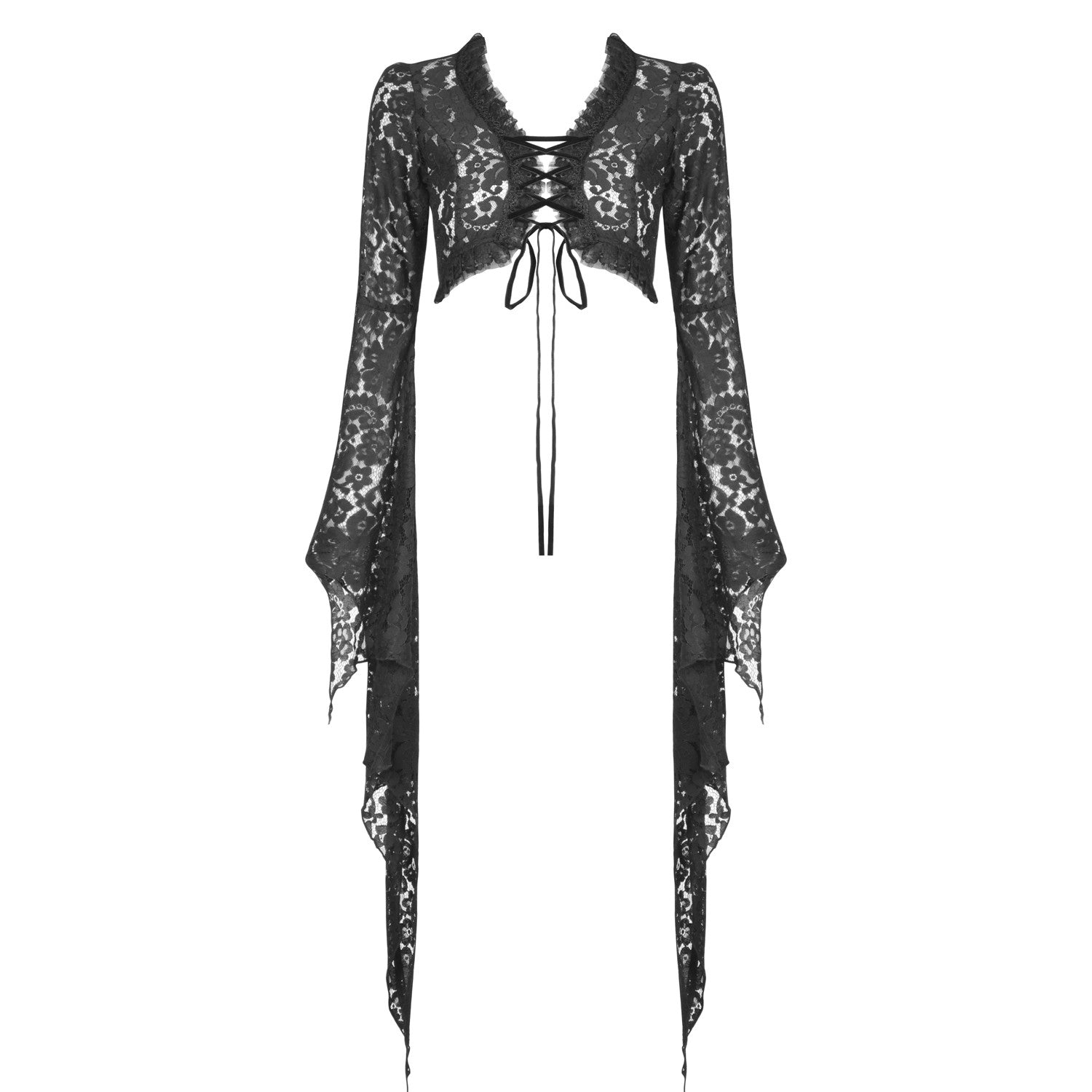 Complete your gothic look with this black, semi-sheer lace bolero with long, V-neck sleeves. Crisscross straps at the neckline allow for adjustable closure. Made of 65% nylon and 35% cotton for comfort and durability.