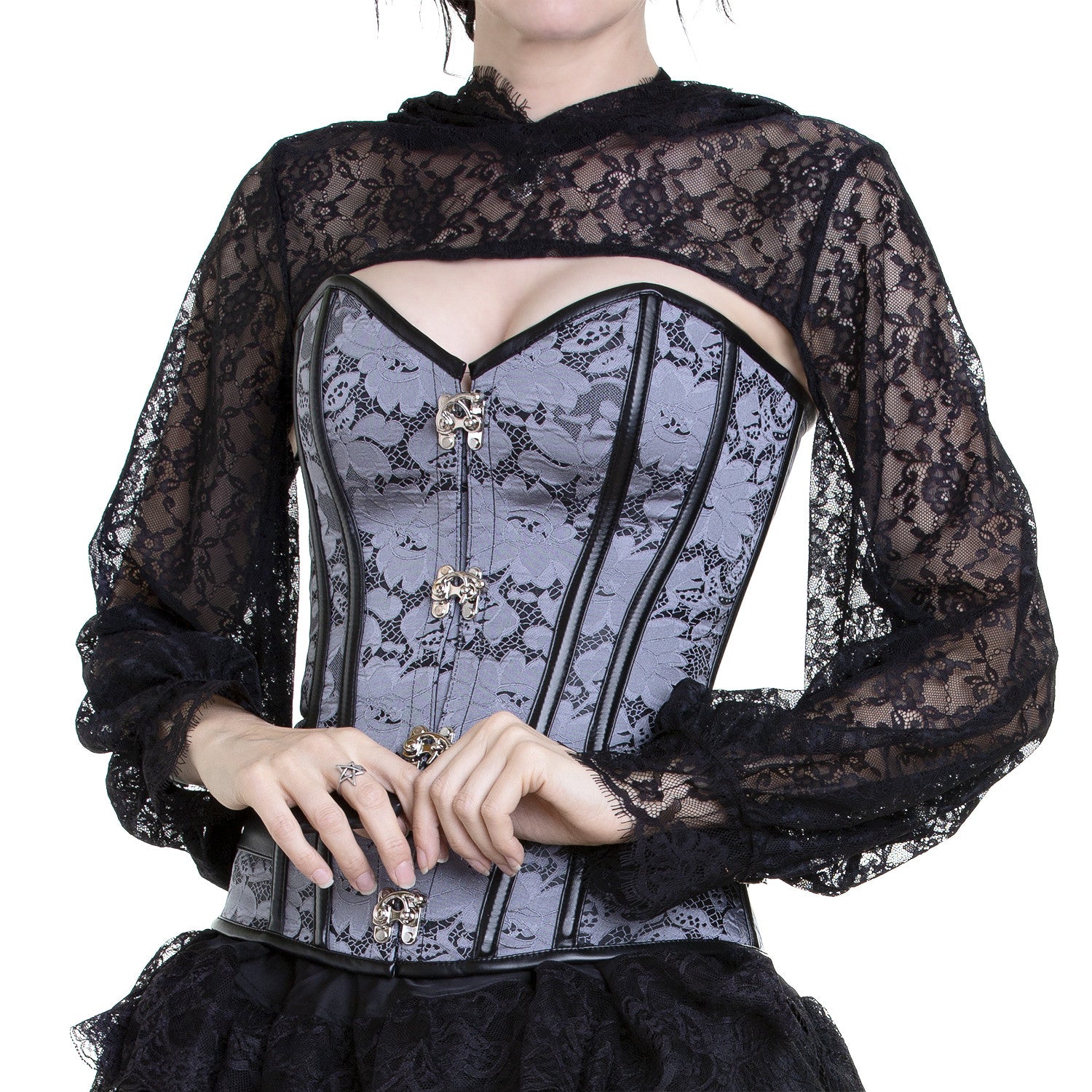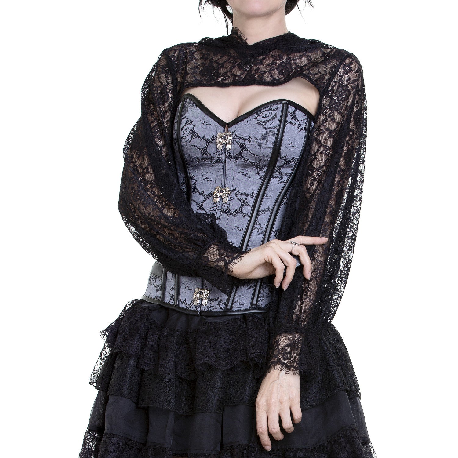 Explore our black sheer hooded bolero, a unique piece that stands out with its long, wide sleeves. Crafted from 100% polyester, this bolero combines style and elegance in a distinctive way. The sheer material adds a seductive touch to your look, while the hood and long sleeves provide a mysterious appeal. Our model's measurements, with a bust of 88 cm, waist of 72 cm, hips of 99 cm, and height of 170 cm, highlight how this bolero gracefully complements the female figure. Add this bolero to your collection of gothic, alternative, and punk clothing and accessories for a unique and captivating style that reflects your individuality.