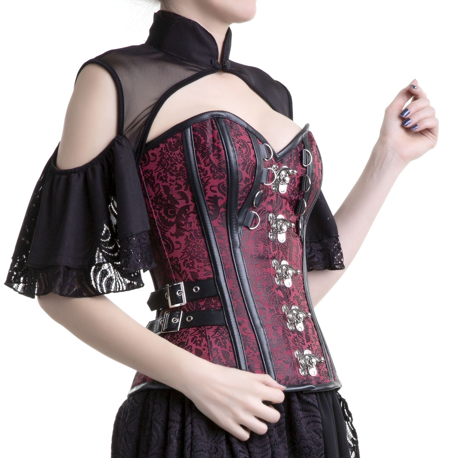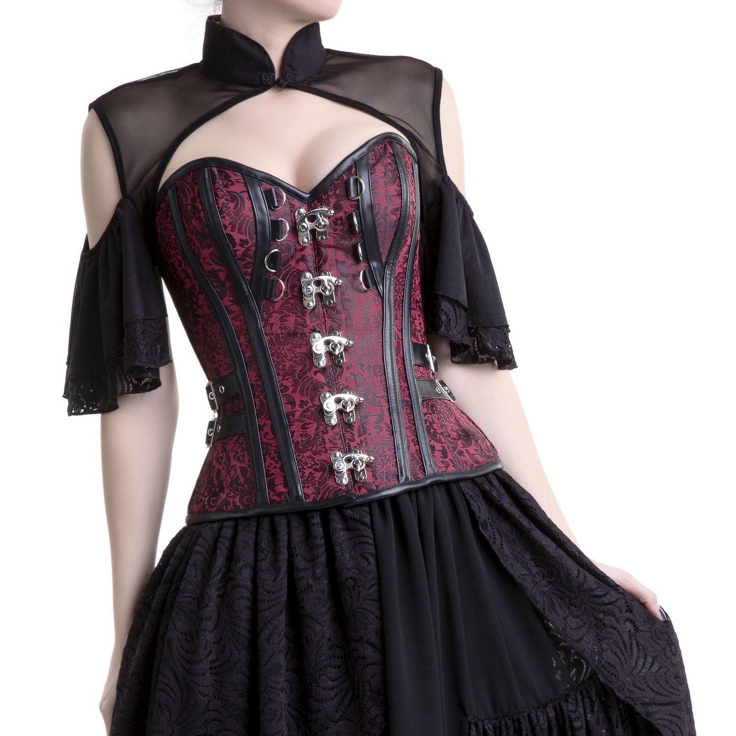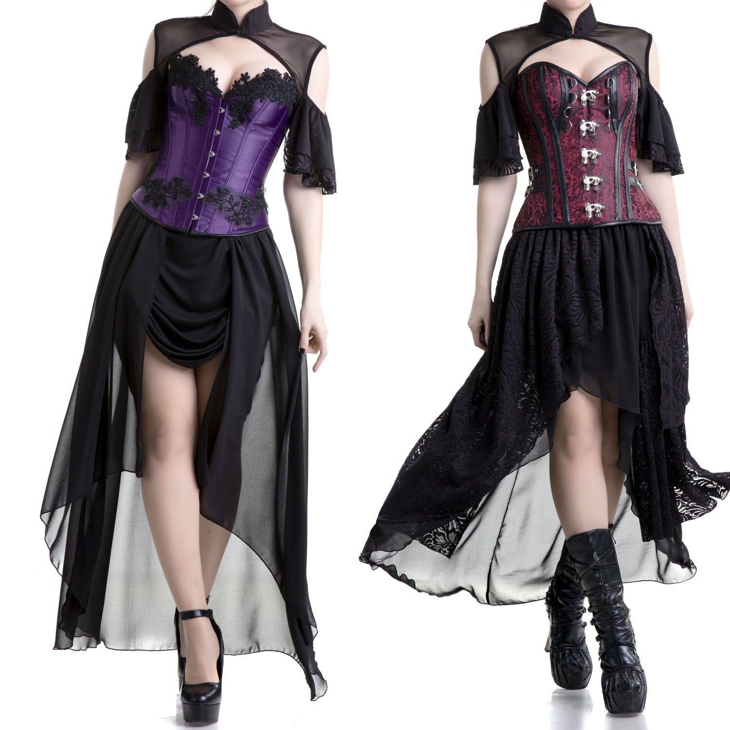 Black tulle bolero with short lace sleeves. Open shoulders. High buttoned collar.