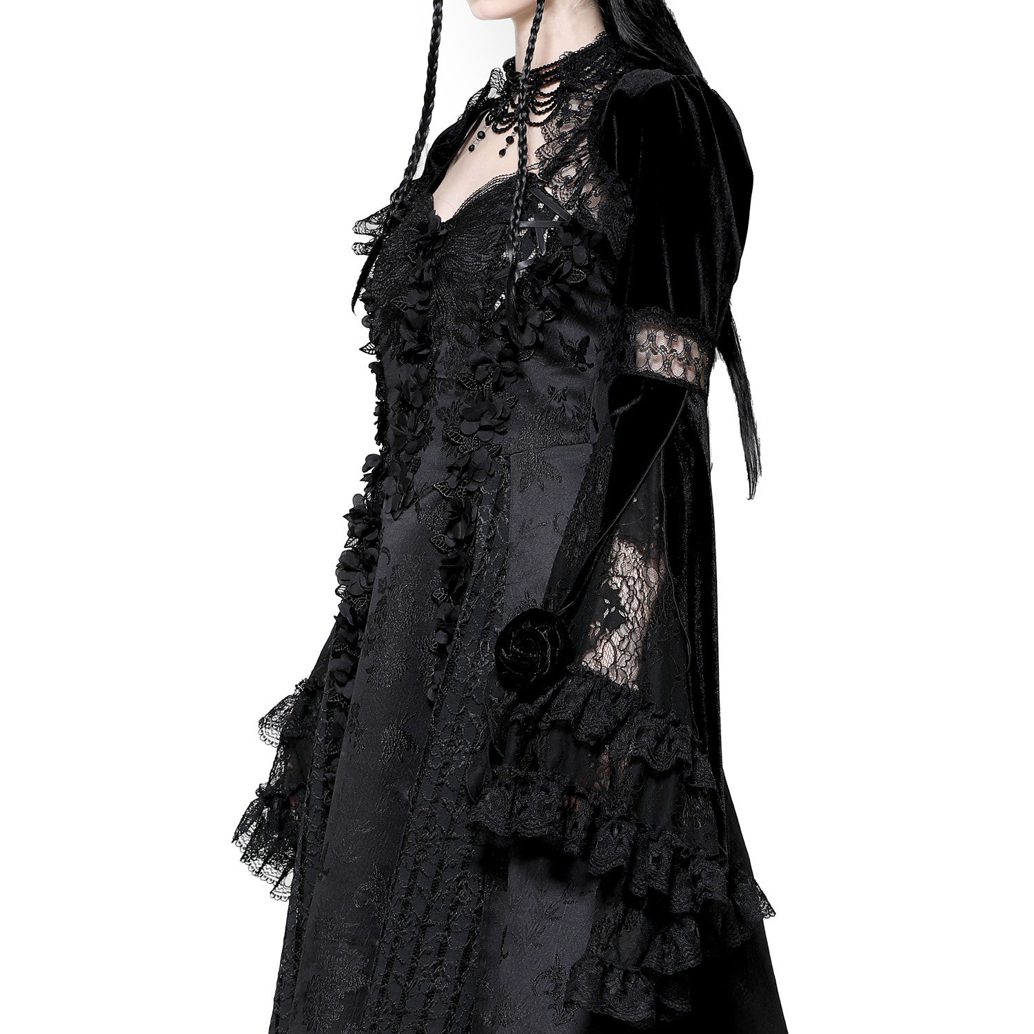 Bell-sleeved bolero made from a combination of velvet and lace. Perfect for pairing with suspenders or corsets!