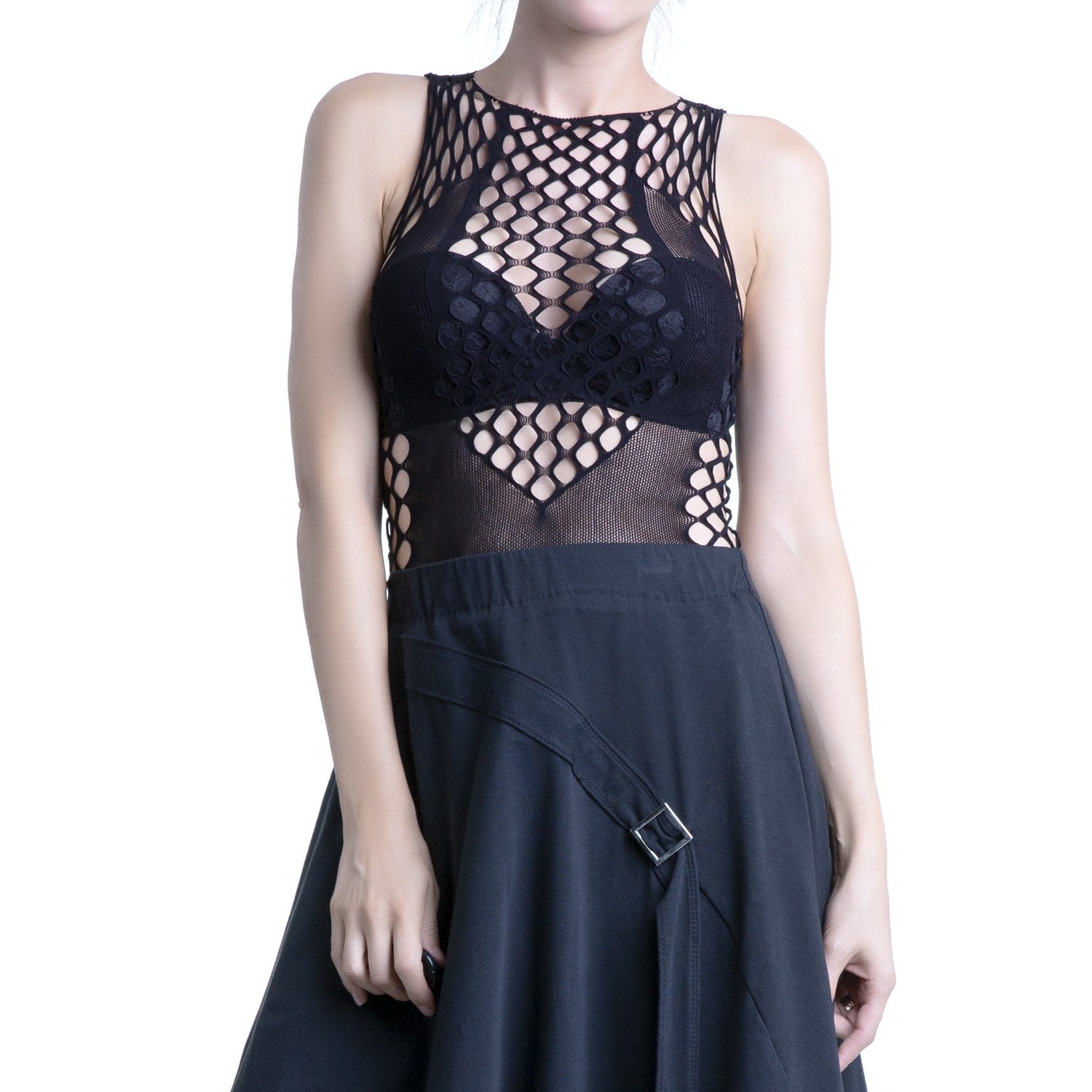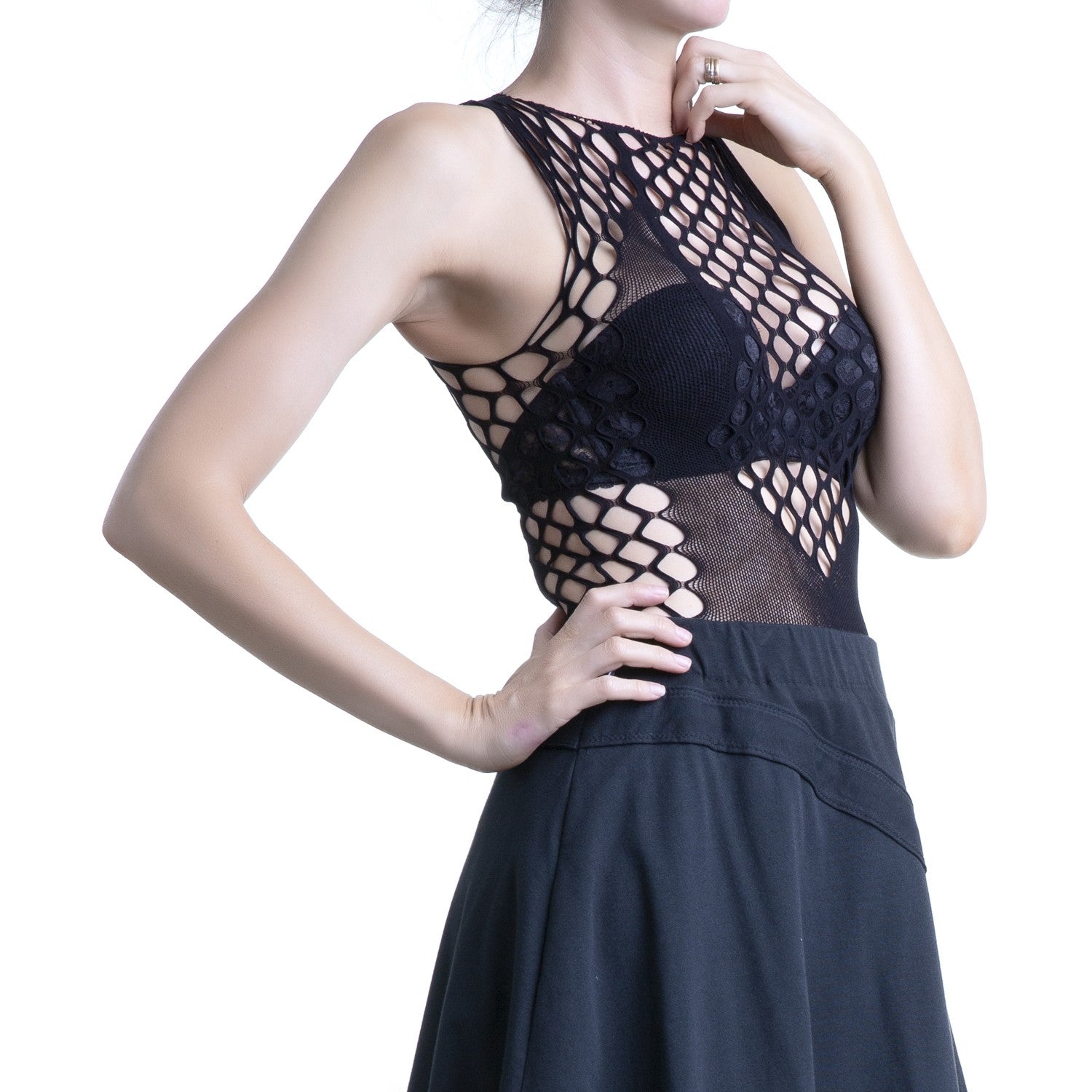 Black, sheer T-shirt with holes. Stretchy fabric.