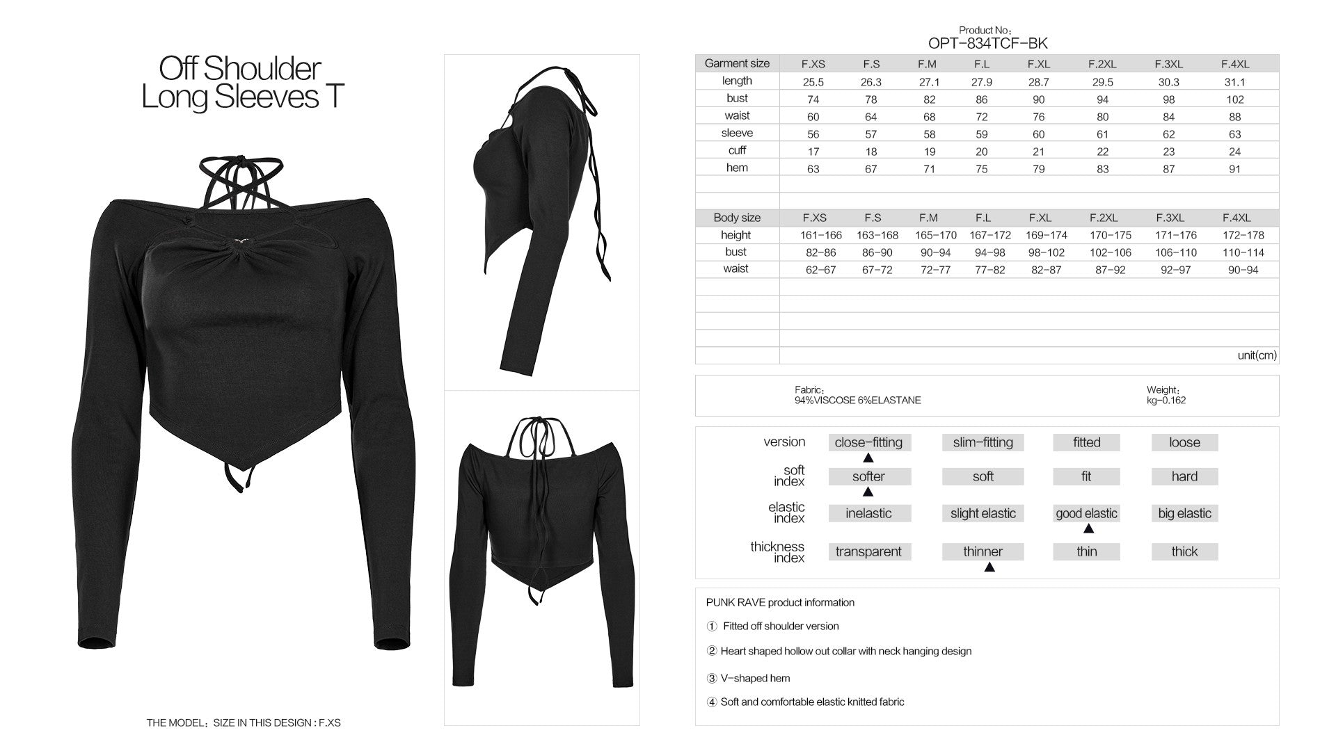 This long-sleeved cropped tee is the perfect addition to any gothic, alternative, or punk wardrobe. With its off-the-shoulder design and straps that tie at the neck, it's a statement piece. Its deep black color makes it versatile and easy to style. It's also made from 94% viscose and 6% elastane, making it comfortable and durable at the same time. Get it now and complete your rebellious look!