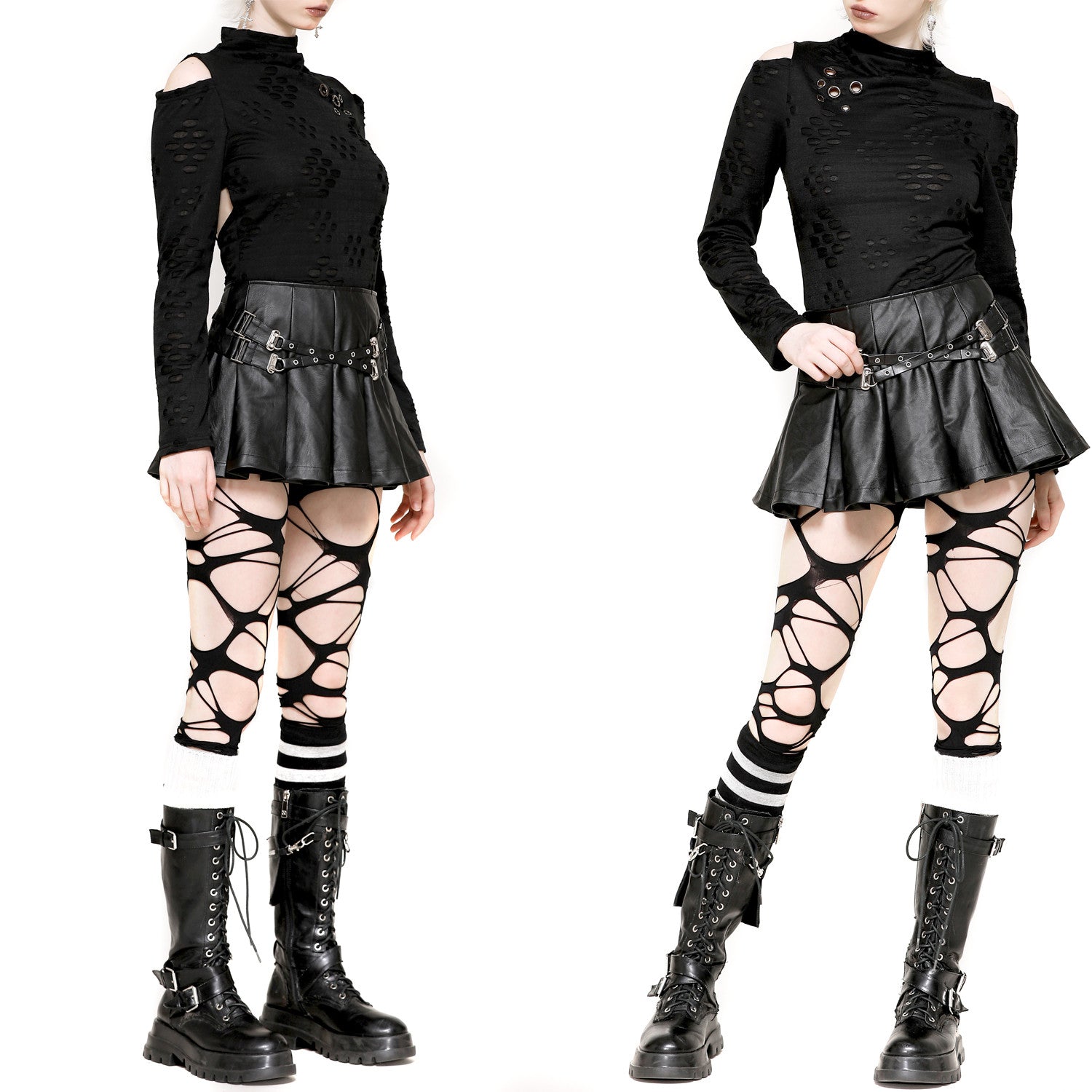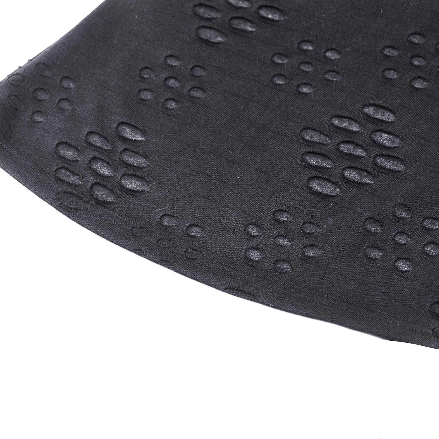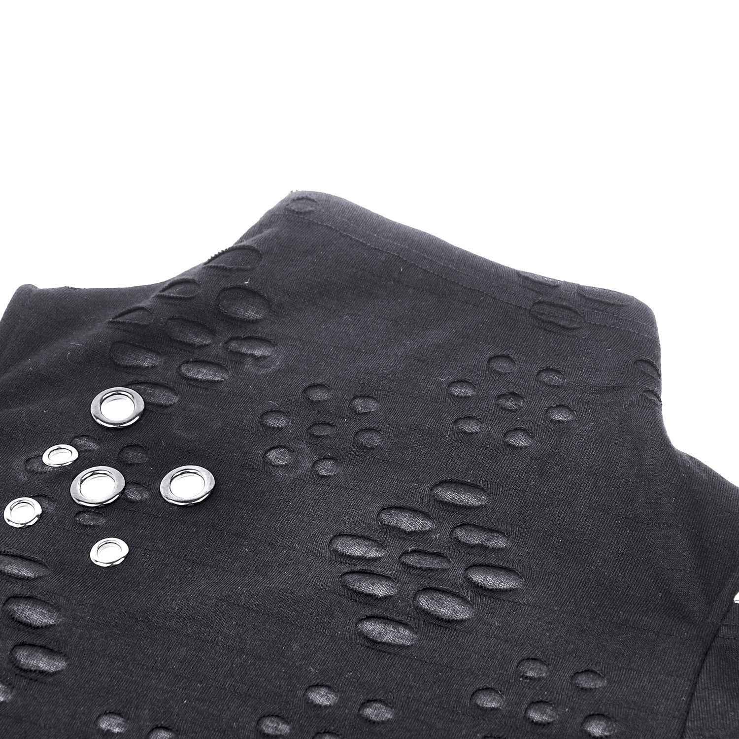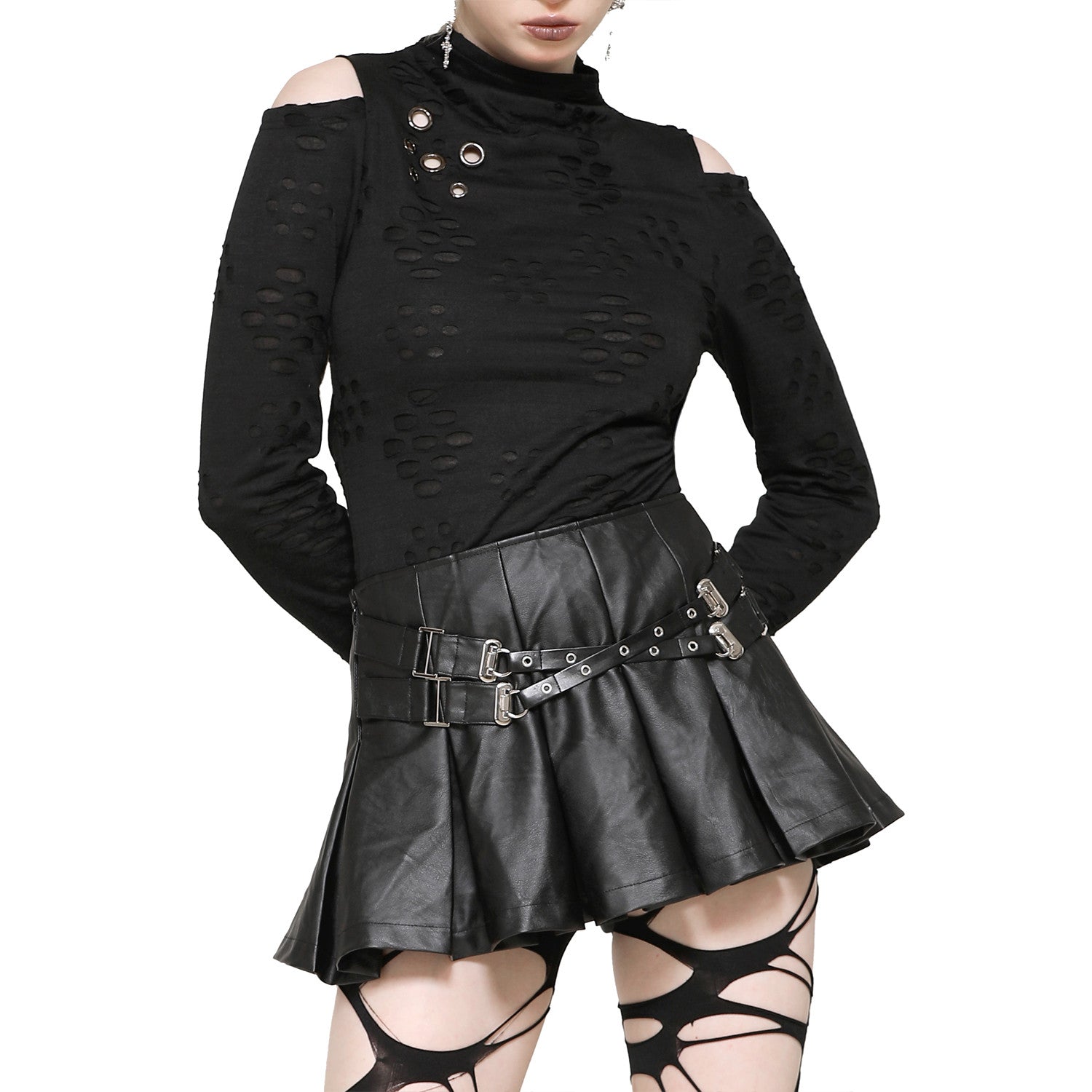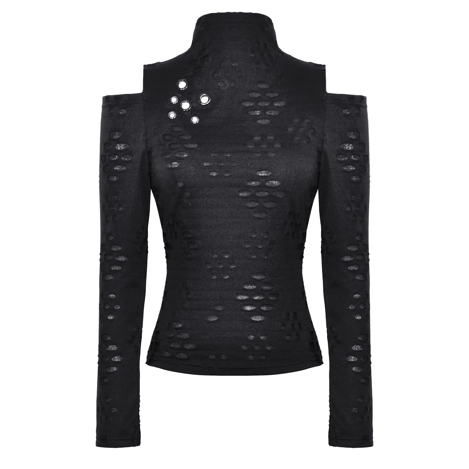 Off-the-shoulder high-neck tee with textured fabric and holes. Open back with an incredible design!