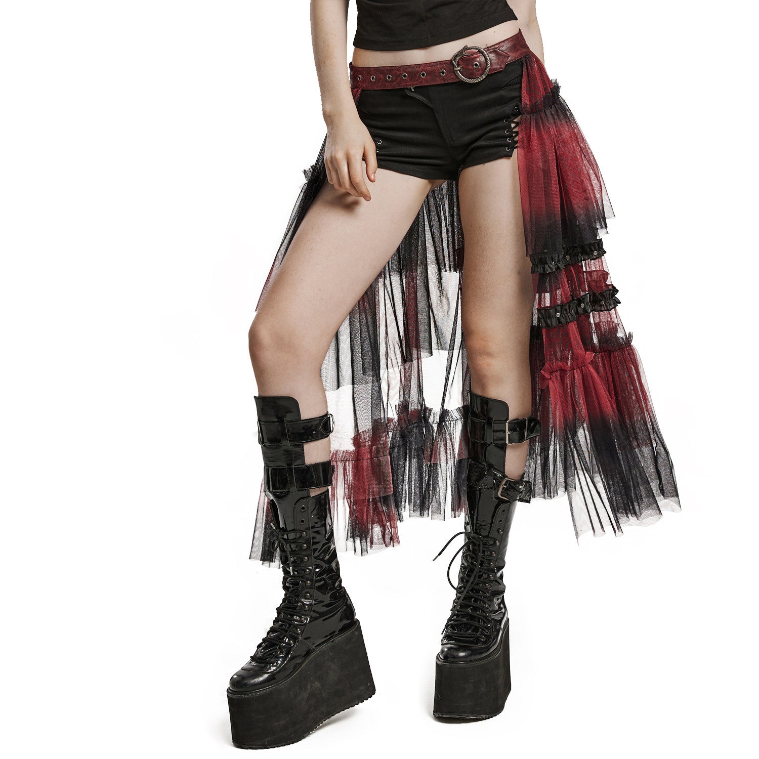 Add a distinctive touch to your gothic style with our red and black tulle skirt belt. Featuring ruffles and an asymmetrical design, this belt adds a touch of drama to any outfit. The dragon-shaped buckles offer a unique and eye-catching touch. Made entirely of polyester, this red and black skirt belt is both stylish and durable.