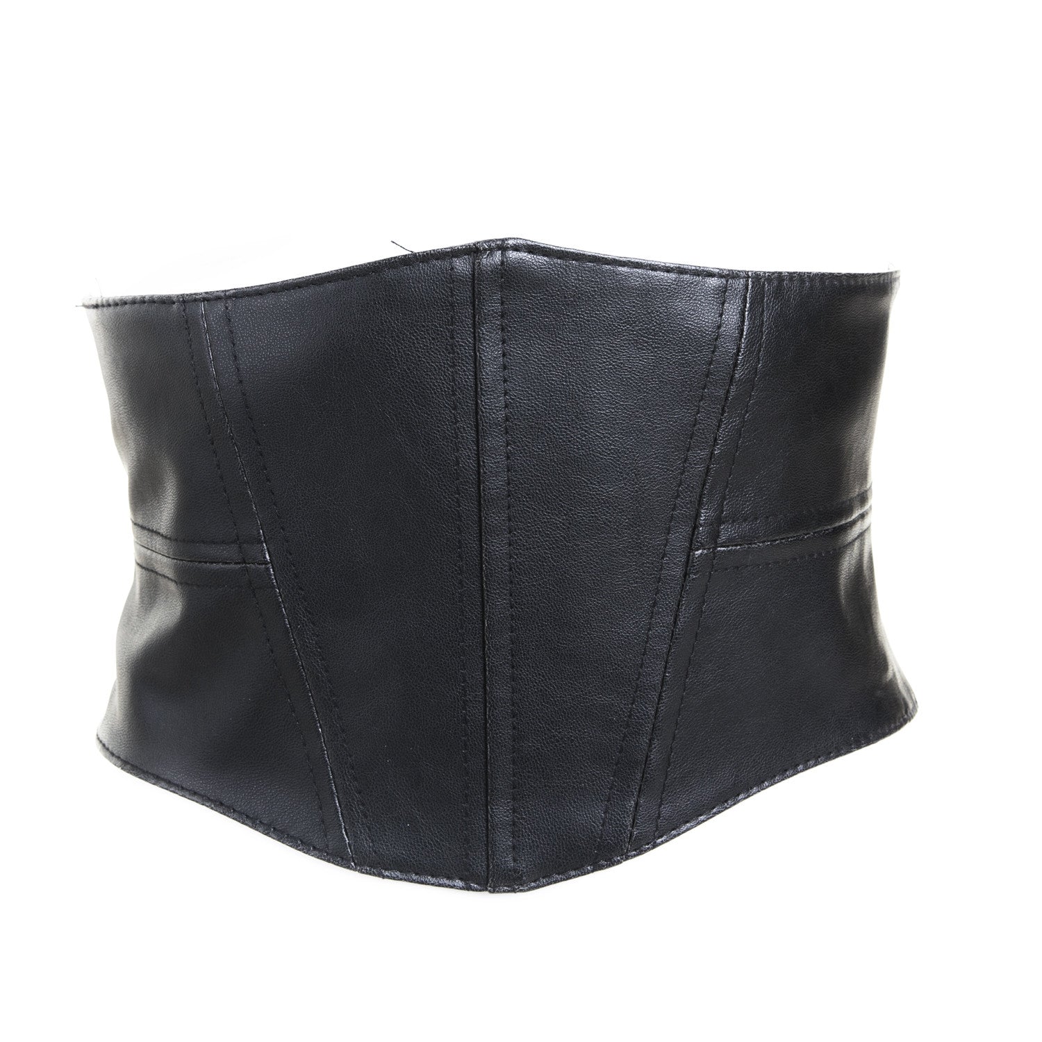 Amplify your gothic, alternative, or punk style with our eye-catching black faux leather stretch wide belt. This stretch belt features a bold design and closes with snap buttons at the back, ensuring a comfortable and secure fit.