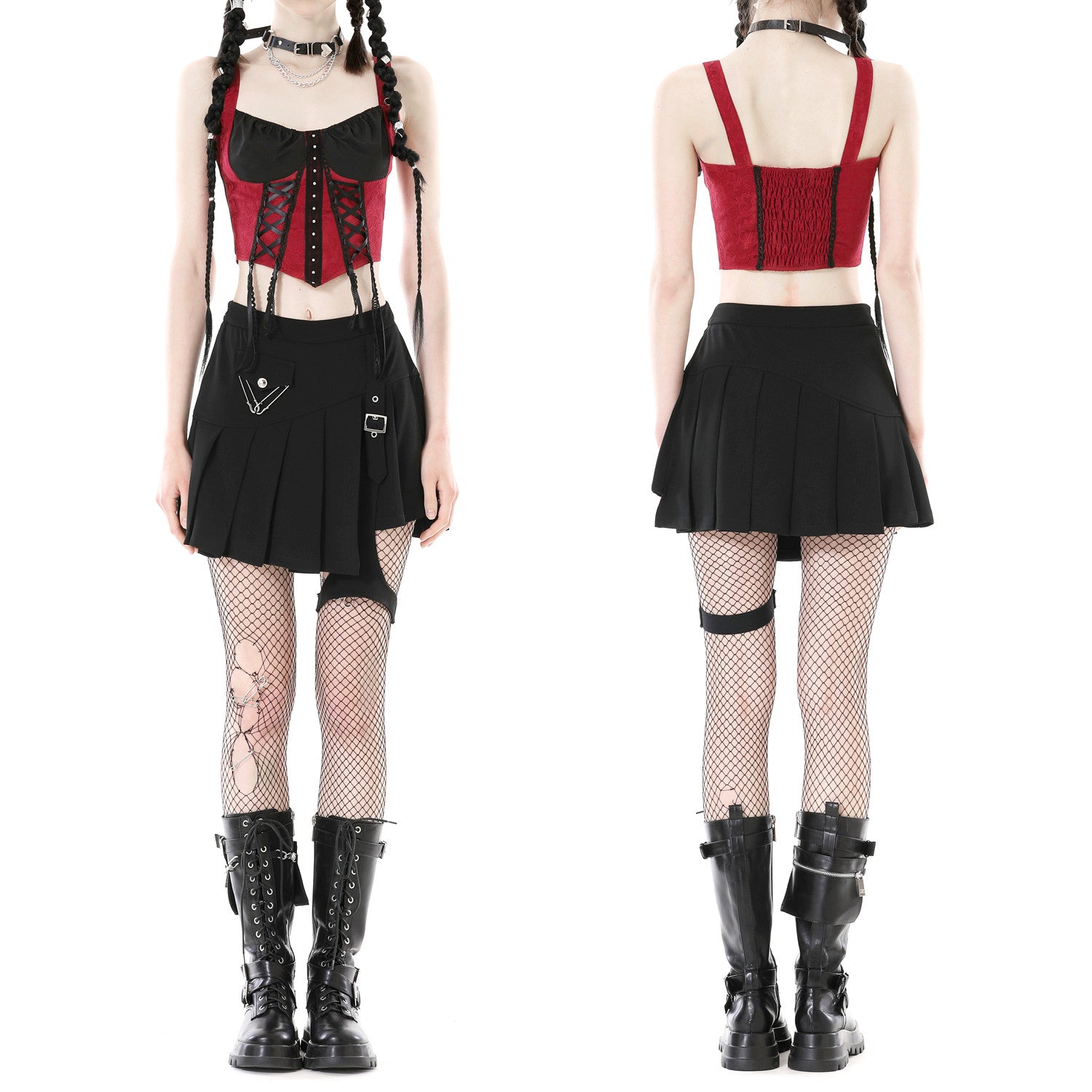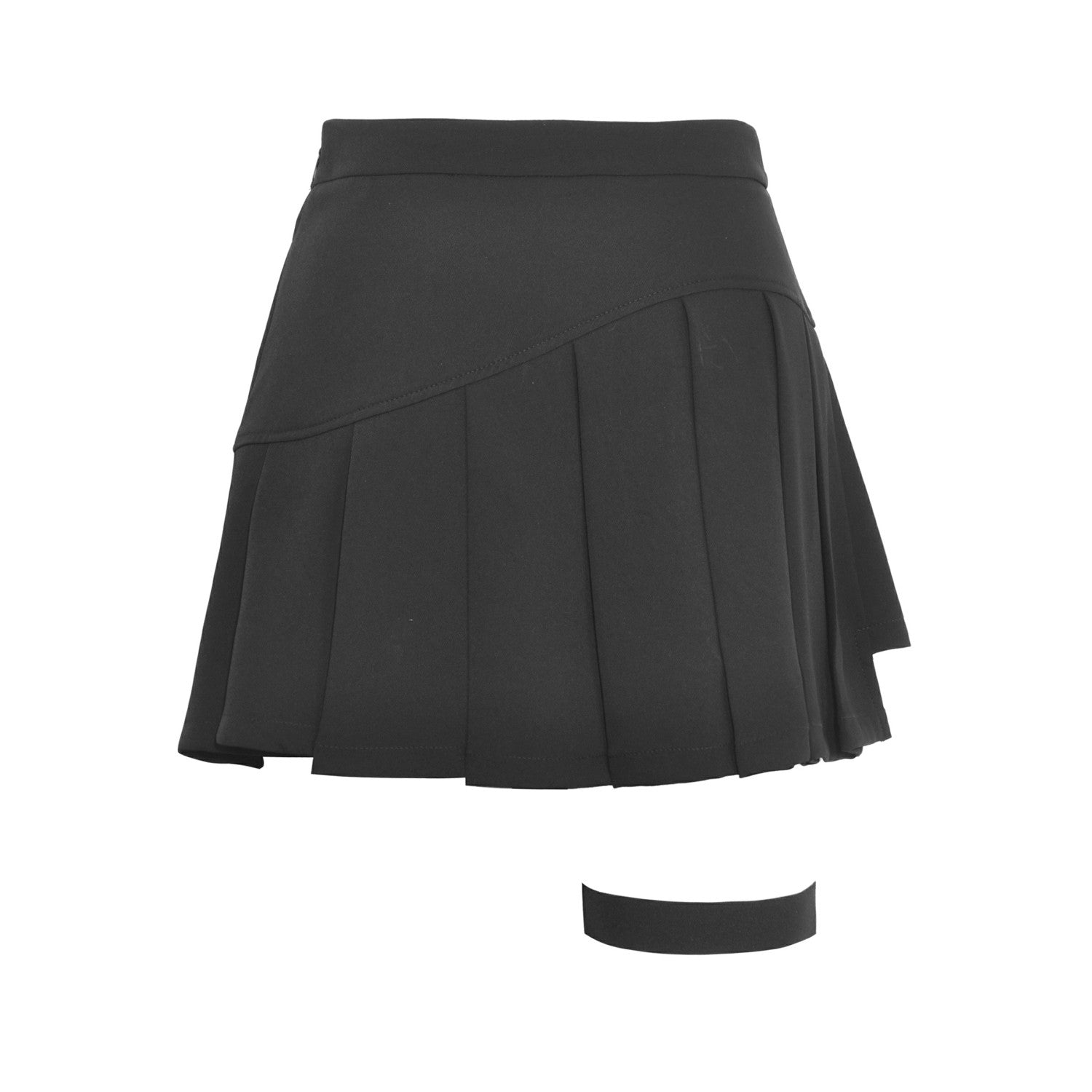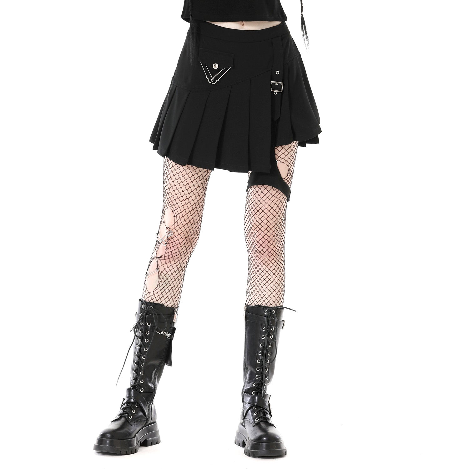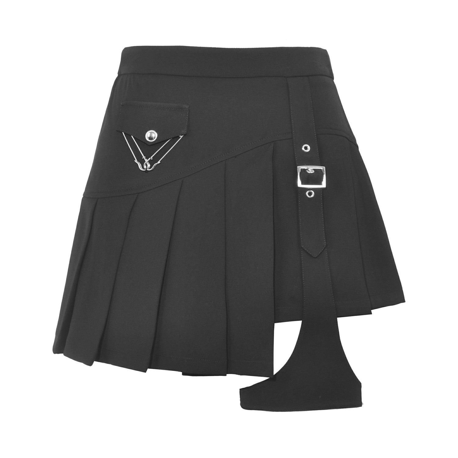 Set a trend with this short, asymmetrical black skirt, ideal for lovers of gothic, alternative, and punk fashion. It features unique details like a buckle, safety pins, and a garter that add a rebellious and distinctive touch. Made with 100% high-quality polyester for durability and comfort. Elevate your alternative style with this asymmetrical skirt that captures the essence of the boldness and originality of underground fashion.