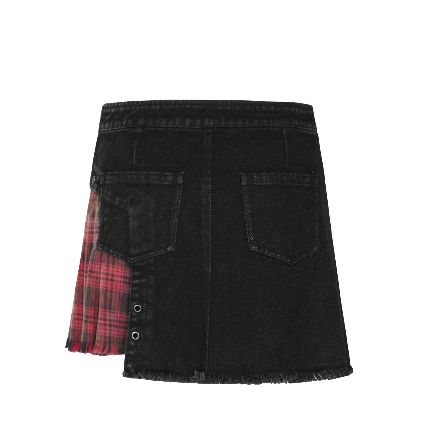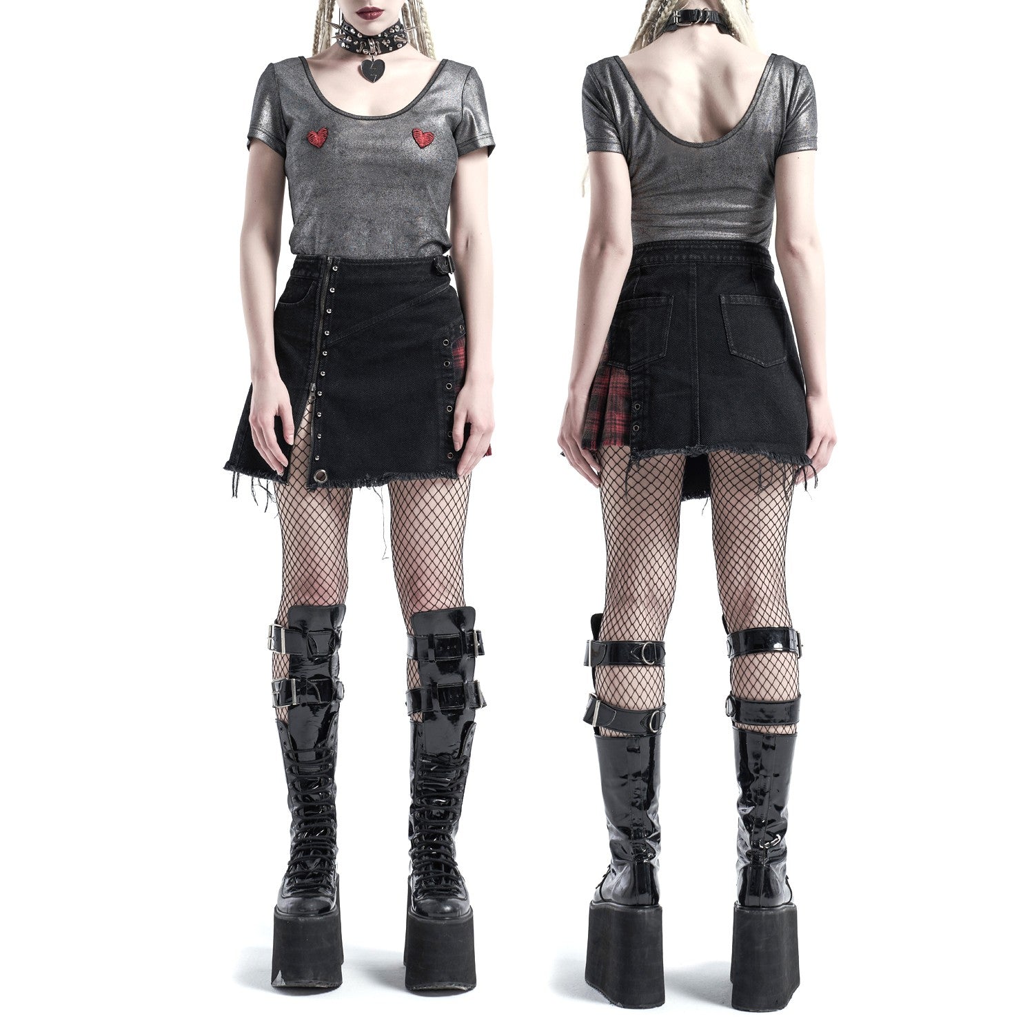 Black asymmetrical miniskirt with zipper, studs, pockets, buckle and red tartan.