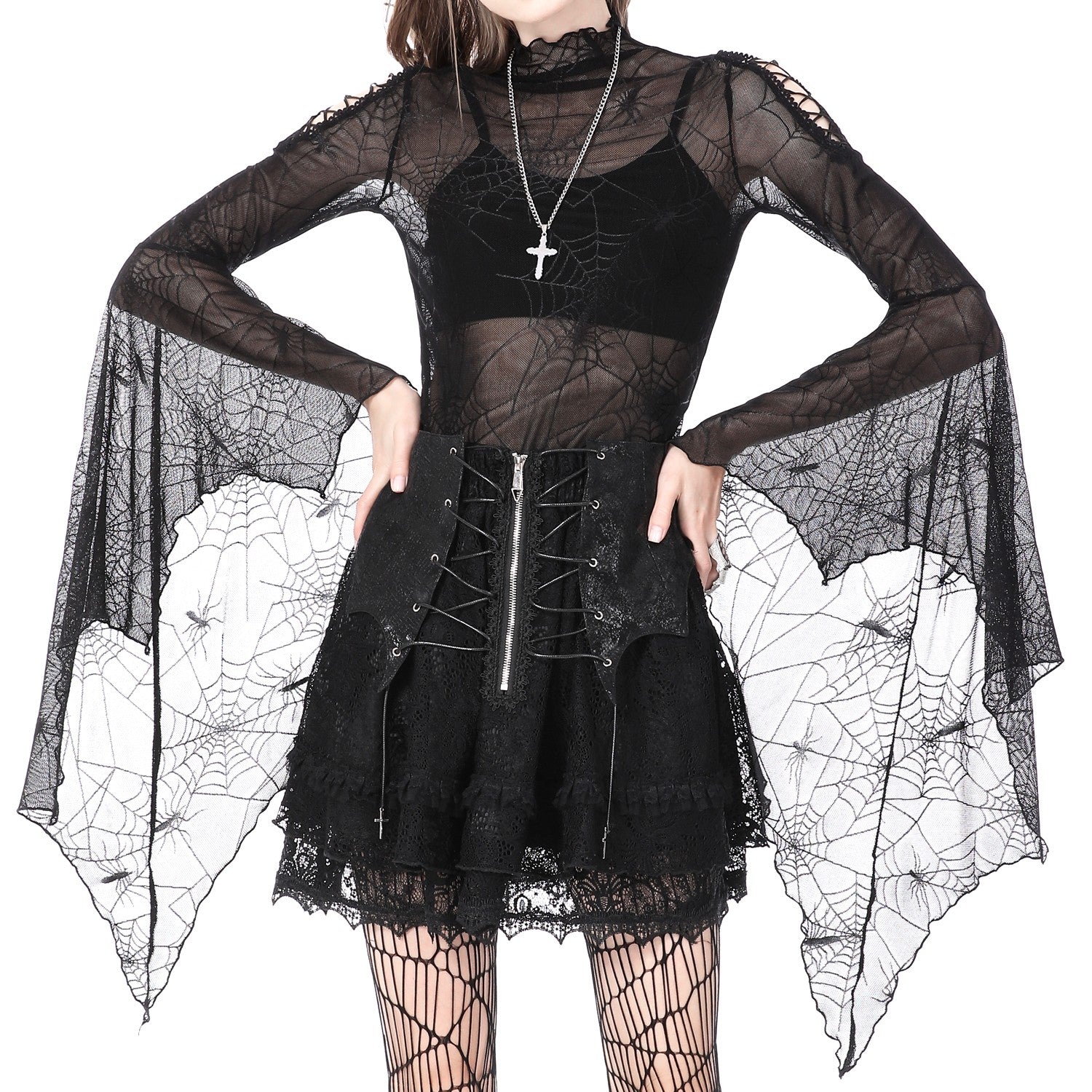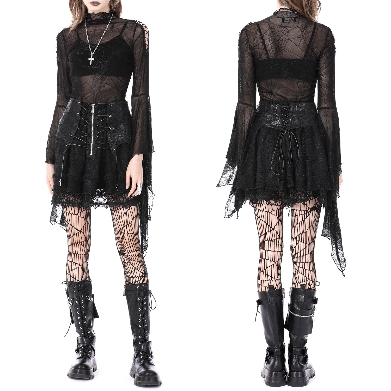 Look bold and dark with our short, high-waisted, black lace skirt! Featuring a front zipper and crisscross lace trim at the back to adjust the waist to your liking, this skirt is perfect for any lover of gothic, alternative, and punk styles. Made with a blend of 95% and 5% polyester and spandex, respectively, this skirt is comfortable and durable. Add a touch of dark style to your wardrobe with our lace skirt!