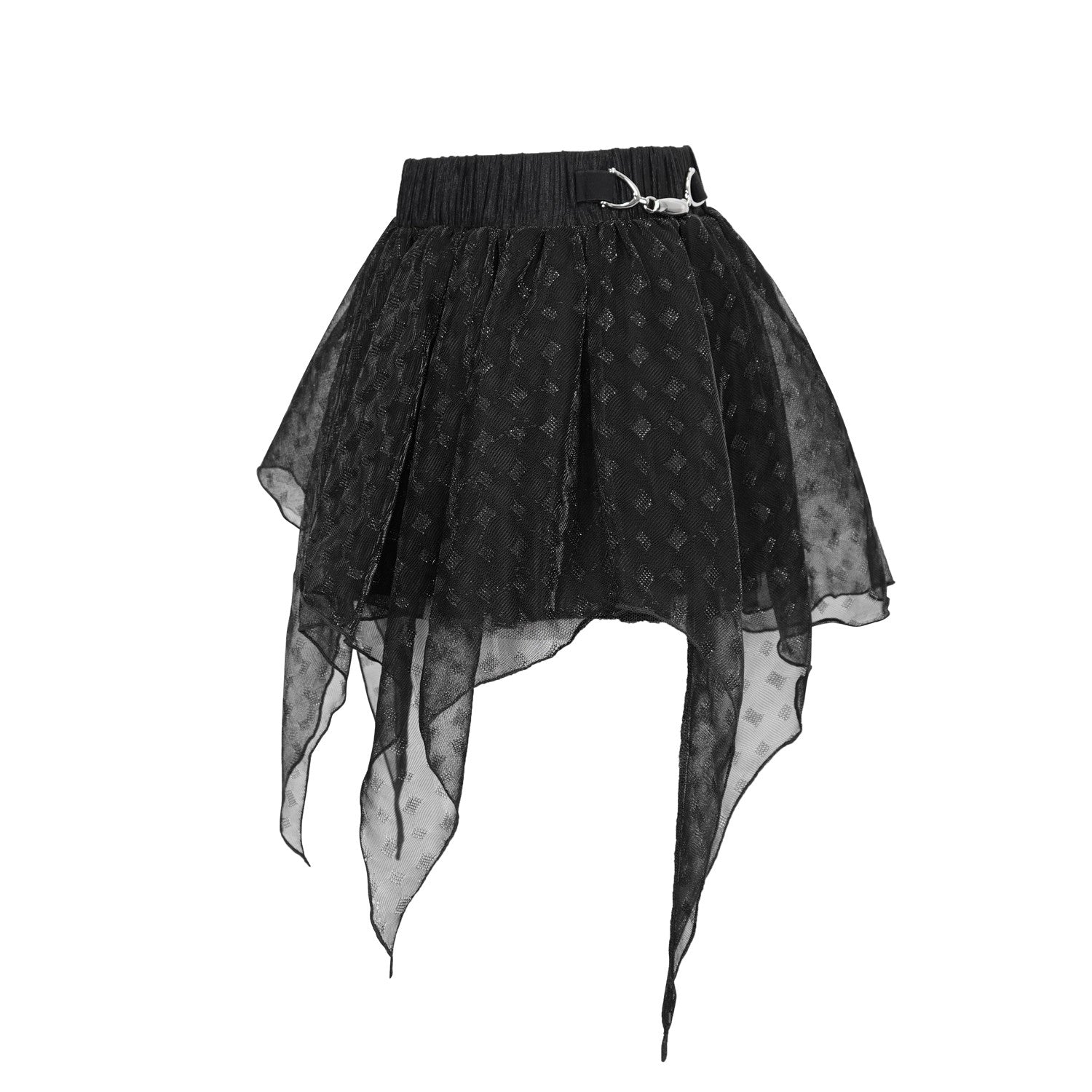 Short black skirt with a layer of scalloped tulle. Elastic waist.