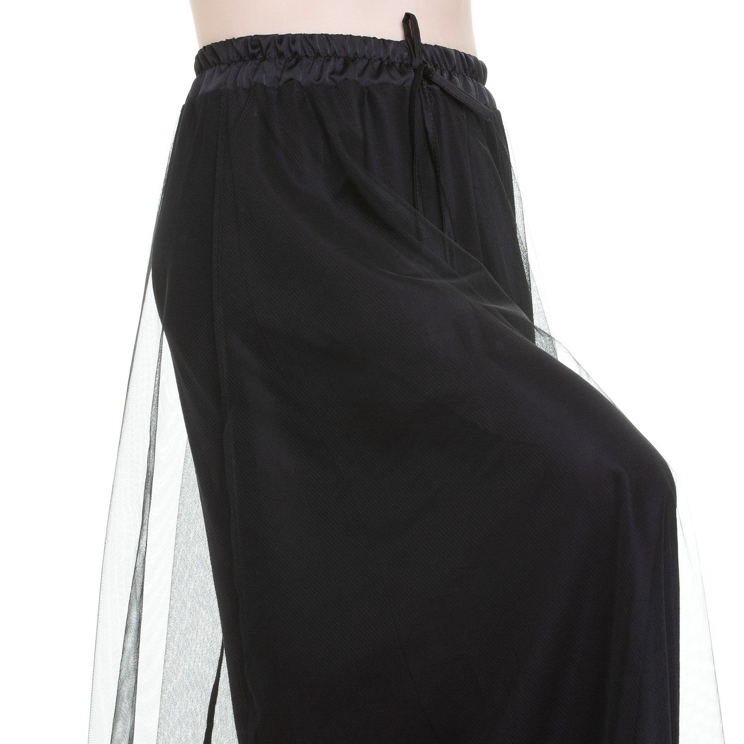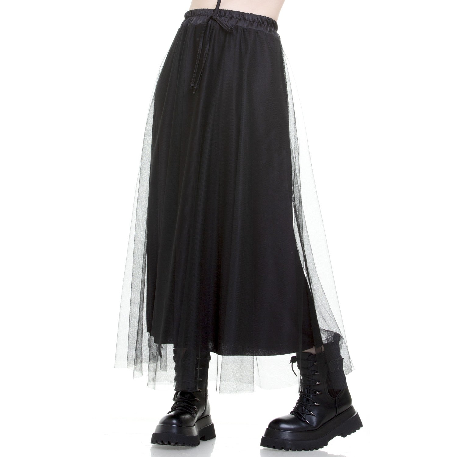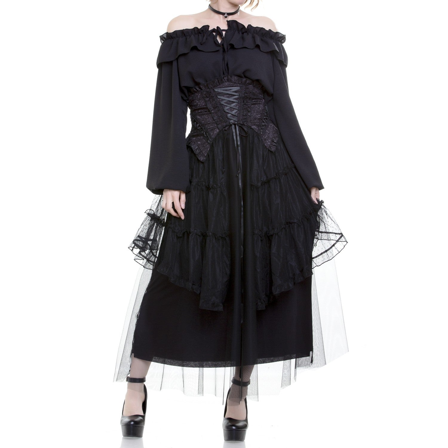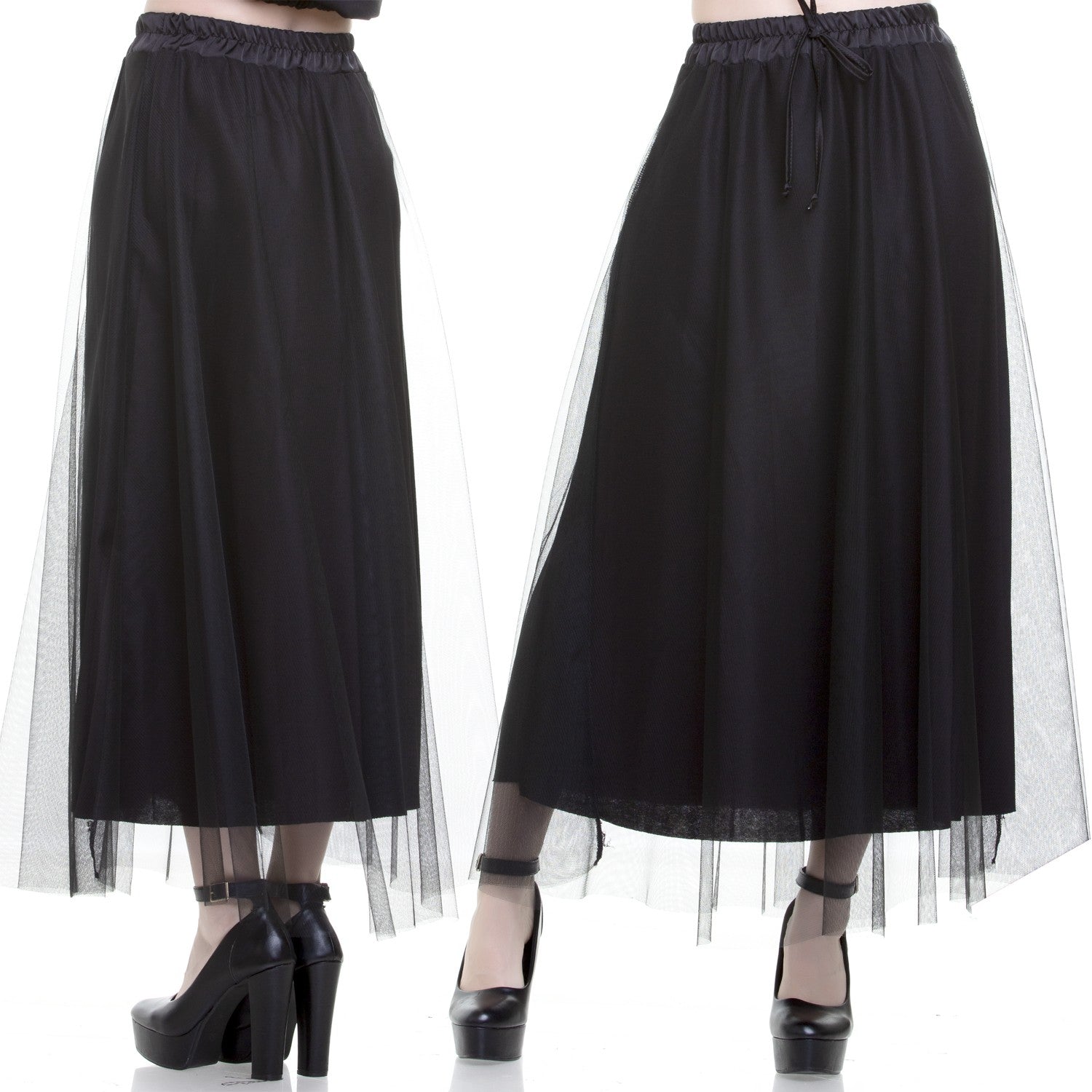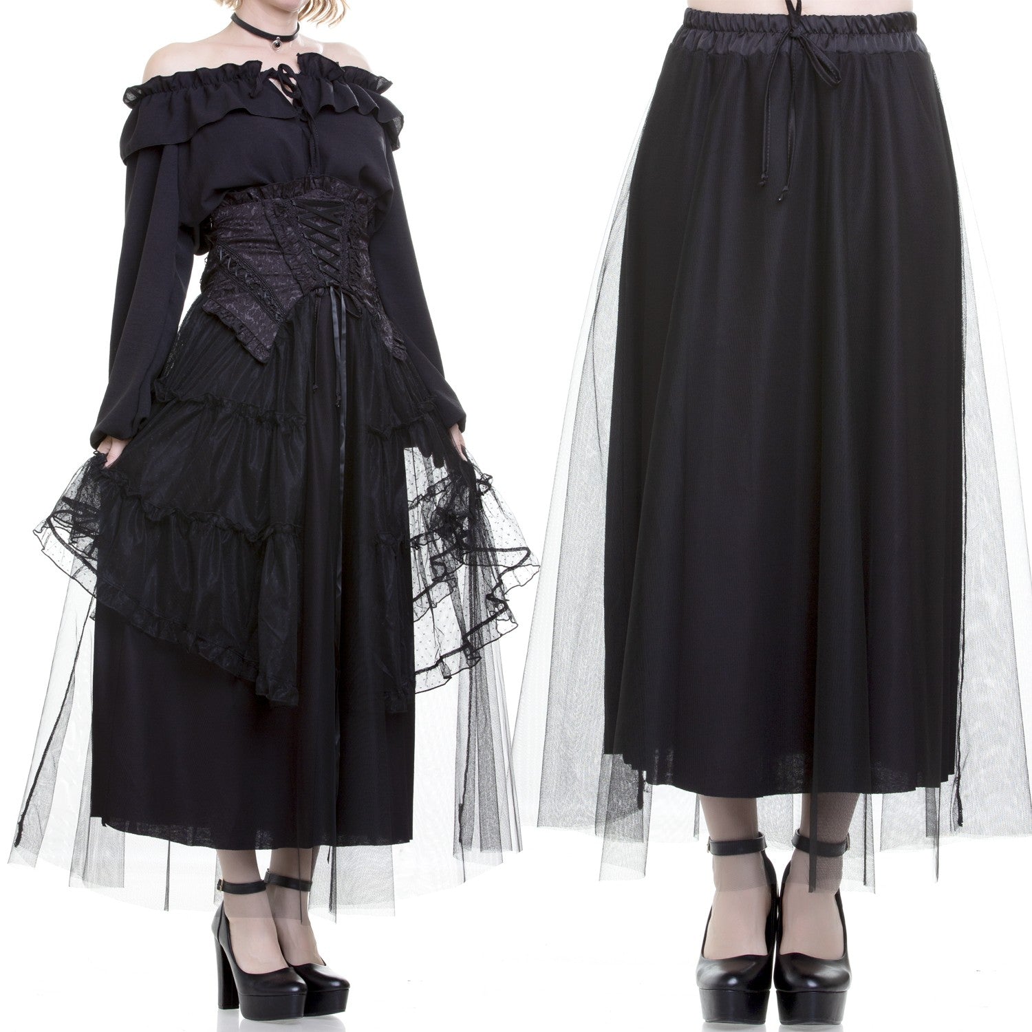 This long black skirt with a tulle overlay is a must-have for anyone looking to add a touch of gothic, alternative, or punk style to their wardrobe. The elastic drawstring waist allows you to adjust the skirt to your size for comfort and security. Find this skirt in our online store of gothic, alternative, and punk clothing and accessories. Add this unique and eye-catching skirt to your wardrobe and make a style statement with it!
