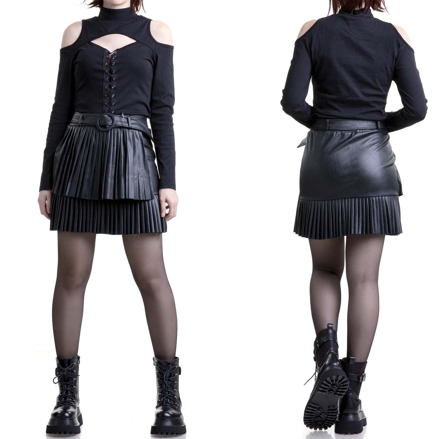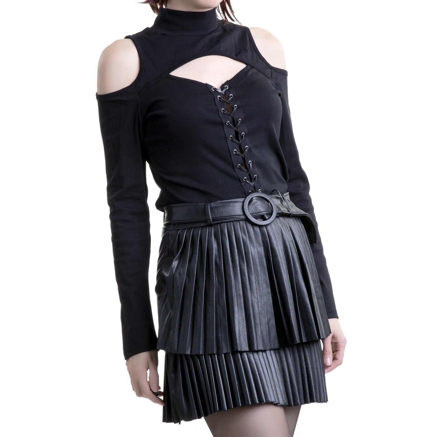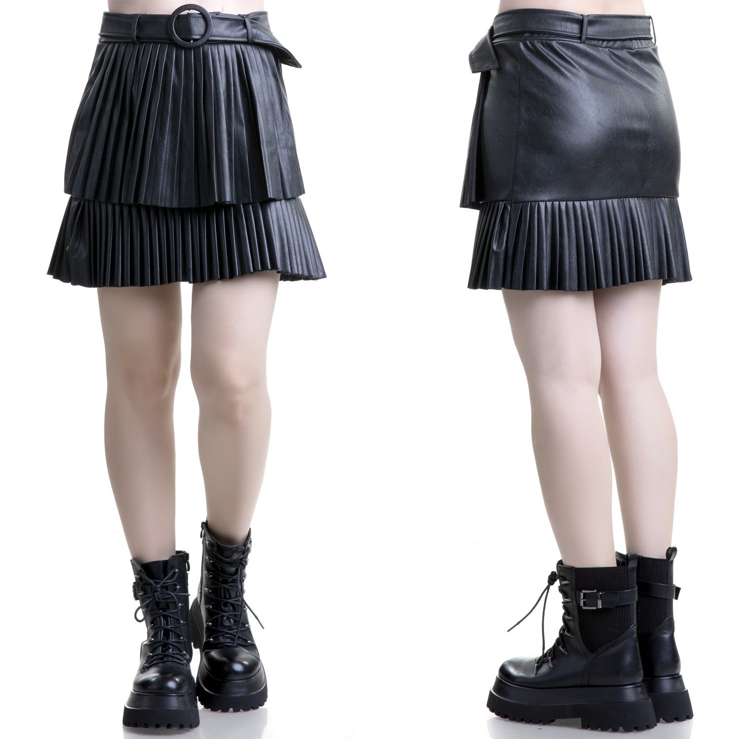 Short, asymmetrical black faux leather skirt with a pleated front. Belt included.