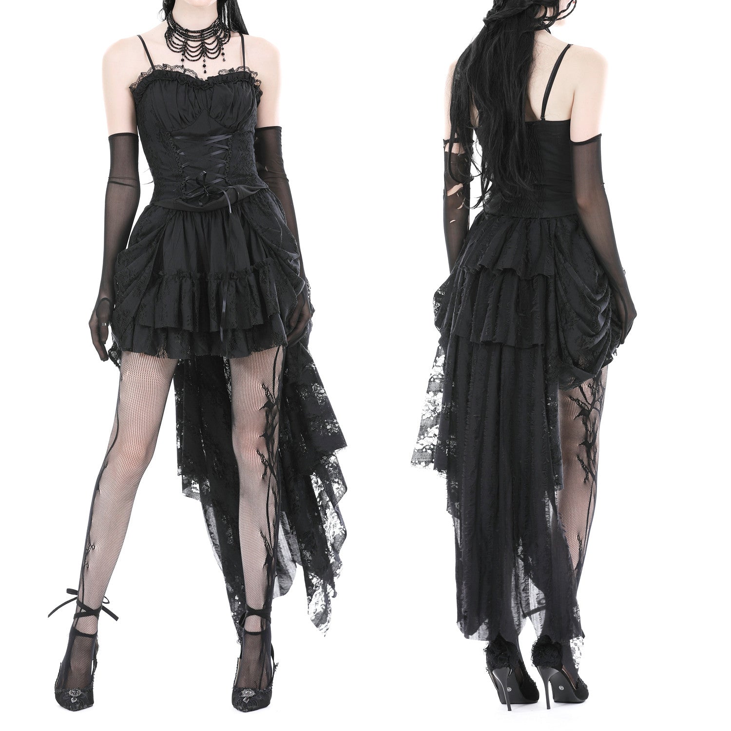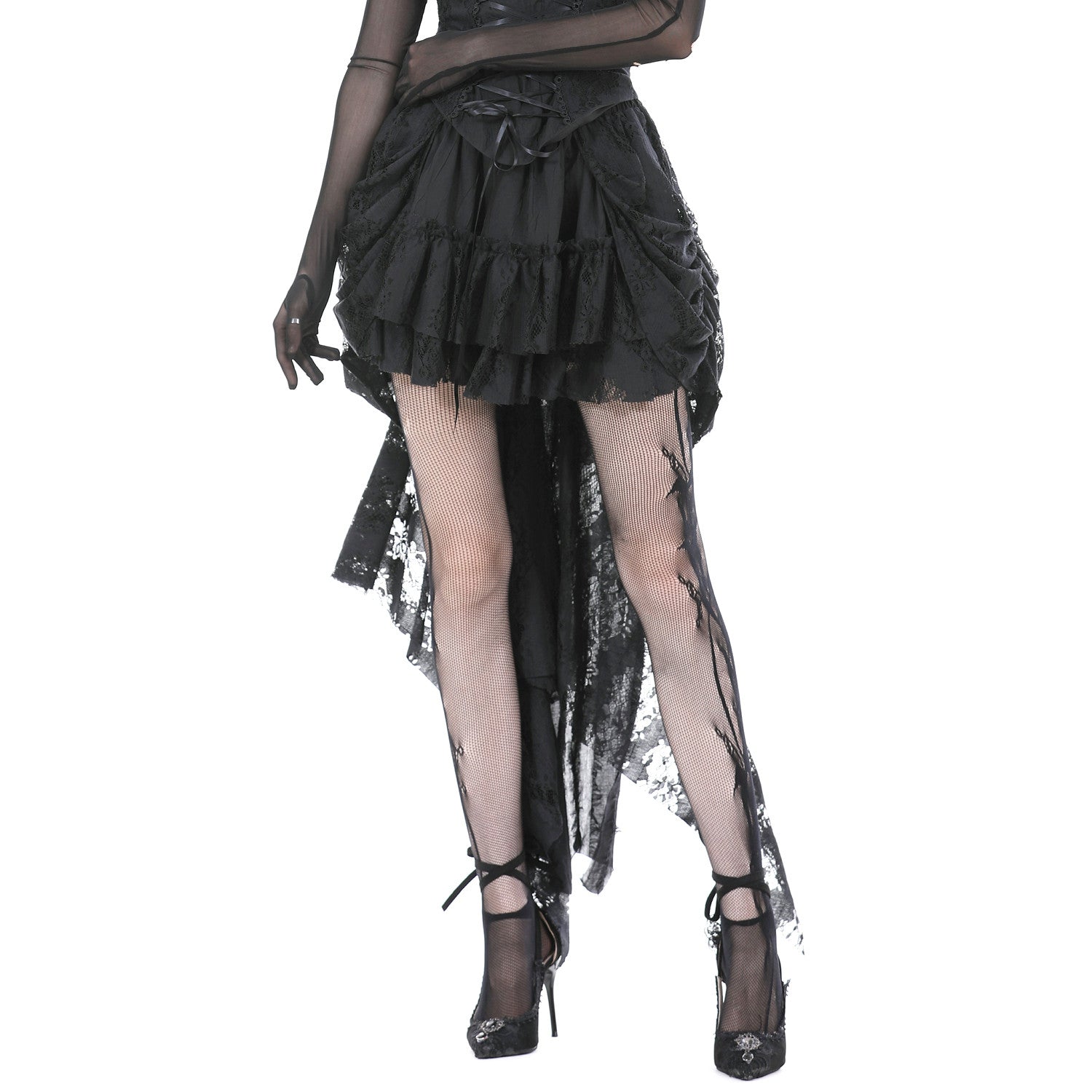 Stand out with this elegant black lace short skirt featuring a long train. Its elastic waistband ensures a comfortable fit. Made with a 50% nylon and 50% cotton composition for lasting comfort and style. This elegant lace skirt is essential for those seeking a gothic and alternative look with a touch of sophistication and comfort.