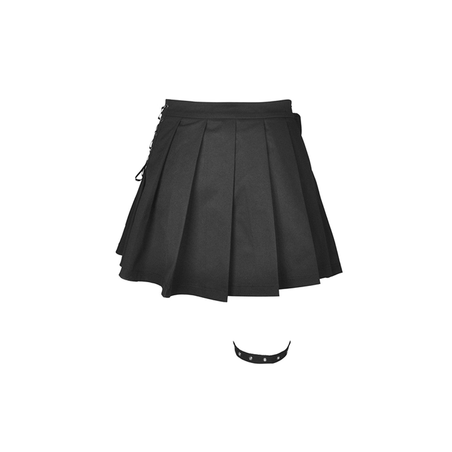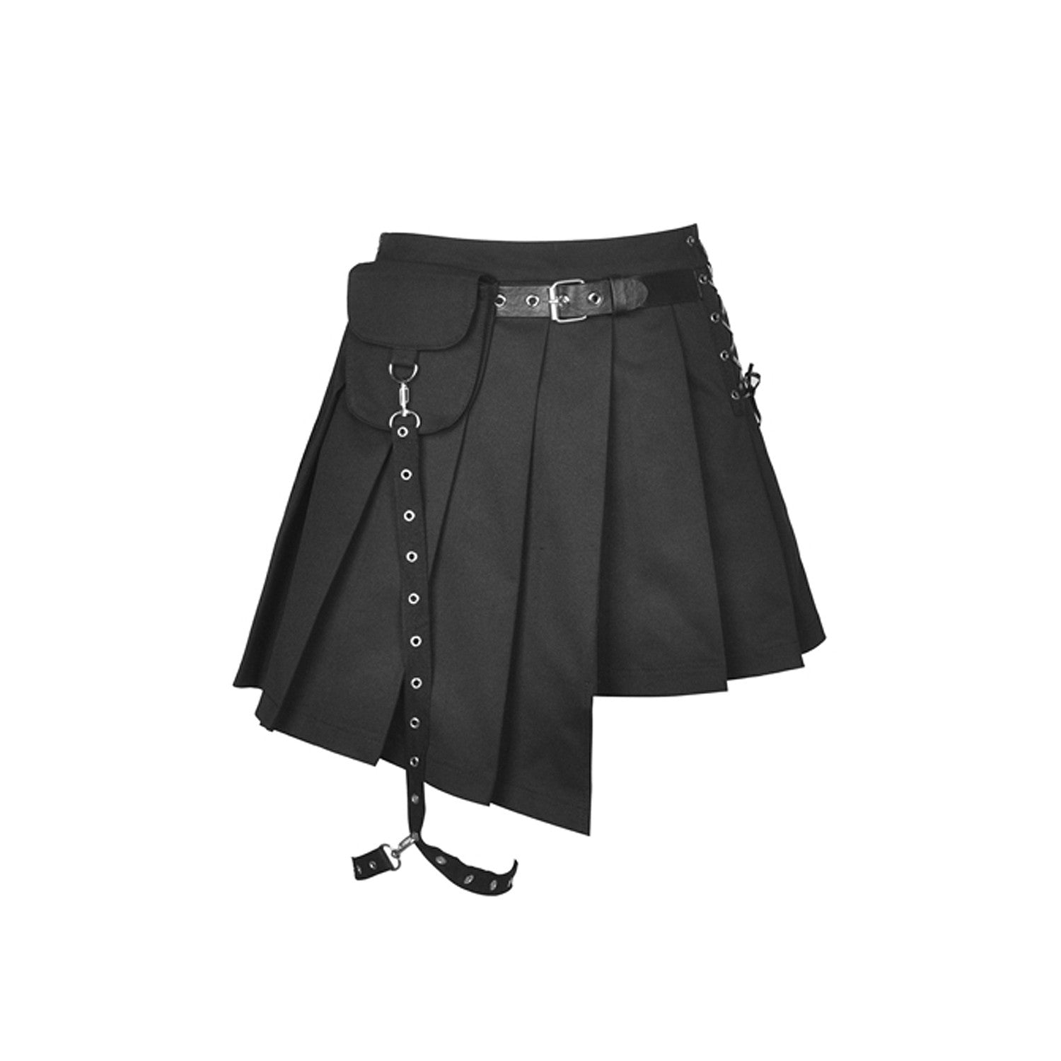 Short, black, asymmetrical, pleated skirt with a wrap style on one side and a garter belt on the other. It has a pocket and a belt buckle.