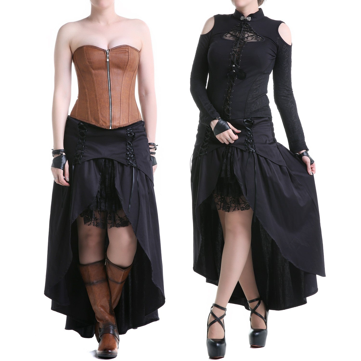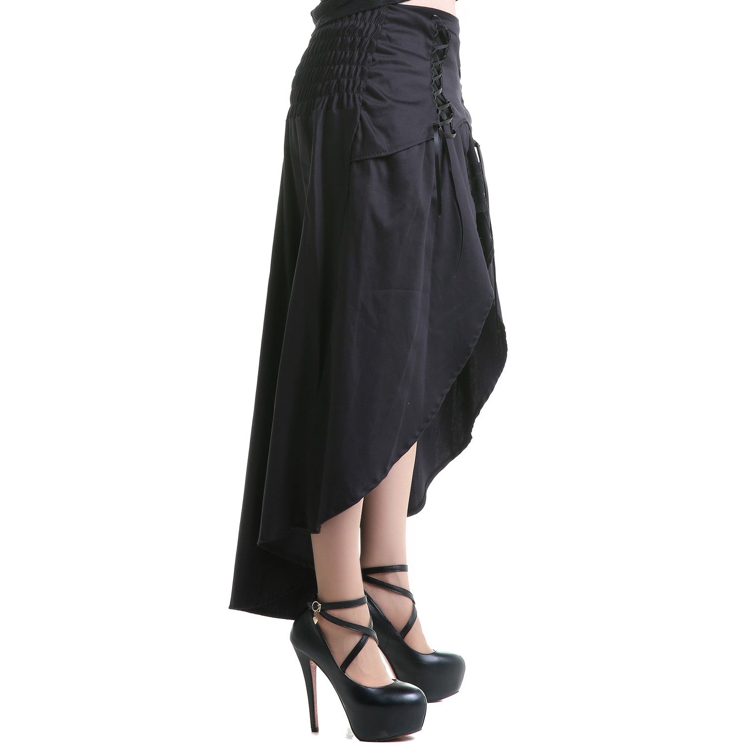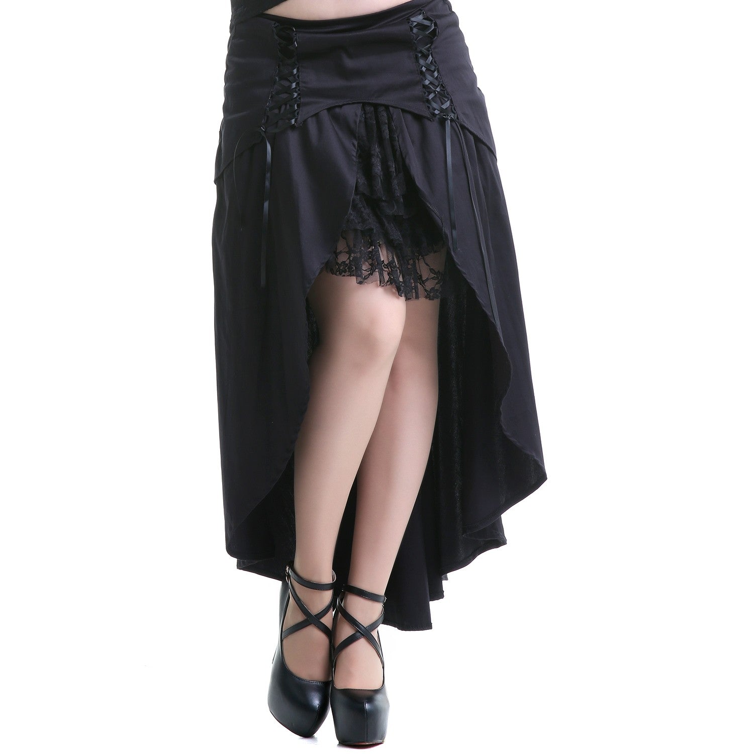 Black skirt with lace and a crossover front. Elasticated waist. Short in the front and long in the back.