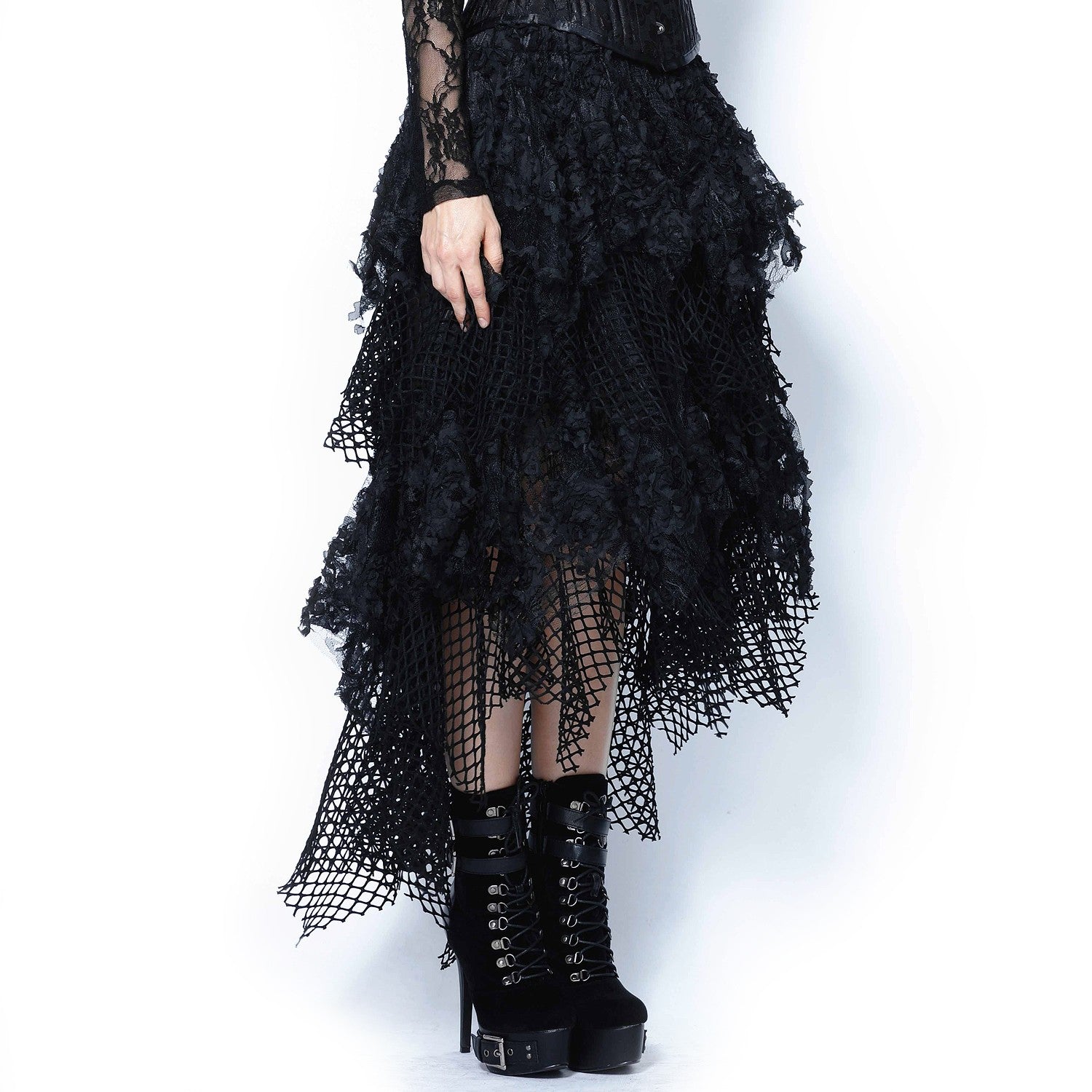 Asymmetrical black skirt with layers of mesh and lace. Elastic waist.