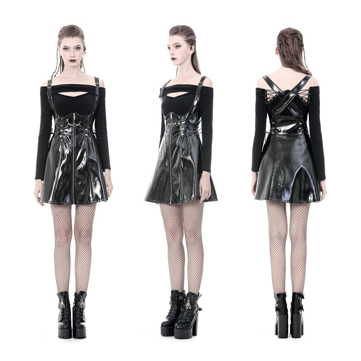 Short, black, shiny faux leather skirt with suspenders. Front zipper and buckle.