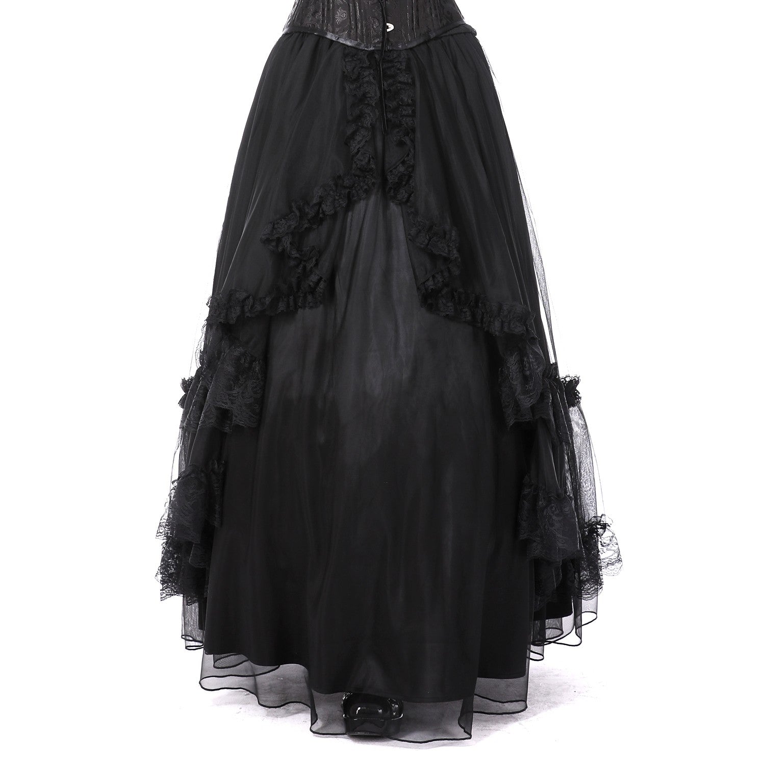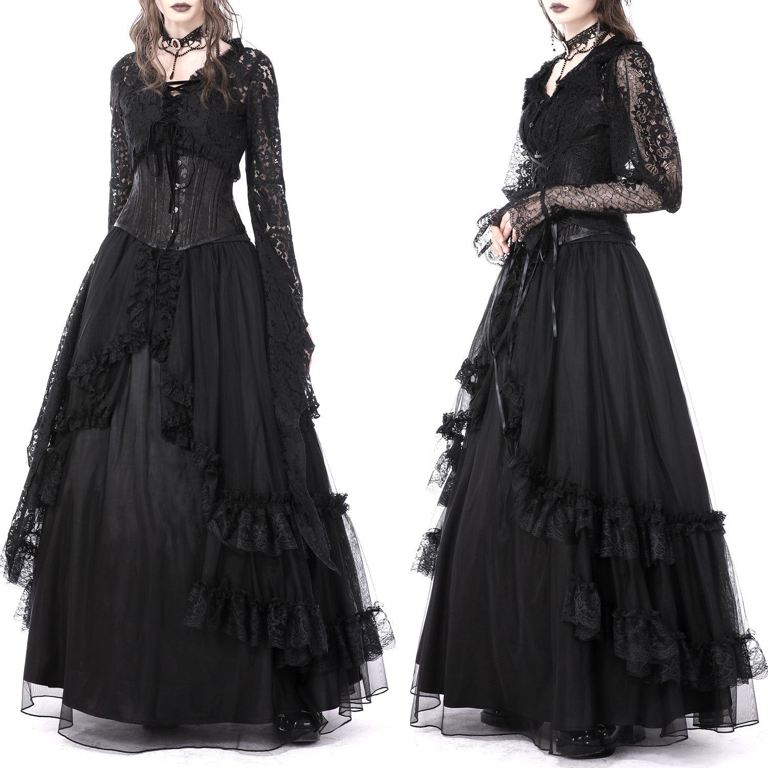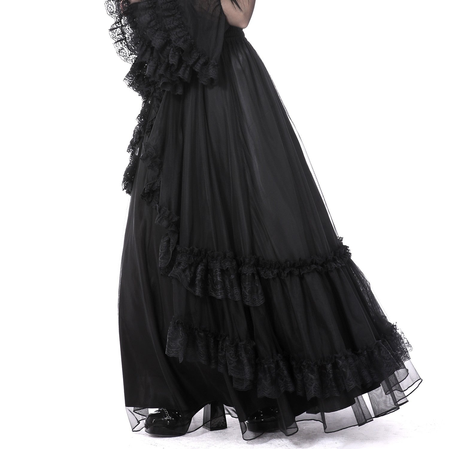 Discover our exquisite lace maxi skirt with delicate tulle details. Featuring an elastic waistband for a comfortable and versatile fit, this lace maxi skirt is ideal for showcasing your gothic and alternative style. Made from 100% polyester for long-lasting quality and unmatched comfort.