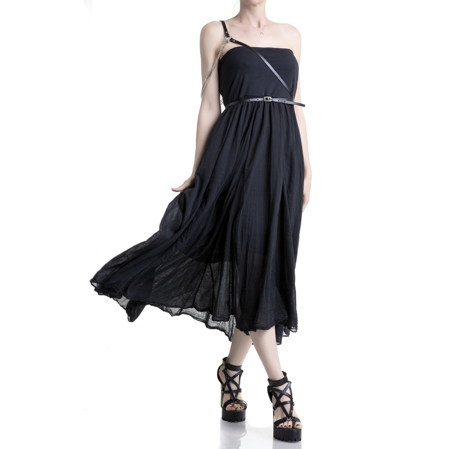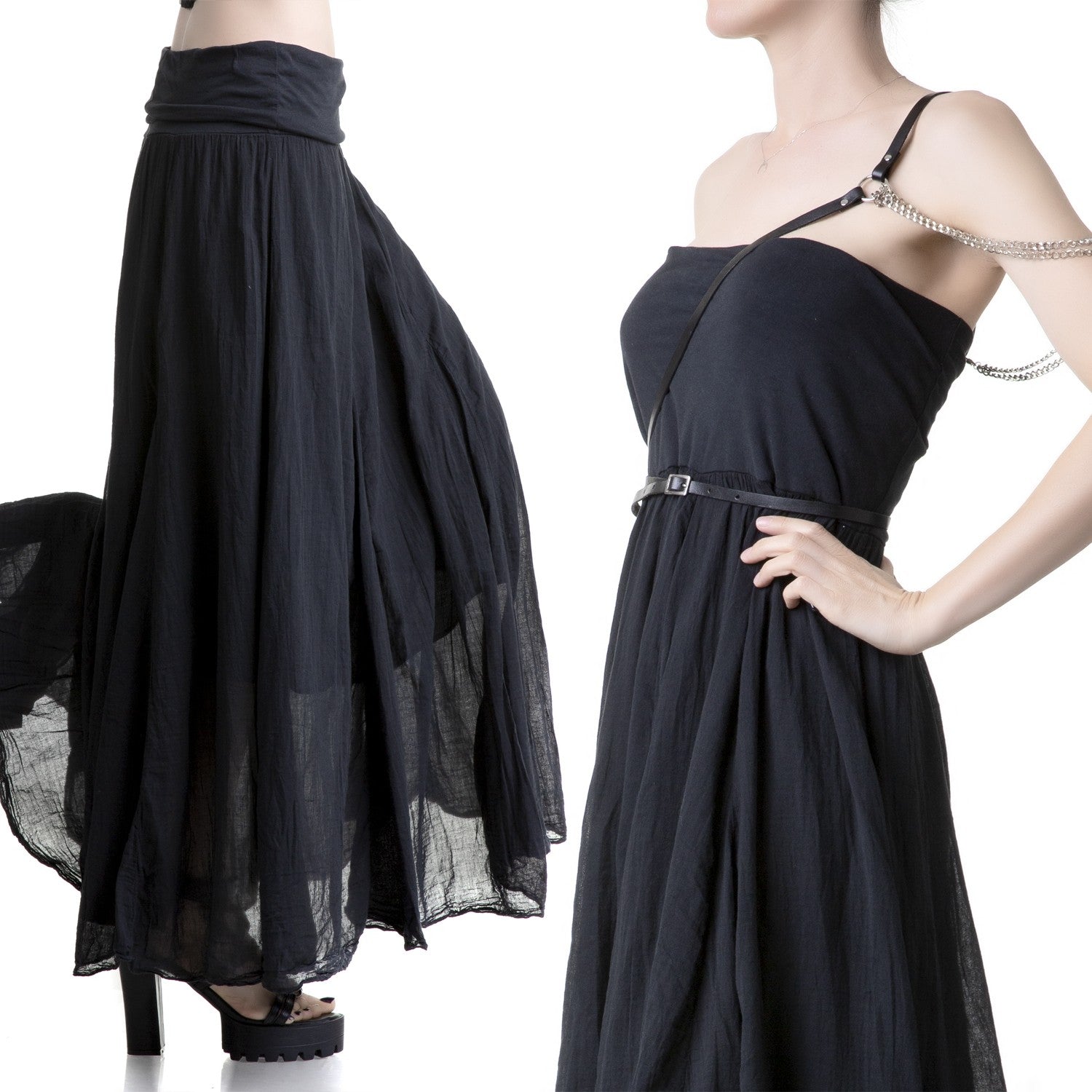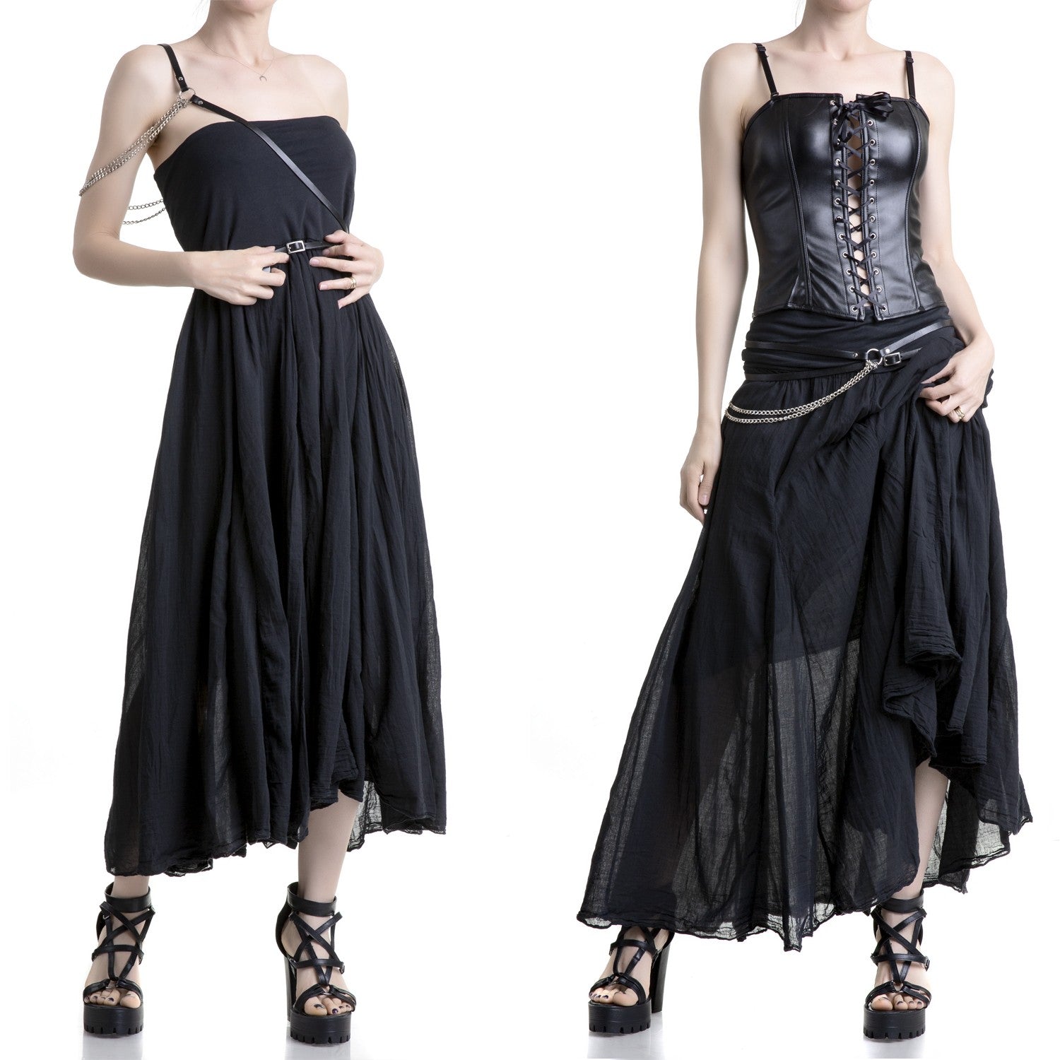Stand out in our versatile black maxi skirt, which can also be worn as a dress. Crafted with an elastic waistband for a comfortable and versatile fit, this black maxi skirt features a double-layered design that adds a unique touch to your goth, alternative, or punk style. Whether you wear it as a skirt or a dress, this versatile piece is a must-have for your alternative wardrobe.