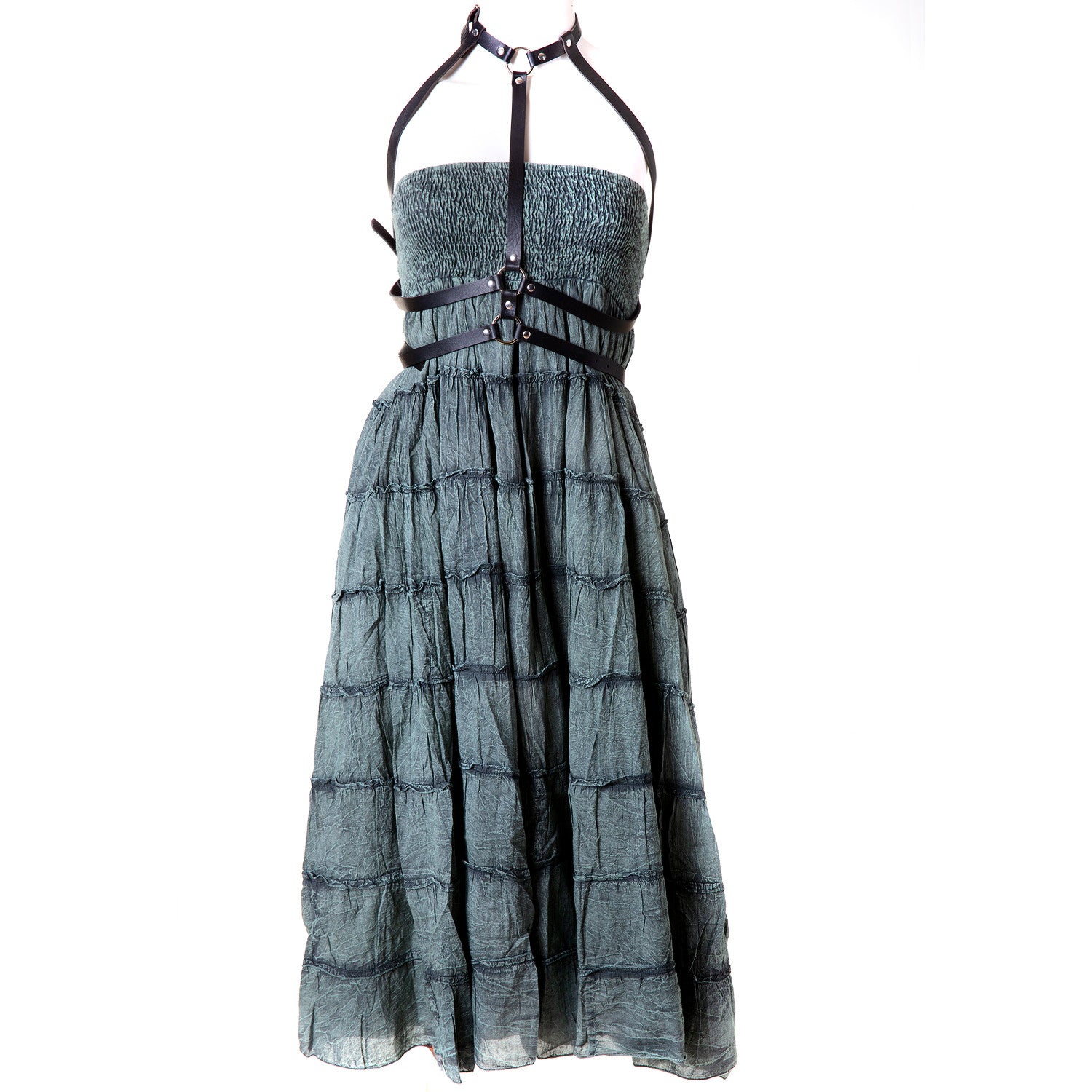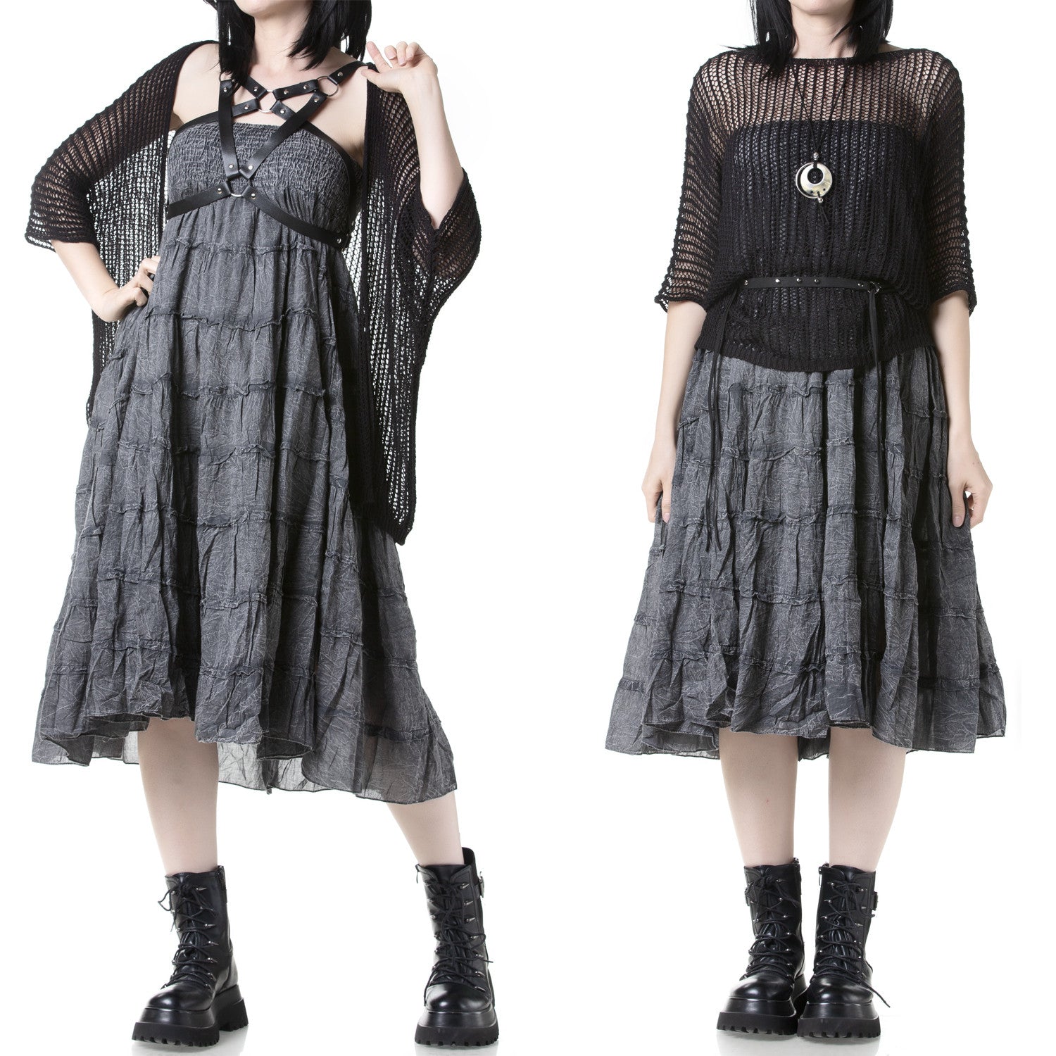 Discover the versatility of this long gray skirt made of fine fabric and elastic waistband. It can be worn as a dress, perfect for a gothic and alternative style. Composition of this long gray skirt: 100% cotton.