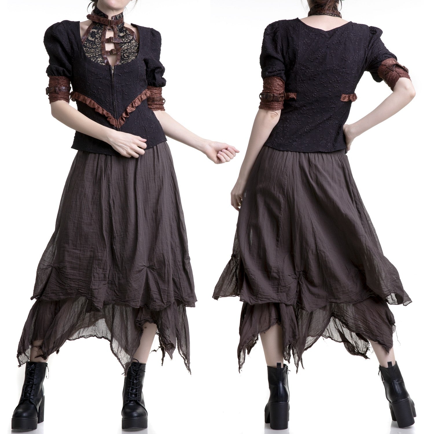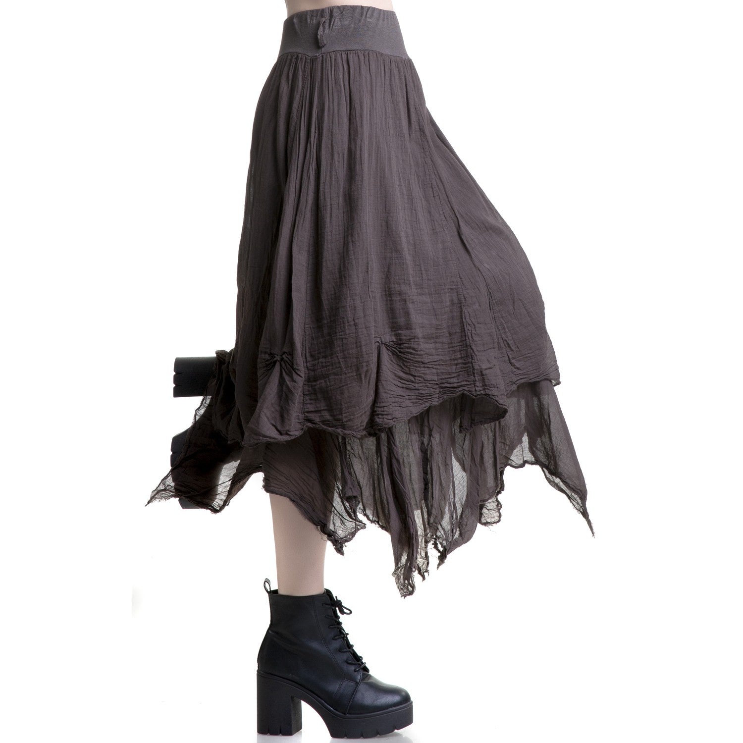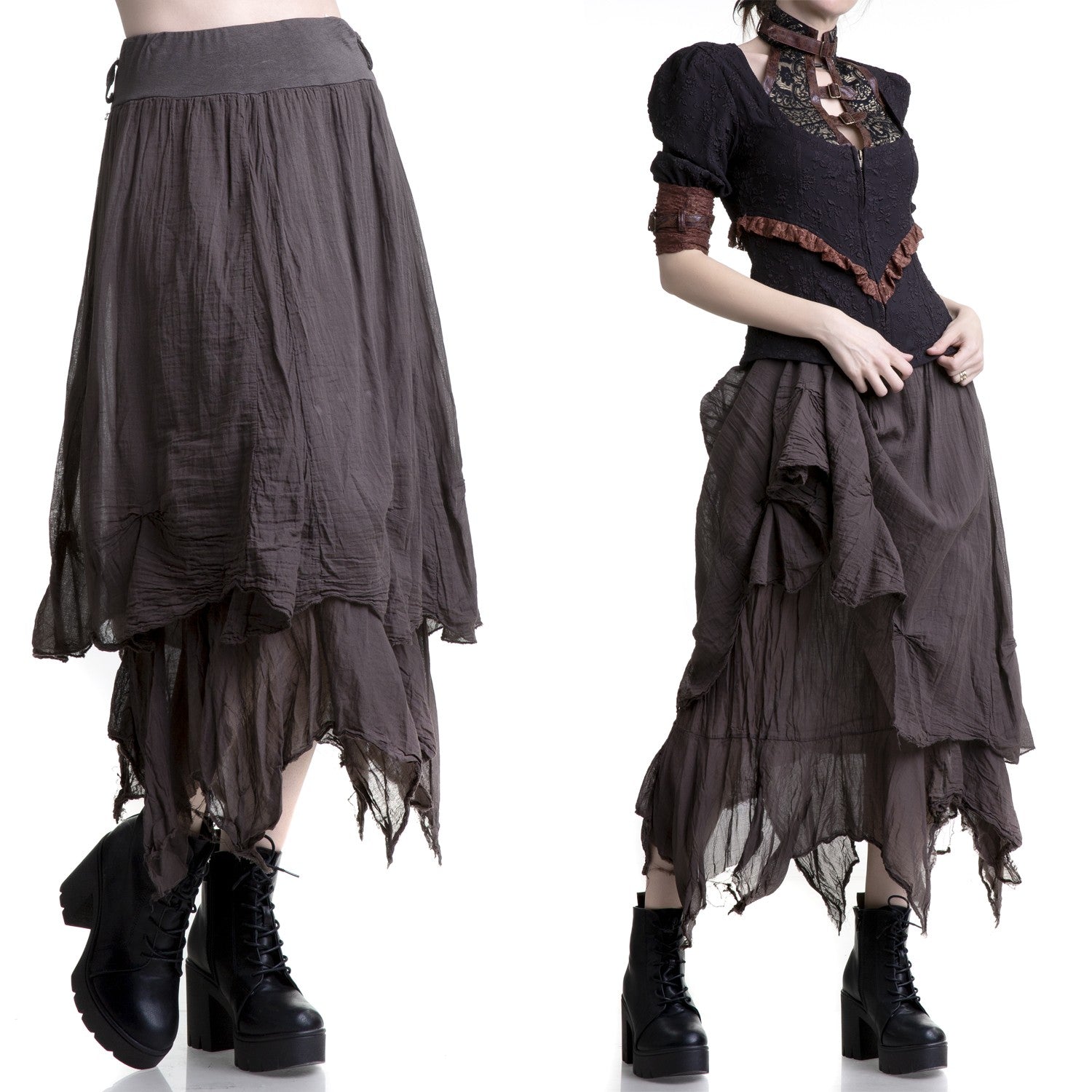 Long brown skirt with a pointed hem. It has a double layer and an elastic waistband with belt loops.