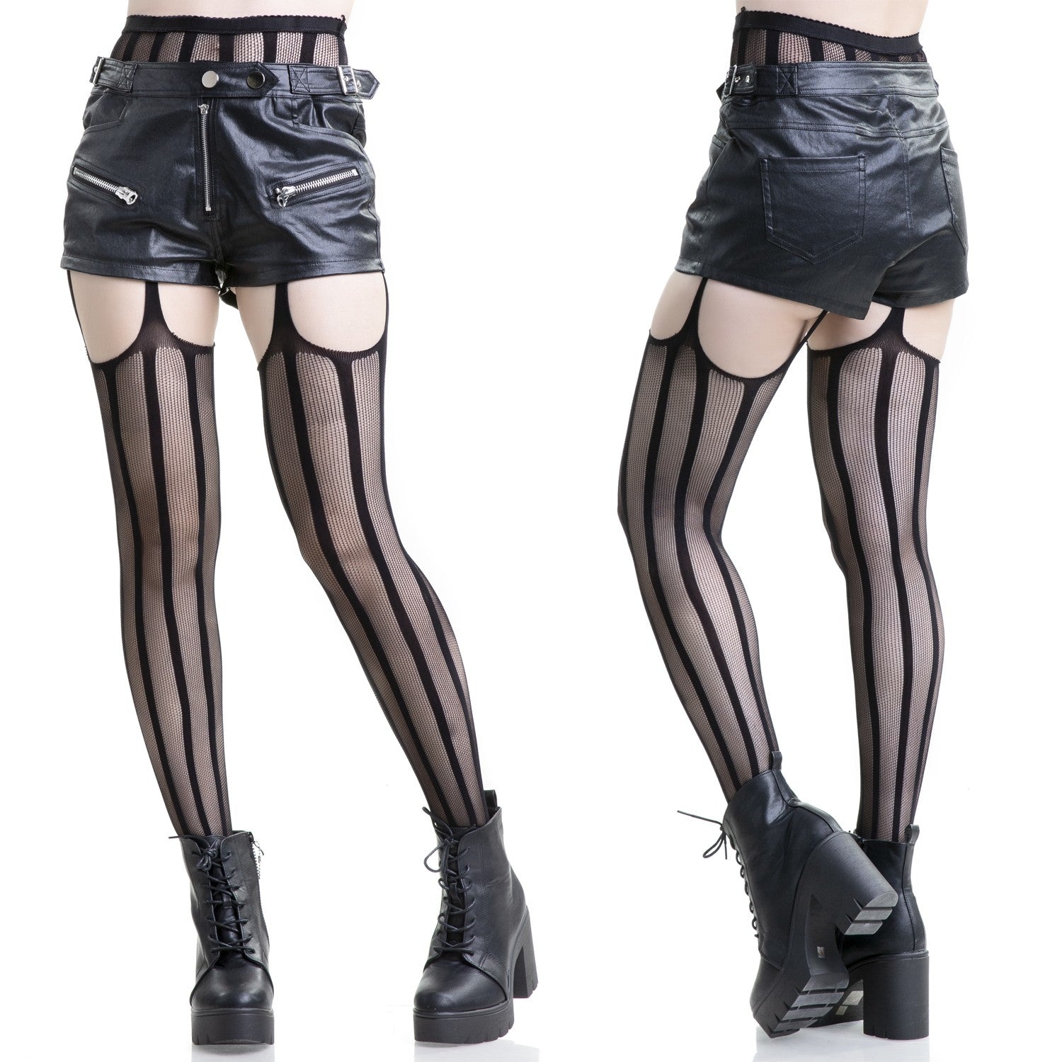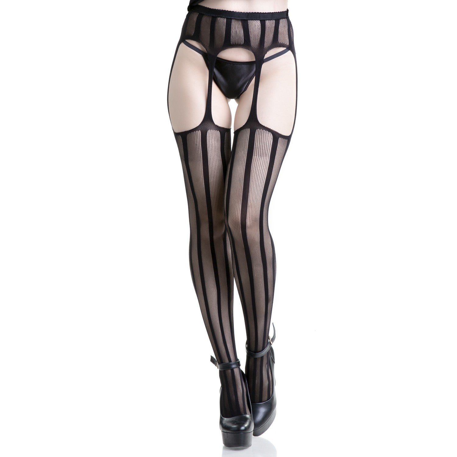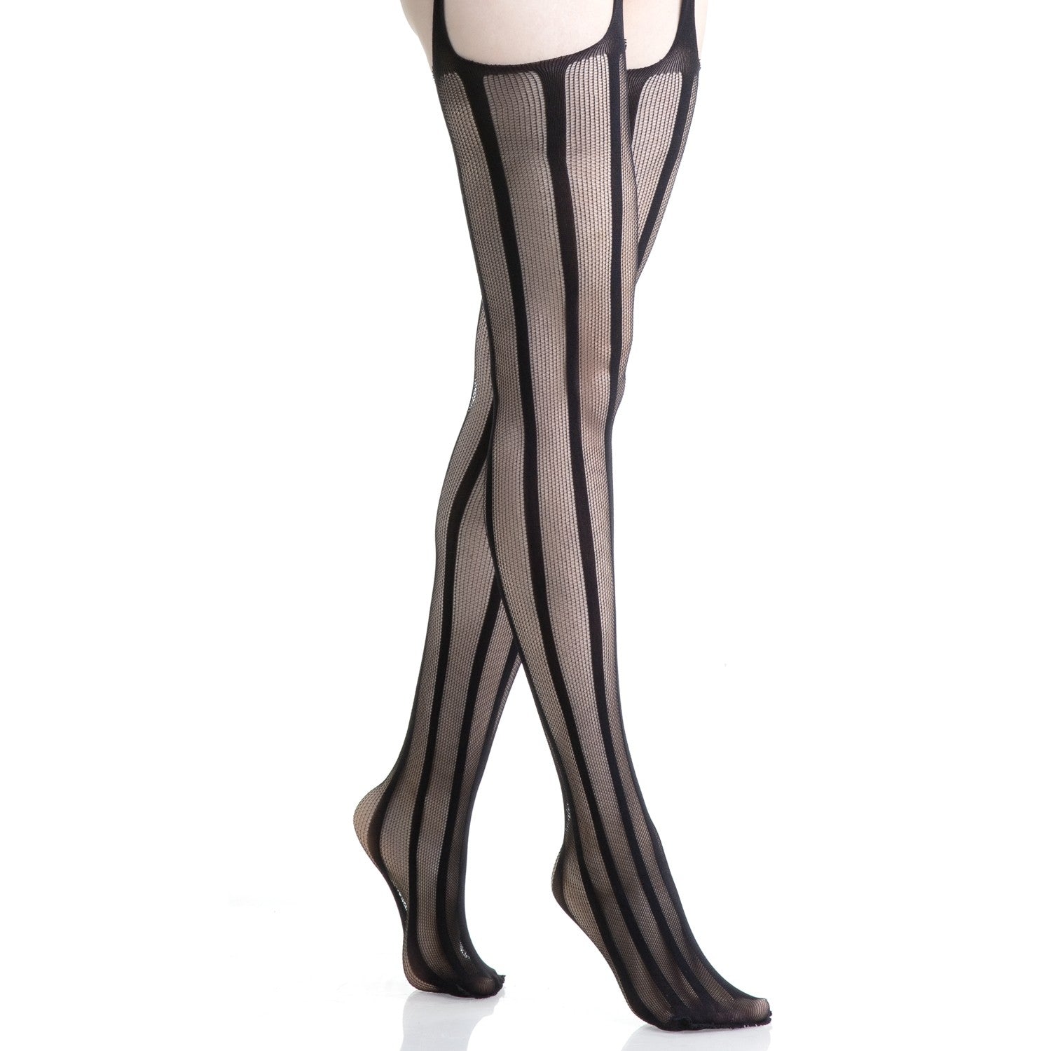 Black fishnet stockings with vertical stripes and a garter belt design.
