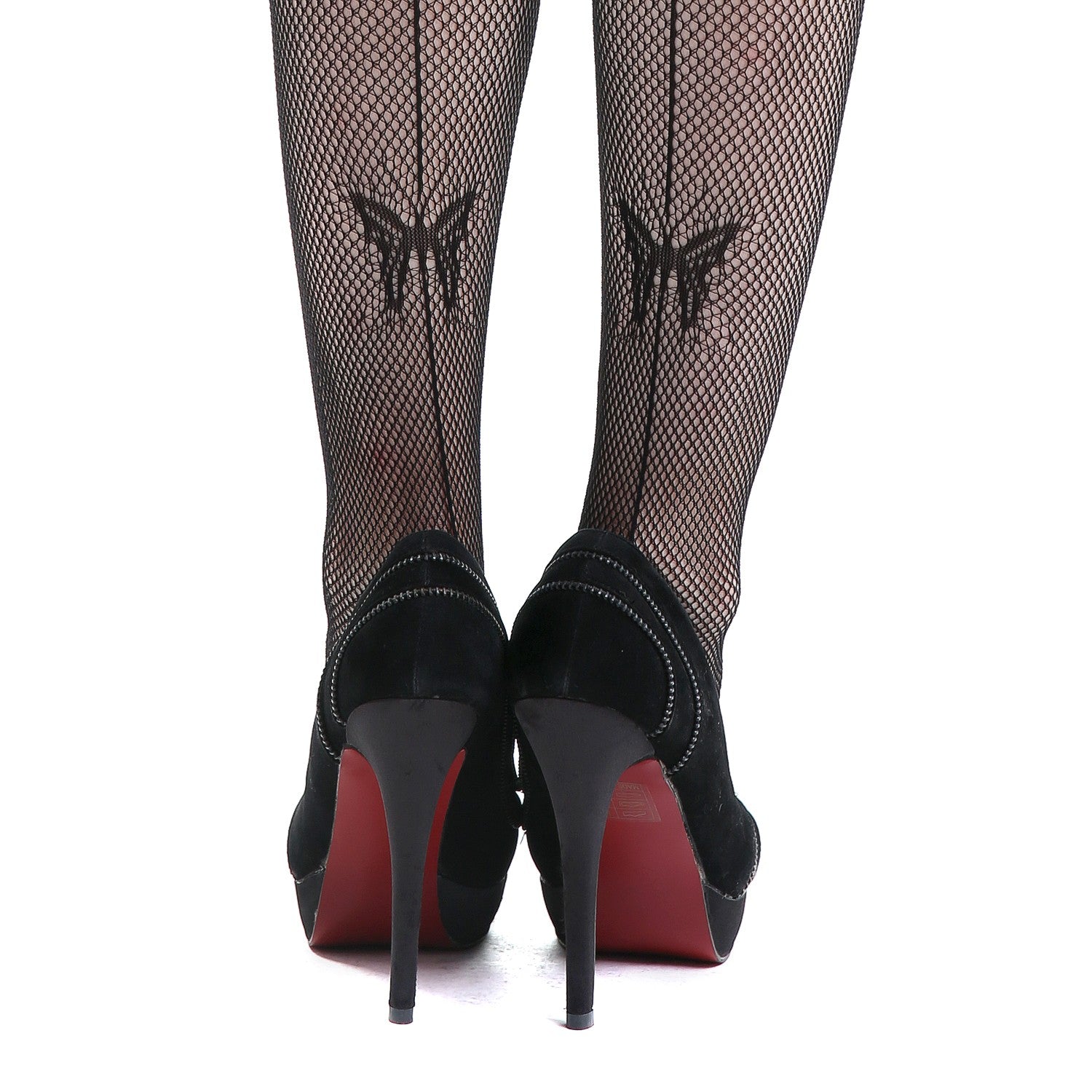 Black fishnet stockings with a butterfly above the ankle and a vertical black line behind.