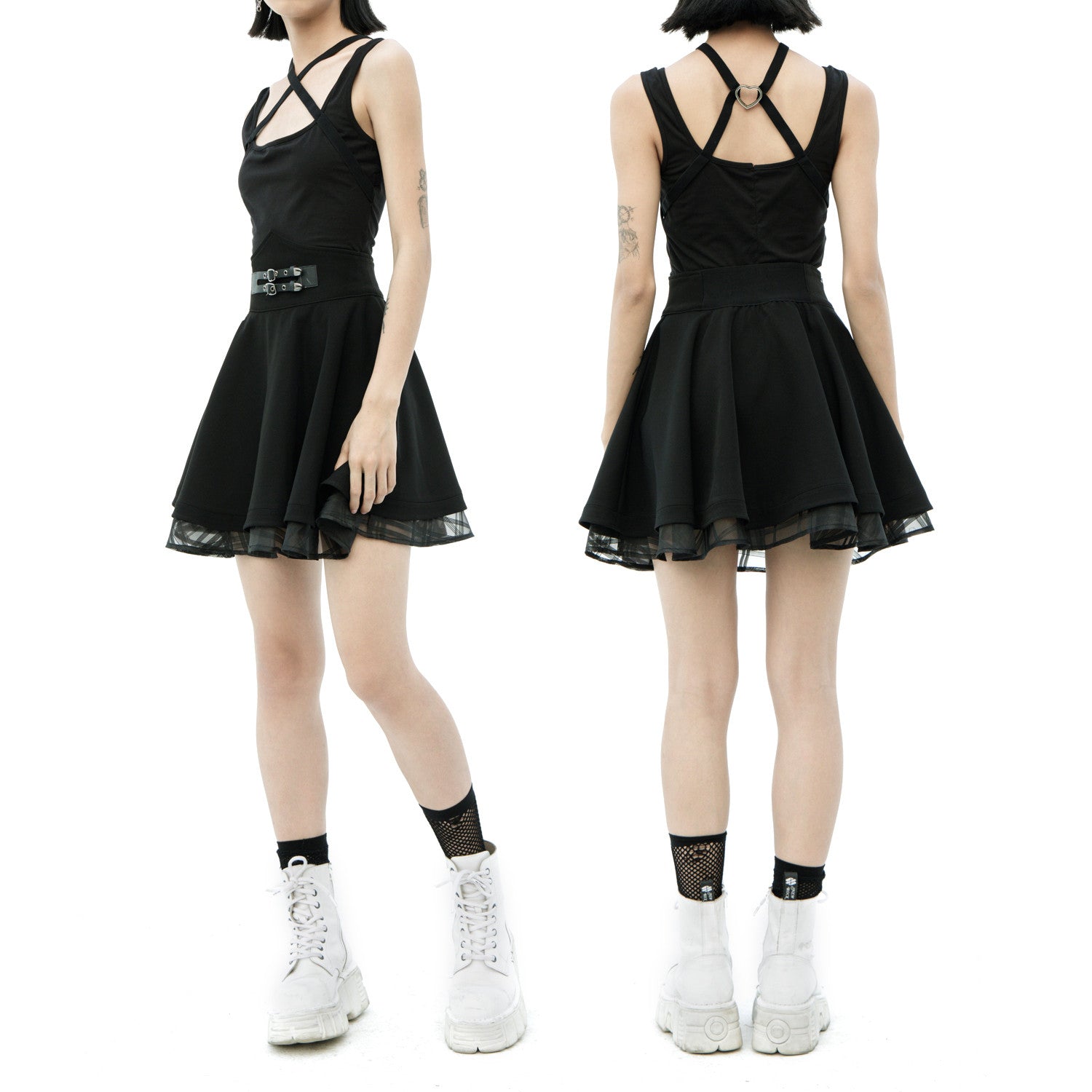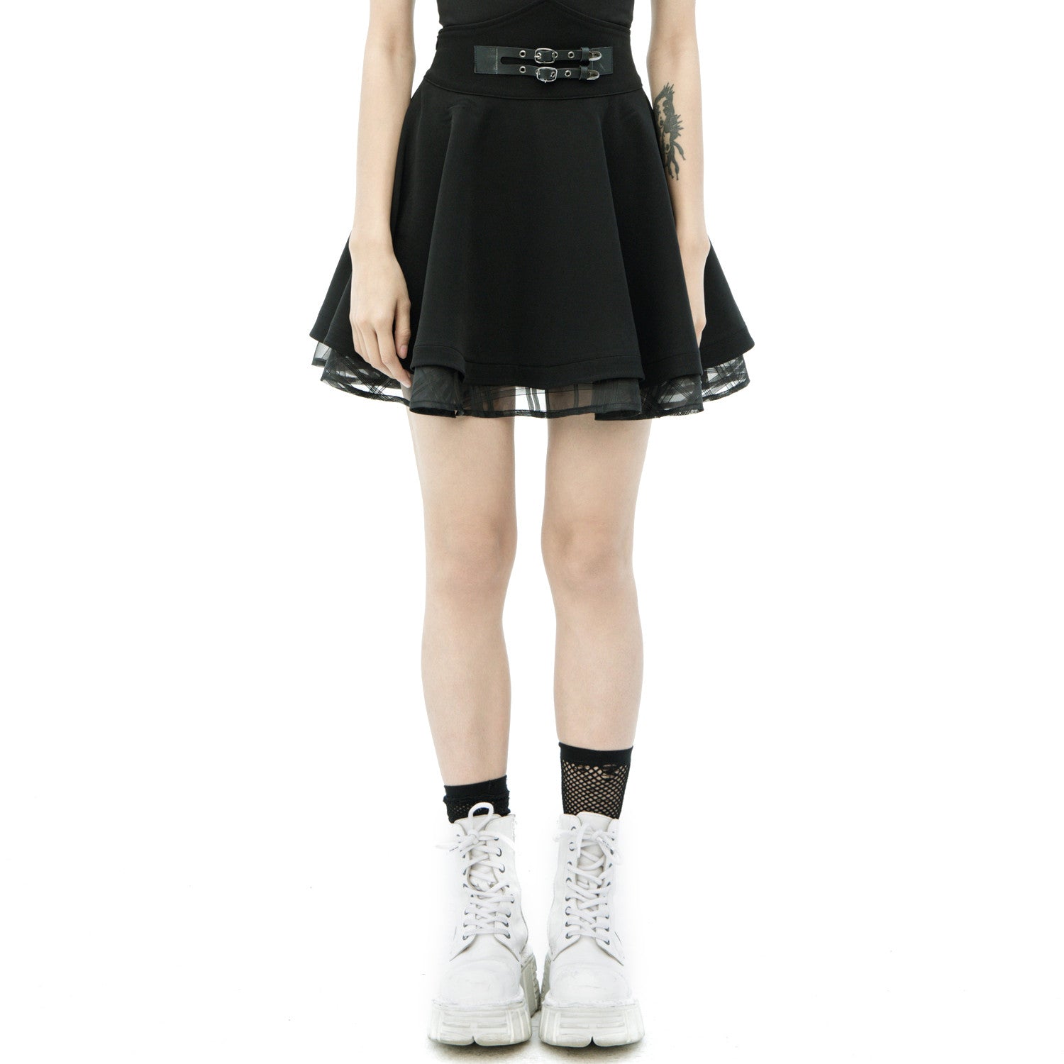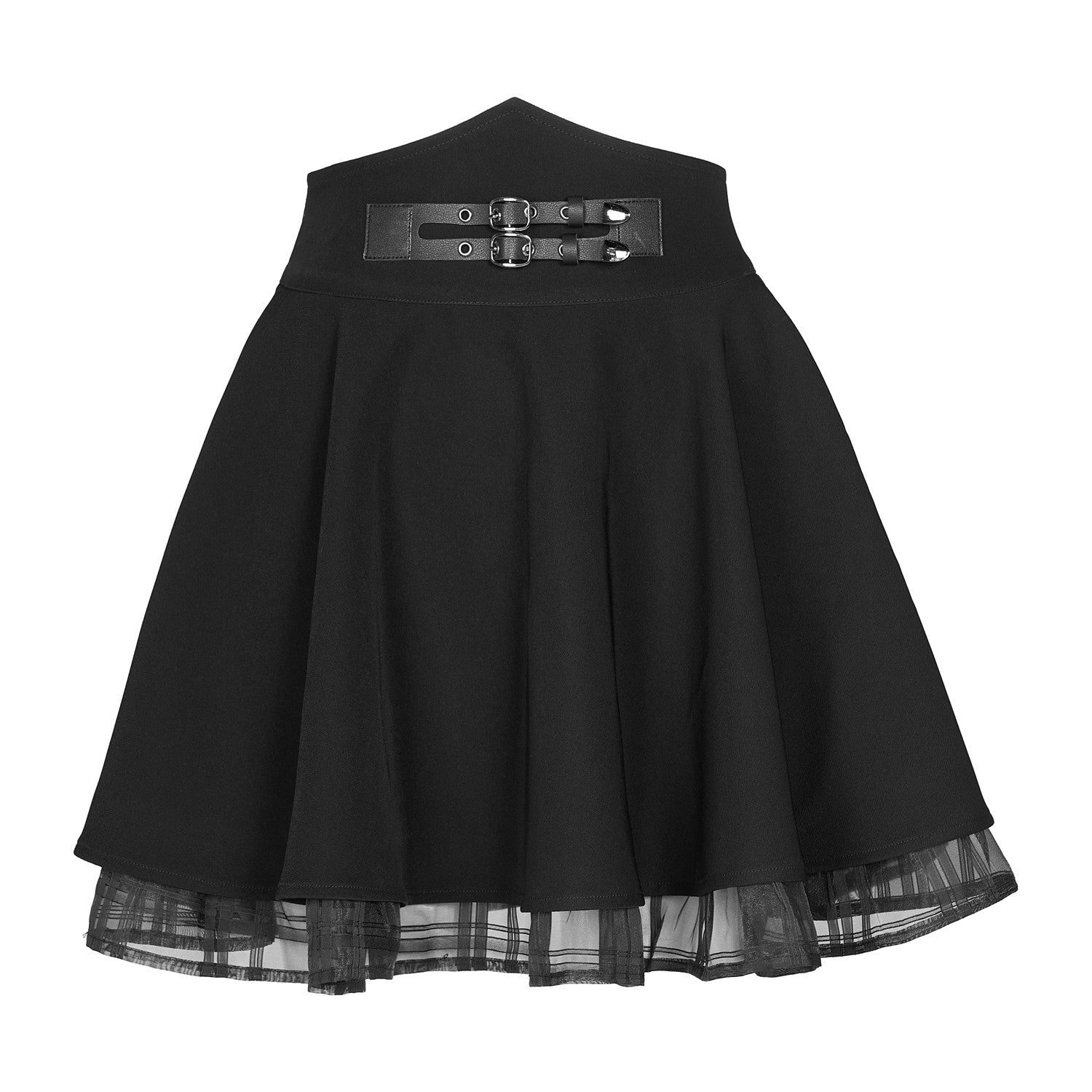Discover our incredible high-waisted black mini skirt with decorative buckles at the front and a tulle overlay! This skirt is perfect for lovers of gothic, alternative, and punk styles. Its elastic back ensures a comfortable and flattering fit. It's made from a combination of polyester and spandex, giving it a sleek, stretchy look. Don't miss the chance to add this fabulous skirt to your collection. Make a fashion statement with our exclusive high-waisted black mini skirt! Visit our online store for gothic, alternative, and punk clothing and accessories and explore our wide selection of high-quality, uniquely stylish garments.