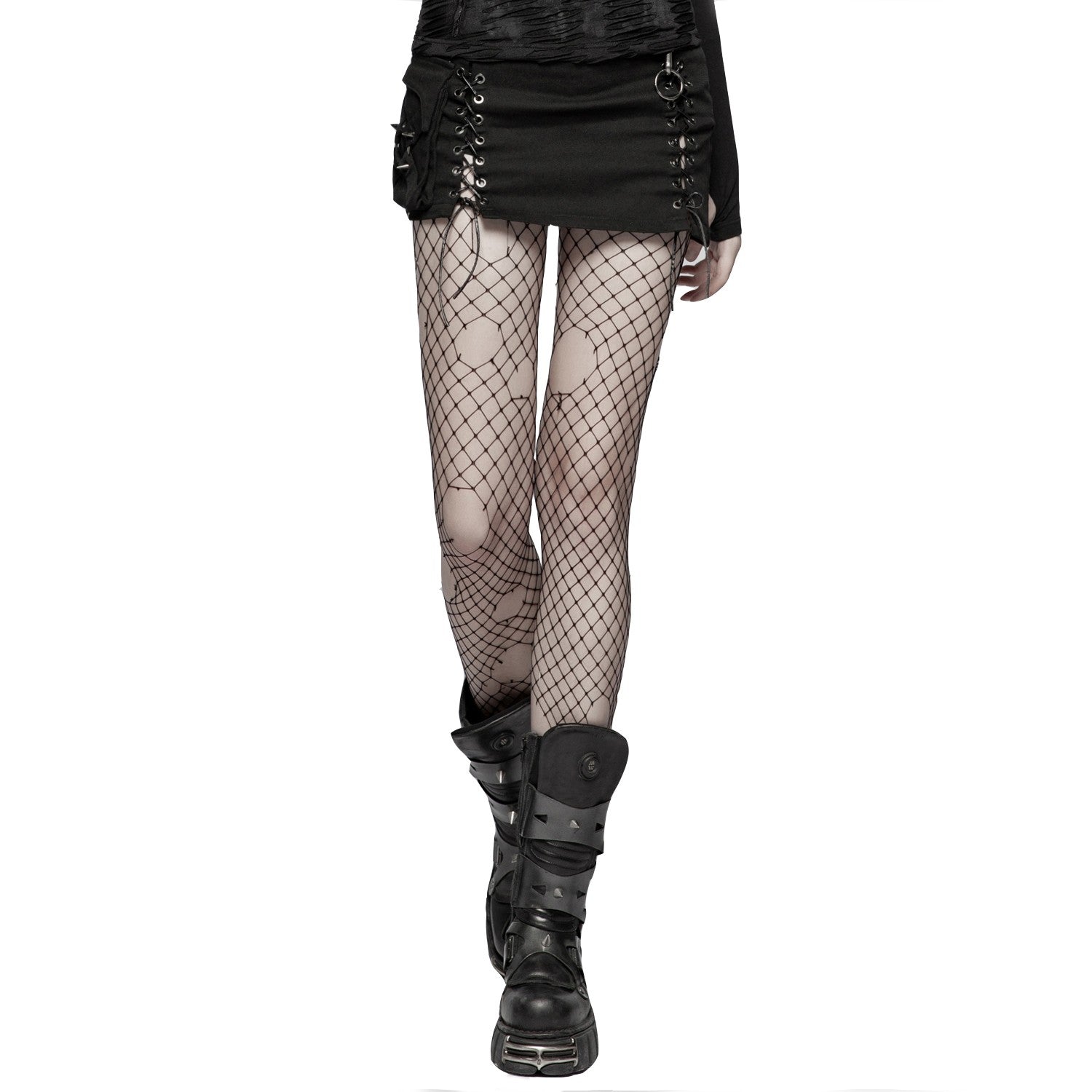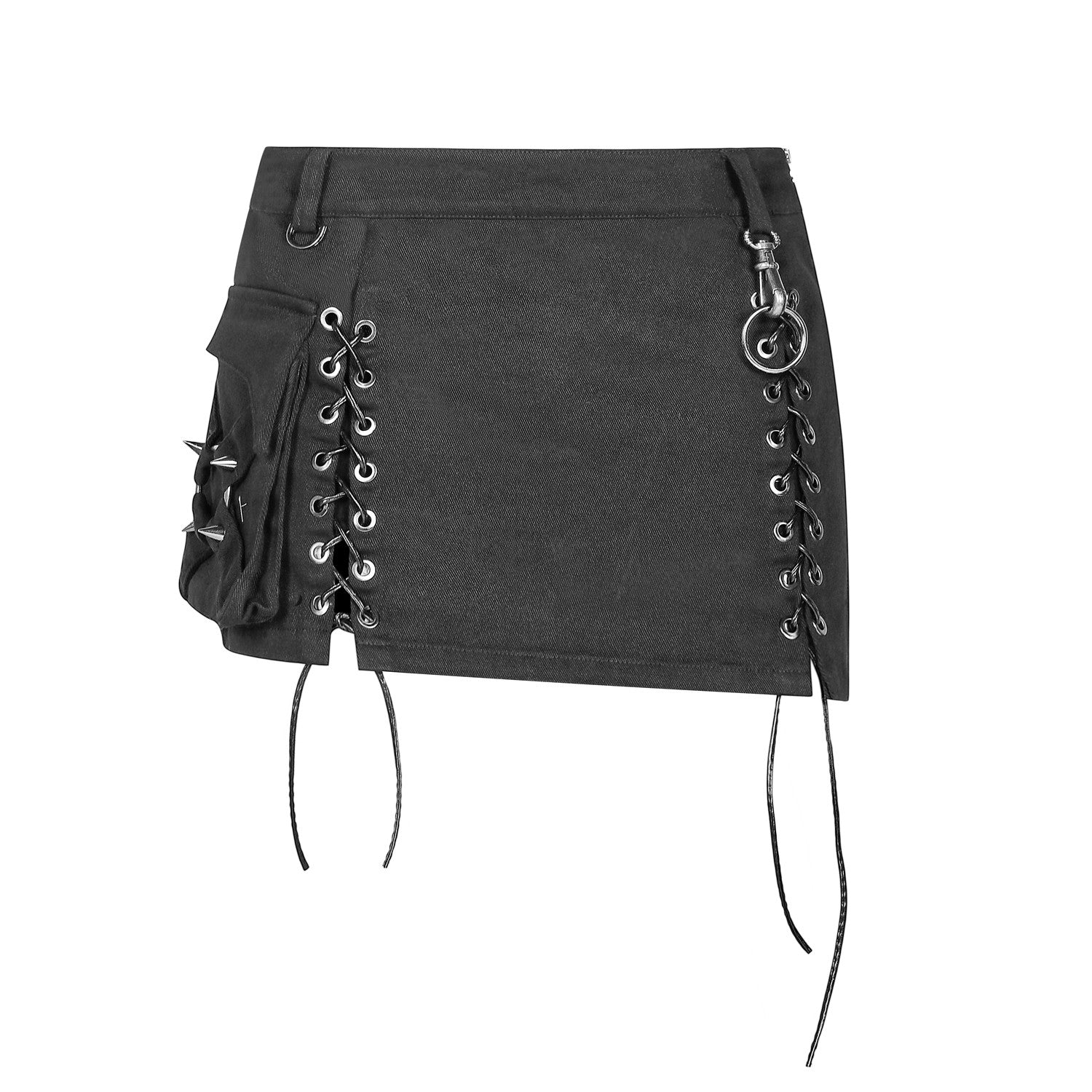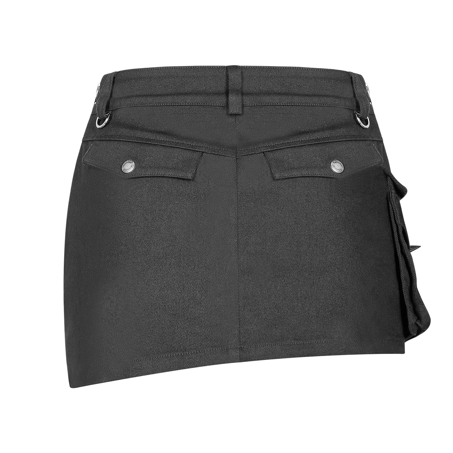 Black miniskirt with a crossover front and large side pocket. Asymmetrical cut.